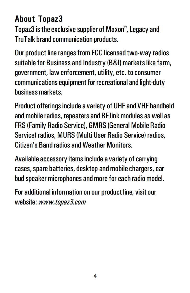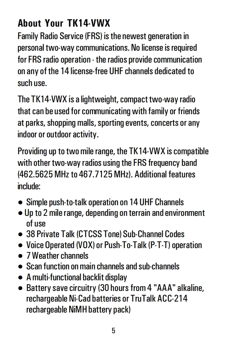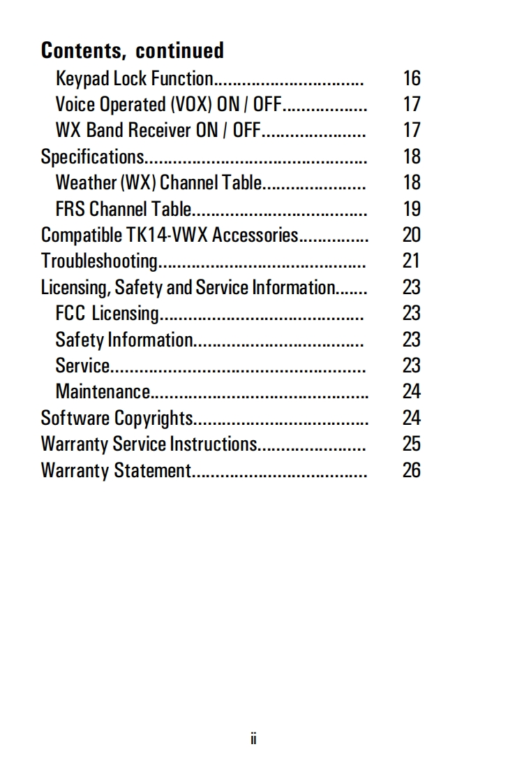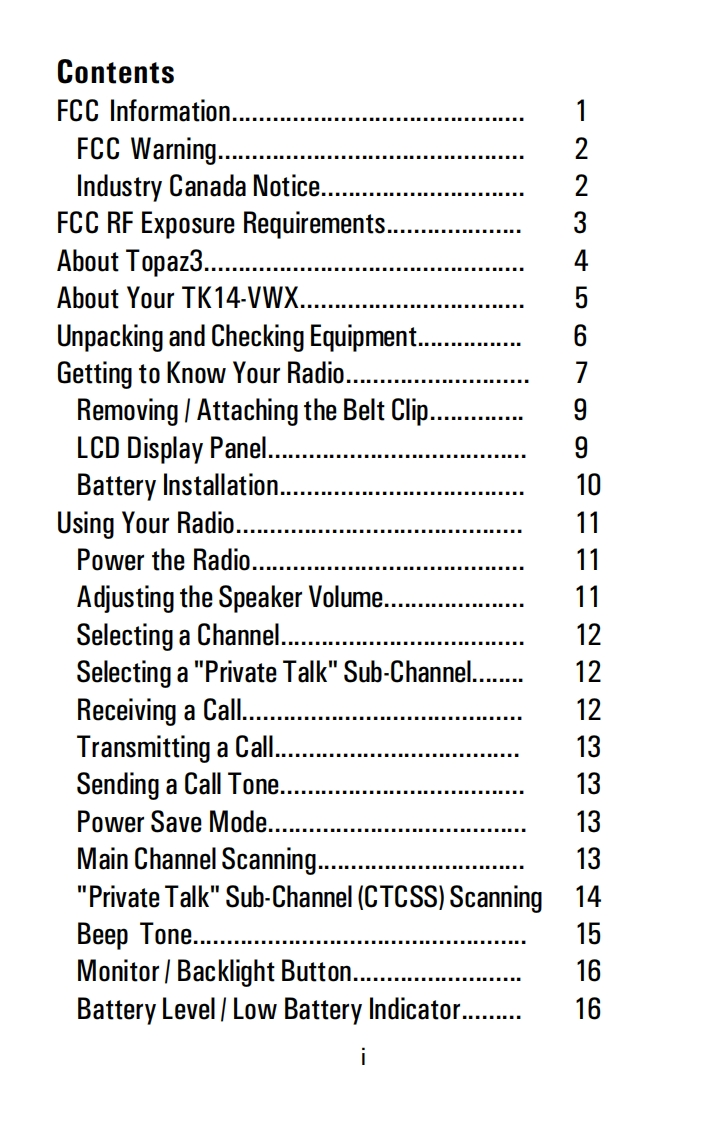 TK14VWX操作说明书手册找手册网31天前发布关注私信0.48MB64页040TK14VWX操作说明书手册此内容为付费资源,请付费后查看¥19¥21黄金会员免费钻石会员免费登录购买付费资源 第1页 / 共64页 第2页 / 共64页 第3页 / 共64页 第4页 / 共64页 第5页 / 共64页 第6页 / 共64页 第7页 / 共64页 第8页 / 共64页 第9页 / 共64页 第10页 / 共64页 试读已结束,还剩54页,您可下载完整版后进行离线阅读 THE END建武 文本预览 TALK((.by maxonTK14-VWXFRS (Family Radio Service)TWO-WAY RADIOOperating Instructions 查看更多 收起部分 喜欢就支持一下吧收藏