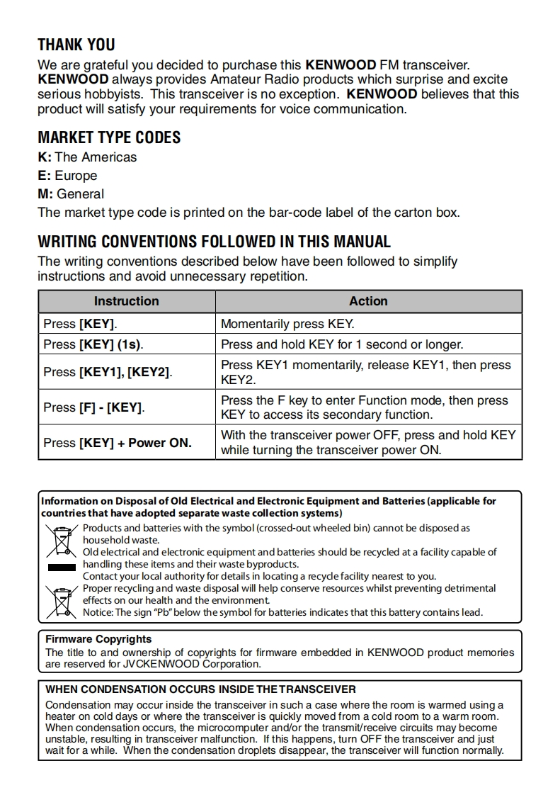 INSTRUCTION MANUALo900888KENWOOD144 MHz FM TRANSCEIVERTH-K20ATH-K20E430 MHz FM TRANSCEIVERTH-K40ATH-K40ENOTIFICATIONThis equipment complies with the essential requirements ofDirective 2014/53/EU.RestrictionsThis equipment requires a licence and is intended for use in thecountries as below.ATBEDKFIFRI DEGRISETLILUNLNOPTESSECHGBCYcZEEHULVLTMTPLSKSI BGRO HRTR1S03166JVCKENWOOD Corporation回回B62-2365-20(K,E,M