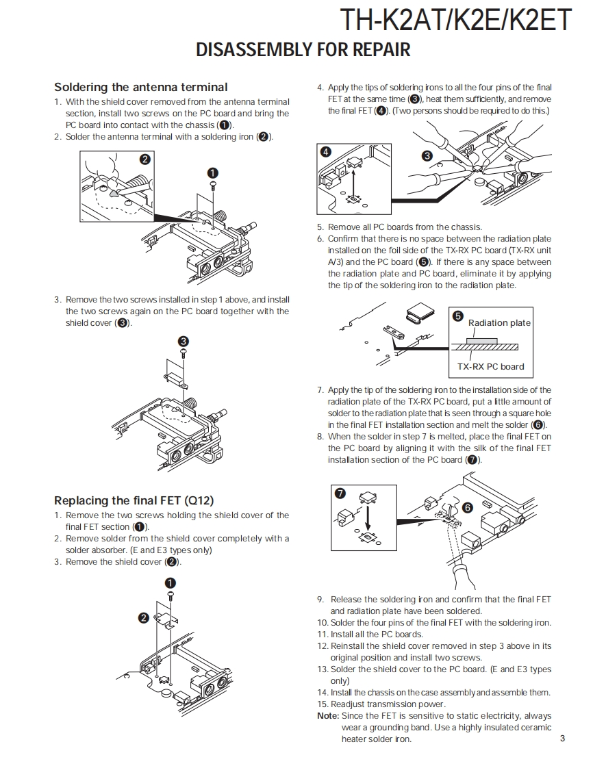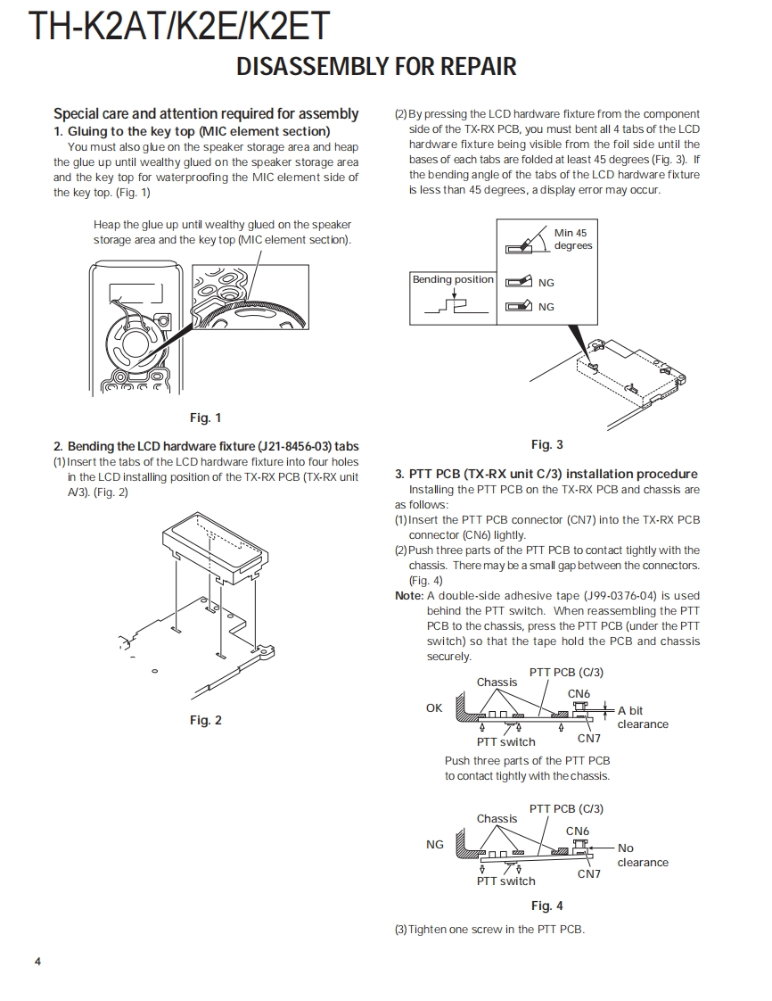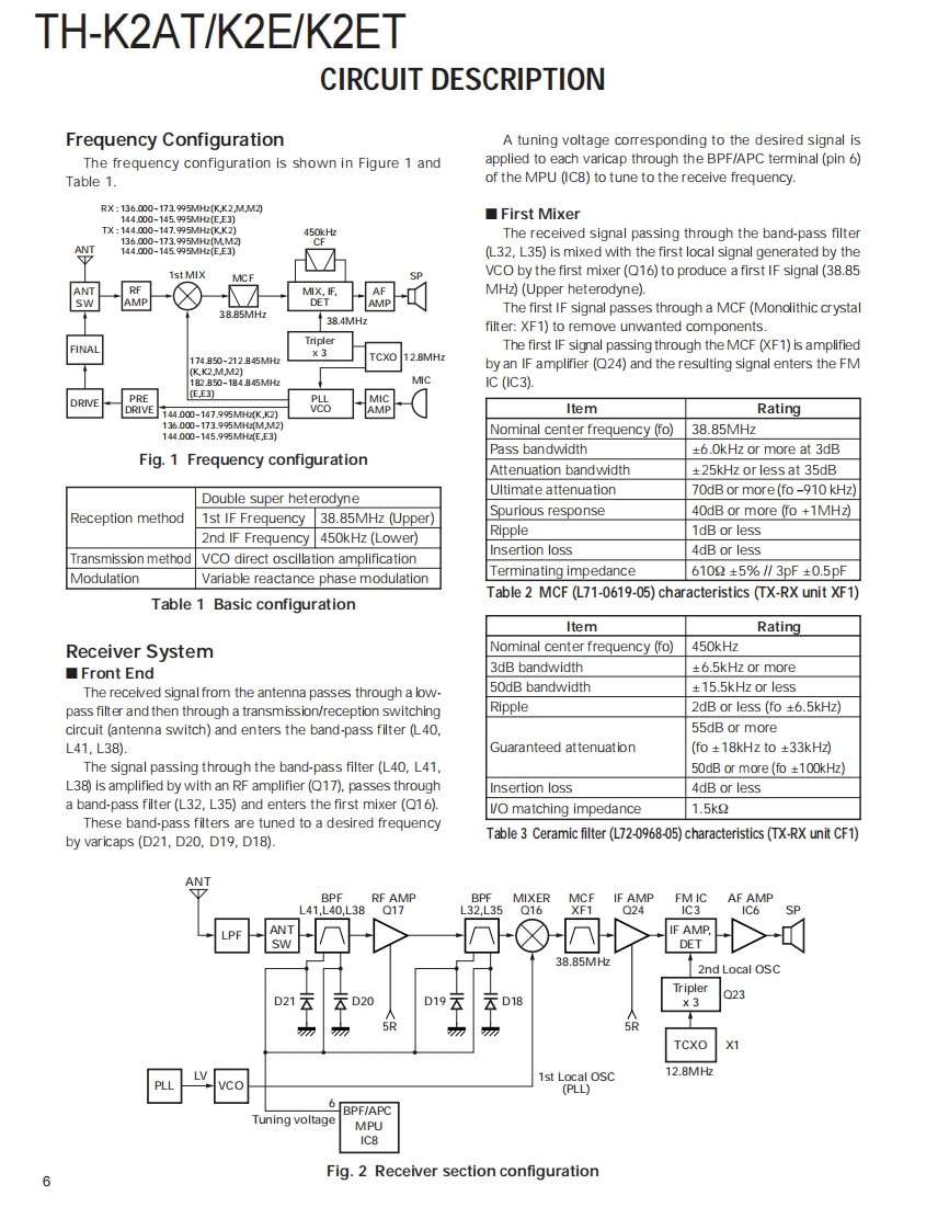 144MHz FM TRANSCEIVERTH-K2AT/K2E/K2ETKENWOODSERVICE MANUAL2003-8 PRINTED IN JAPANB51-8658-00(S)836Helical AntennaHelical Antenna(T90-1018-25(T90-1018-25Knob (ENC)Knob (ENC)(K29-5159-03)(K29-5159-03)Knob (VOL)Knob (VOL)K29-5150-03)(K29-5150-03)Front glassFront glassKnobB10-2746-03)Knob(B10-2746-03)(PTT/LAMP/MON)-(PTT/LAMP/MON)(K29-9274-03)KENWOODCap(K29-9274-03)KENWOODCap(SP/MIC/DC IN)9999(SP/MIC/DC IN)B09-0675-03)(B09-0675-03)Cabinet assyCabinet assy(16key)(4key)(A02-3819-23)Key top (4key)(A023818-23)123(K29-9276-02)Key top (16key)65B(K29-9272-02)B)9TH-K2AT/K2ETTH-K2ECONTENTSDISASSEMBLY FOR REPAIR.2SCHEMATIC DIAGRAM..........50CIRCUIT DESCRIPTION ........…6LEVEL DIAGRAM.55SEMICONDUCTOR DATA....................14BLOCK DIAGRAM.56COMPONENTS DESCRIPTION.....................15BC-21 (WALL CHARGER).............58PARTS LIST17PB-43N (Ni-MH BATTERY PACK)..............58EXPLODED VIEW….23BT-14 (BATTERY CASE)...............59PACKING.25PG-4Y (PROGRAMMING INTERFACE CABLE)......59ADJUSTMENT...27MCP-1A (MEMORY CONTROL PROGRAM)..........59TERMINAL FUNCTION......43SPECIFICATIONS......BACK COVERPC BOARDTX-RX UNIT (X57-674X-XX)(A/3).................4.4TX-RX UNIT (X57-674X-XX)(B/3),(C/3)..........48