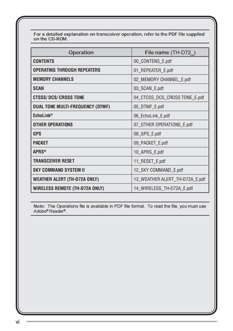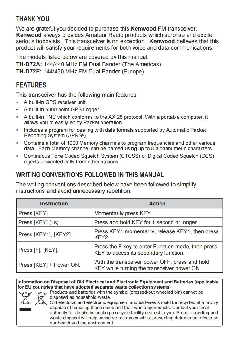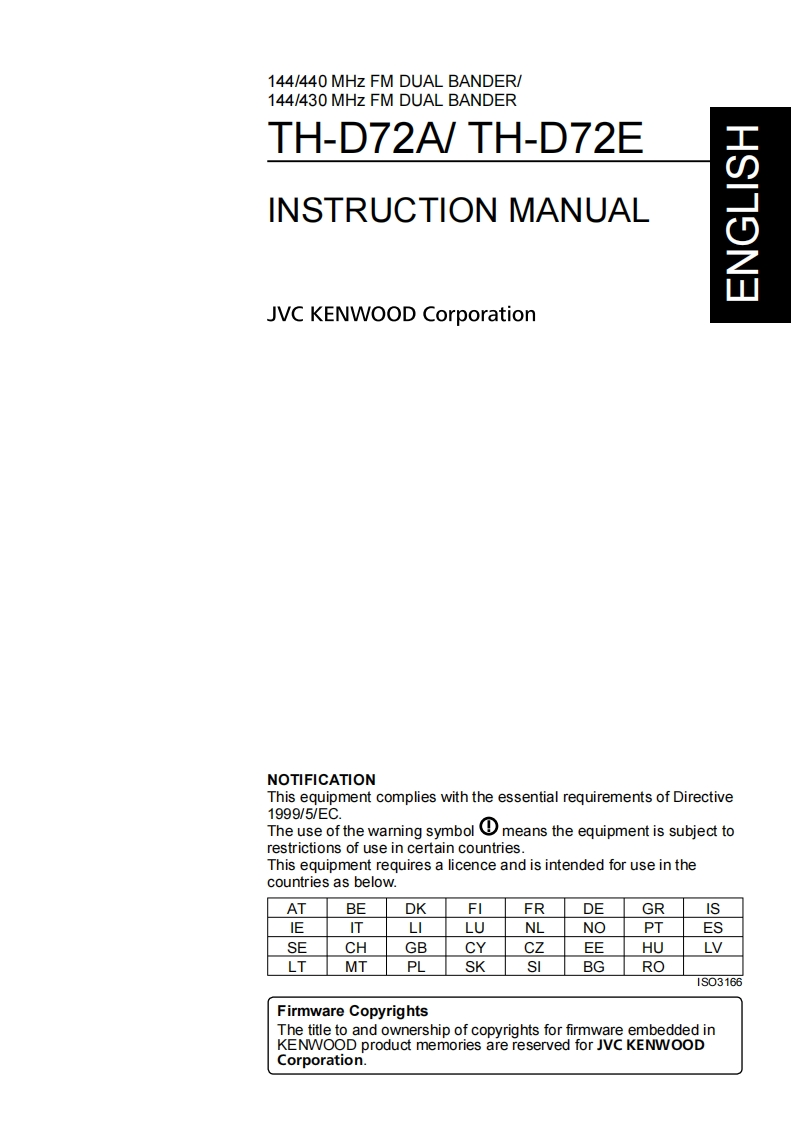 TH-D72A/TH-D72EKENWOODDATA144/440 MHz FM DUAL BANDER/144/430 MHz FM DUAL BANDERINSTRUCTION MANUAL144/440 MHz FM DOUBLE BANDE144/430 MHz FM DOUBLE BANDEMODE D'EMPLOIDOBLE BANDA DE 144/440 MHz EN FM/DOBLE BANDA DE 144/430 MHz EN FMMANUAL DE INSTRUCCIONESOnly basic operations are explained in this instruction manualFor a detailed explanation on the operations,refer to the PDF filesupplied on the CD-ROMSeules les fonctions de base sont expliquees dans ce moded'emploi.Pour le detail sur les autres operations,reportez-vousau fichier PDF a votre disposition sur le CD-ROMEn este manual de instrucciones solamente se explican lasoperaciones basicas.Si desea obtener una descripcion detalladade las operaciones,consulte el archivo PDF correspondienteincluido en el CD-ROM.JVC KENWOOD Corporation©B62-2235-20(K.E)0908070605040302(∈0682©