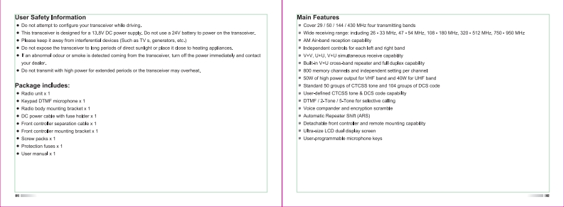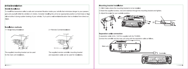 TH-9800 User ManualThank you vary much for choosing the TH-S00 quad band mobil tansceiver.The TH-9800 provides you with a relable,dear and ofciont communicaors sorvice which inenhanced by an erponomic design and intuitive user controls.Inherentty reliable you can depend on your TH-B600 no matier where you are in the harshMren单nrlThe TH-9800 is cost-otlectve.muls-functional and will moet al of your HF/VHFUHF bandcommunication needs no mater what the situation.For a ful explnsion of the many features.funcions and the care free maimenance of yournew mobile plere take the time to read the user manual endosed with your transceiver.