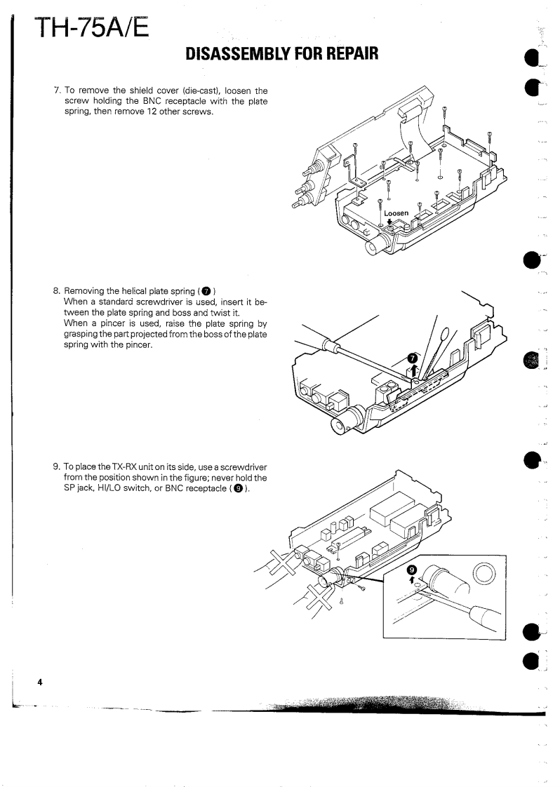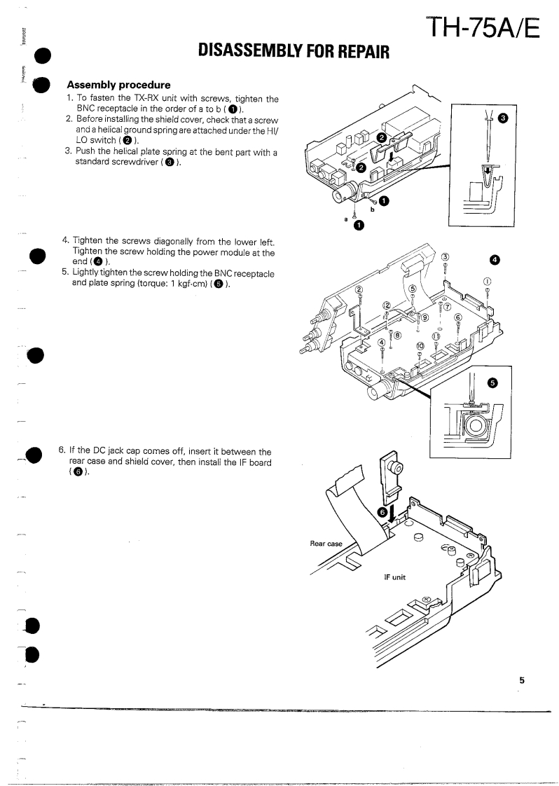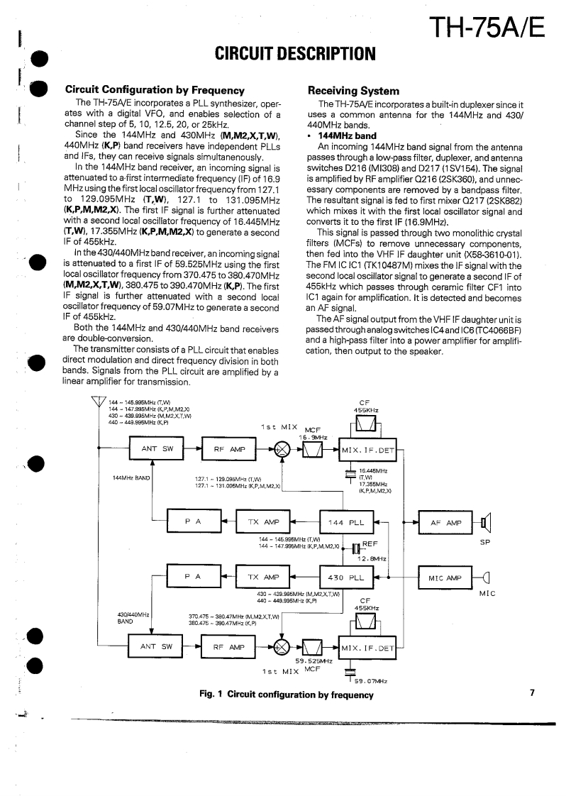 144/440(430)MHz FM DUAL BANDERTH-75A/EKENWOODSERVICE MANUAL1989-7 PRINTED IN JAPANB51-8012-0010)1349CONTENTSDISASSEMBLY FOR REAPIR.......AntennaCIRCUIT DESCRIPTION ............7(T90-0388-05SEMICONDUCTOR DATA............16DESCRIPTION OF COMPONENTS21PARTS LIST….24DISASSEMBLY................PACKING44Knob (VOL)ADJUSTMENT..45(K29-3096-14)×2PC BOARD VIEWS CIRCUIT DIAGRAMSUHF VC0X58-3590-00(U》Knob (SQL]Knob (ENCODER).50K29-3097-14)×2(K29-3098-04)VHF VC00X58-3590-000).511FX58-3610-XX……52MIC AMP(0X58-3620-XX.53CONTROL UNIT (X53-3200-XX).......54Knob (PTT)TX-RX UNIT (X57-3370-XX)(A/3)(C/3).........55(K29-3163-031TX-RX UNIT (X57-3370-XX)(B/3)..........57SCHEMATIC DIAGRAM.9BLOCK DIAGRAM.......6Case ass'y*LEVEL DIAGRAM......65{A02TERMINAL FUNCTIONS66Knob (RELEASE)(K29-3100-041BC-9(BATTERY CHARGER).,67BT-6(AAA MANGANESE/ALKALINE BATTERY CASE).67BC-10 (COMPACT CHARGER).........4…68Battery ass'yBC-11 (RAPID CHARGER)69W09-0507-05)HMC-2 (HEAD SET WITH VOX PTT)...............79PB-5/6/7/8/9 (Ni-Cd BATTERY).........81SC-22/23 (SOFT CASE)..........MB-5(MOBILE BRACKET).....83Photo is TH-75A.*Refer to parts list on page 25.WR-1(WATERPROOF CASE)83SMC-31/32(SPEAKER MICROPHONE).........8DangerTSU-6 (CTCSS UNIT)...........85Never attempt to disassemble the final module.SPECIFICATIONS..BACK COVERIt contains Berylium oxide.