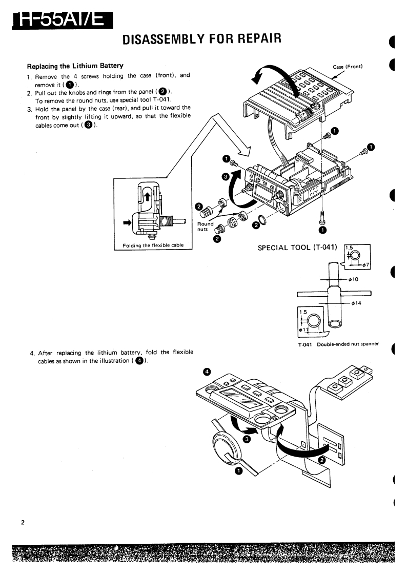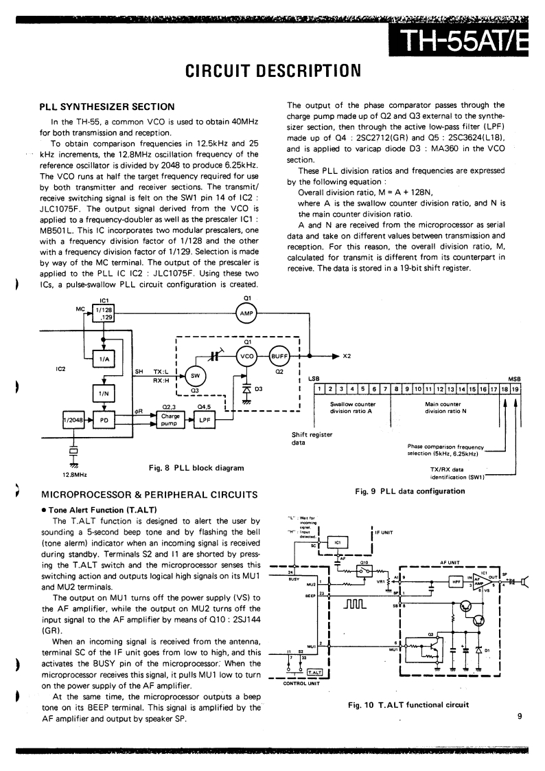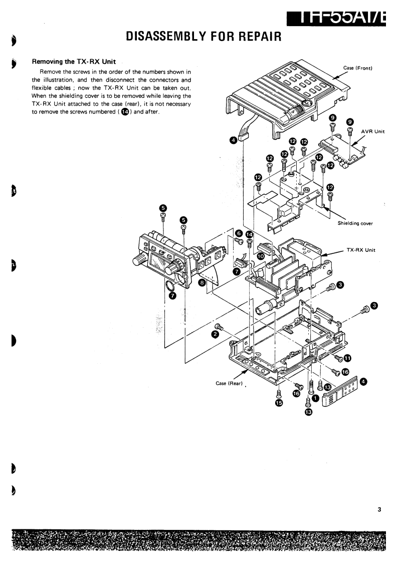 1H-55A1/ESERVICE MANUALC1988-2 PRINTED IN JAPANB51-3427-00(0)557040TCONTENTSDISASSEMBLY FOR REPAIR2CIRCUIT DESCRIPTIONSEMICONDUCTOR DATA11DESCRIPTION OF COMPONENTS..·.:·············PARTS LIST ......................................6DISASSEMBLY,30PACKING,……3ADJUSTMENT32PC BOARD VIEWS/CIRCUIT DIAGRAMAVR UN1T(X433020-11)....,·,361FUN1T(X58-3210-01)MIC AMP UNIT (X58-3370-XX)..318AF AMP UNIT (X58-3380-00)APC UN1T(X59-3420-00)40PLL UNIT(X58-3360-00)1VC0UN1T(X59-3470-00)...SWITCH UNIT (X41-3070-XX)..BPF UNIT(X59-3430-00)....4SIGNALING UNIT (X52-3130-00)KENWOODCONTROL UNIT (X53-3150-XX)45TX-RXUNT(X57-3250-XX)....······SCHEMATIC DIAGRAM.,,,·,,,·,······4BLOCK DIAGRAM1LEVEL DIAGRAM.TERMINAL FUNCTIONS..53BC-9(BATTERY CHARGER)BC-10(COMPACT CHARGER)BC-11 (RAPID CHARGER).....,55BT-6(AAA MANGANESE/ALKALINE BATTERY CASE)6DC-1 (DC ADAPTER).....HMC2 HEAD SET WITH VOX&PTT)...·.··,···66PB-5/6/7/8/9(Ni-Cd BATTERY).......·.··.,6SC-17/18/19S0 FT CASE).............········SMC-31(SPEAKER MICROPHONE),.·,······7TSU-6 (CTCSS UNIT).................................MB-5(MOBILE BRACKET).··········73WR-1(WATERPROOF CASE)···.·············73SPECIF1 CATIONS,,......···,,,BACK COVERPhoto is TH-55AT.