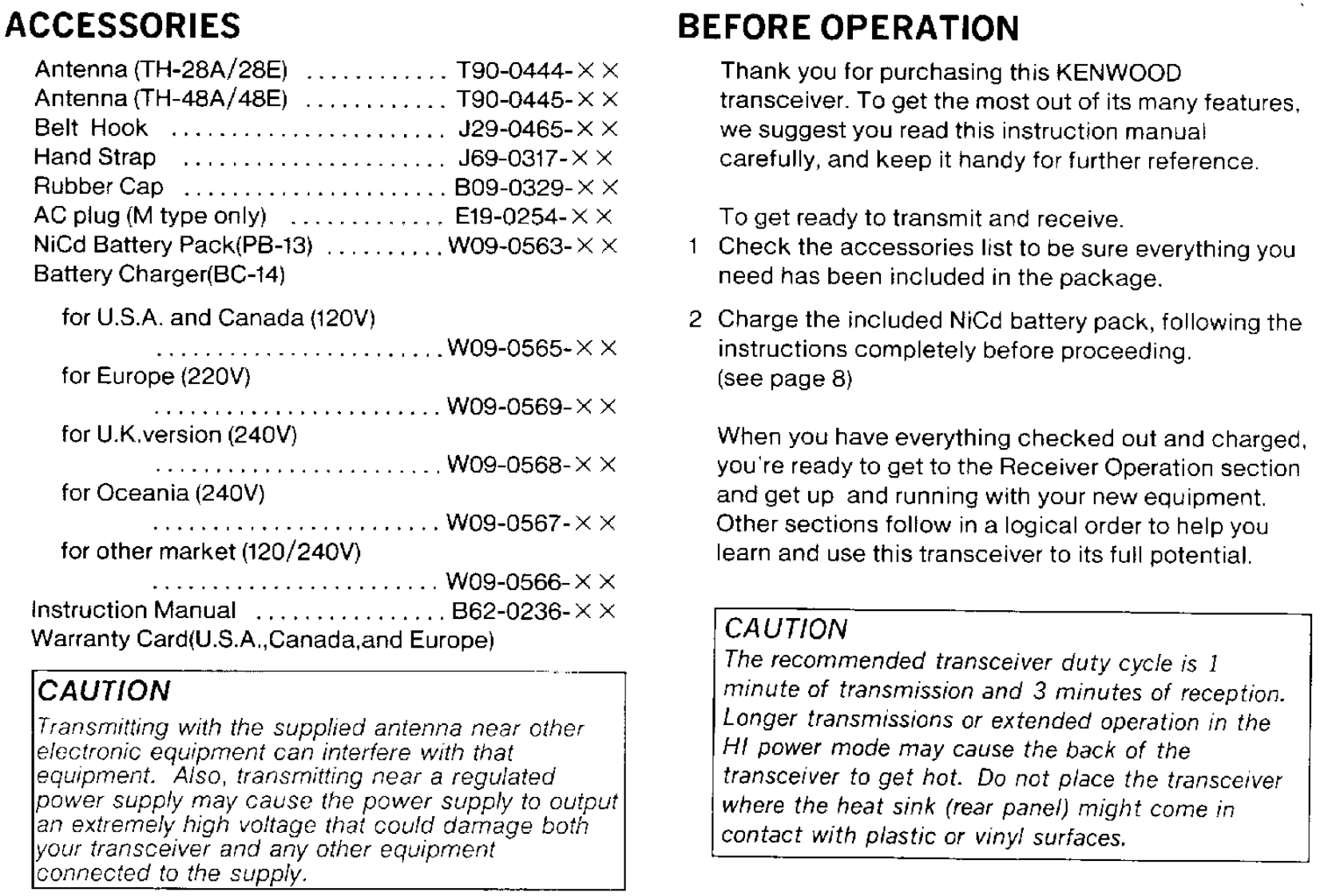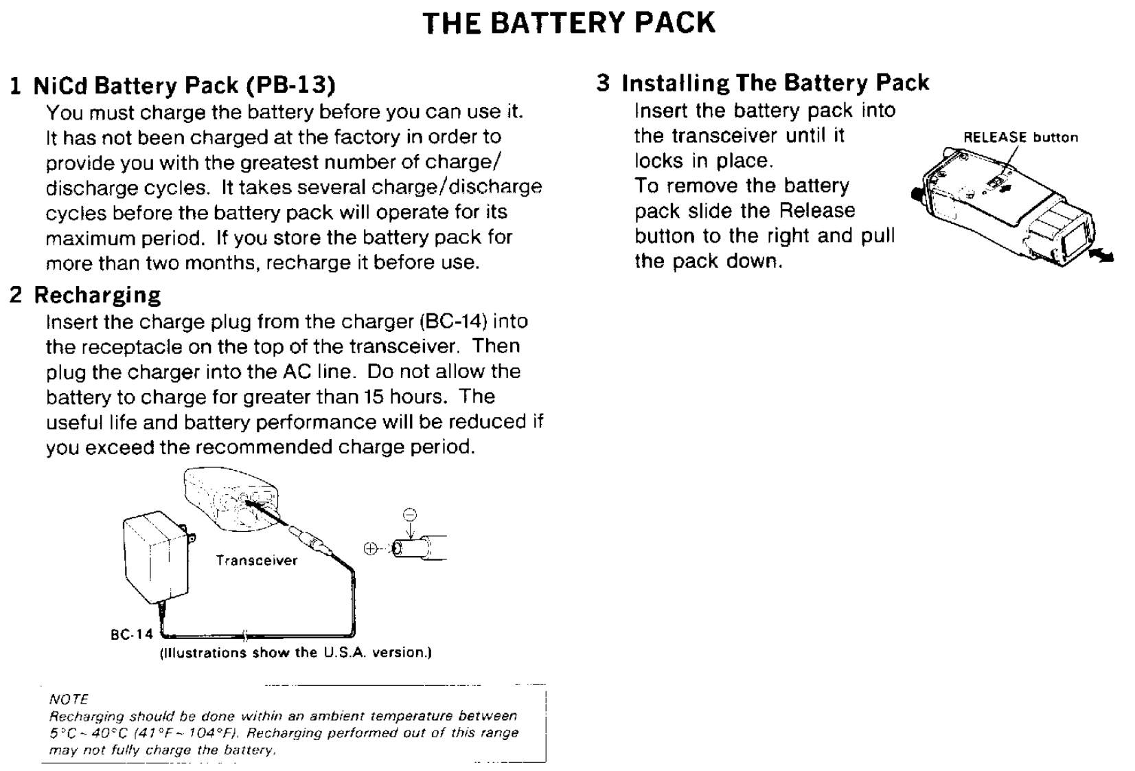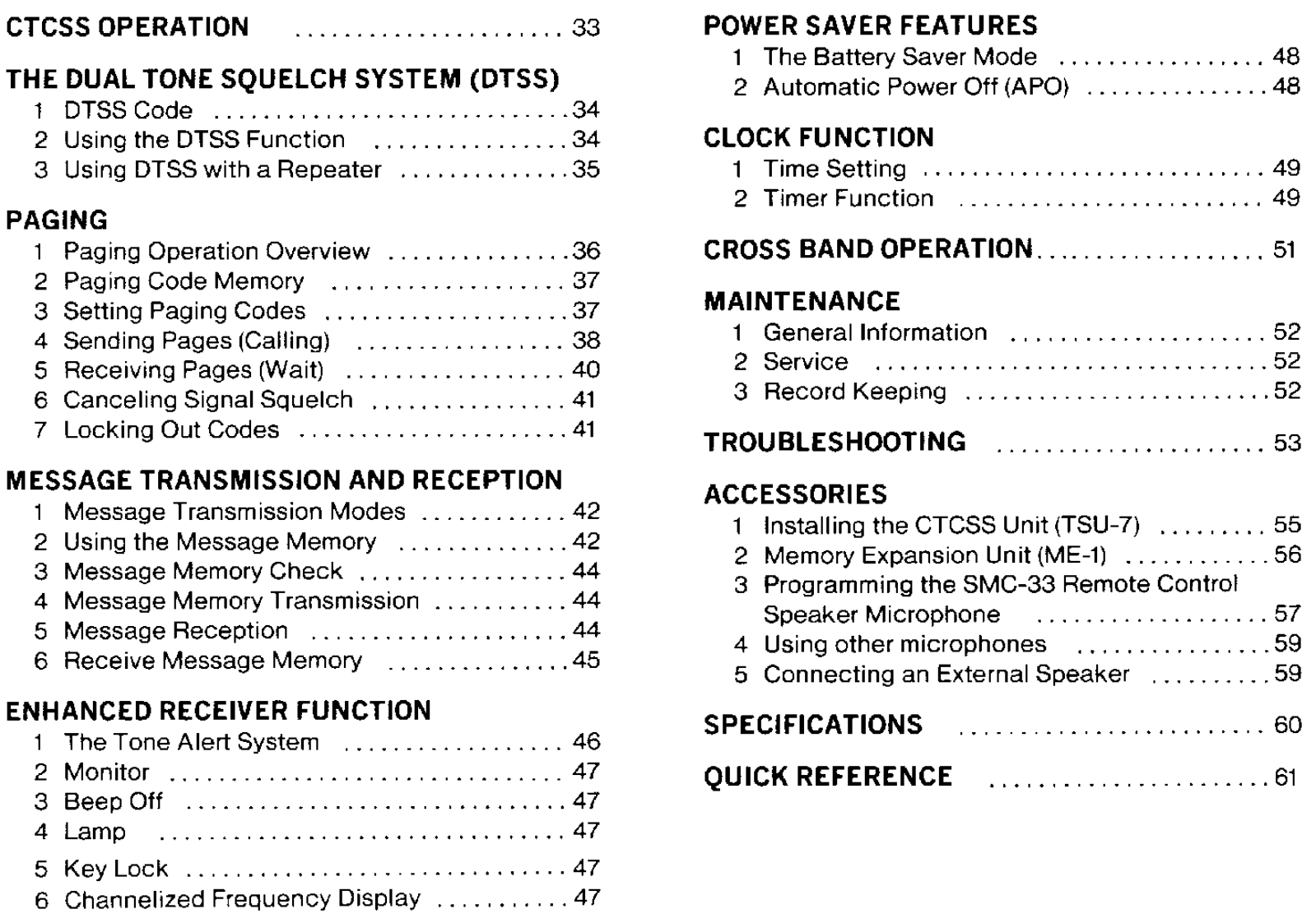 CONTENTSACCESSORIES55 Memory Contents.186 Entering Split Channel Frequencies ........19BEFORE OPERATION57 Entering The Call Channel Frequency ......19Controls Overview68 Recalling Memory Channels20THE BATTERY PACK9 Memory Shift .....201 NiCd Battery Pack (PB-13)10 Memory Channel Character Display ......2182 Recharging .......8SCANNING3 Installing The Battery Pack81 Hold/Resume Programming ....224 Battery Voltage Level92 Scan Options...,…·225 Battery Operating Time.........93Scanning Memory Channels23RECEIVER OPERATION4 Locking Out Memory Channels235 I1 Getting startedBand Scanning ........24102 Selecting Frequency6 Programmable Band Scan ..24117 MHz Scan3 Step Size Selection26128 VFO/Memory Scan4 Programmable VFO Tuning Limits2149 CALL/VFO Scan....5Subband Reception .....6....1410 CALL/Memory Scan26TRANSMITTER OPERATION11 V/M/C(VFO/Memory/CALL)Scan...261 To transmit.................15REPEATER OPERATION2 Changing Transmitter Output Power153 TX.Stop Function1 Transmitter Offsets.......27162 Selecting the Offset Direction4 Time Out Timer163 Automatic Offset Selection2USING THE MEMORY4 Manual Offset Selection1 Microprocessor Memory Backup175 The Reverse Function2 Entering Memory Data ..........176 Tone Operation ....3 initializing The Memory ..........187 Autopatch Operations .4 Memory Channel......188 DTMF Memory