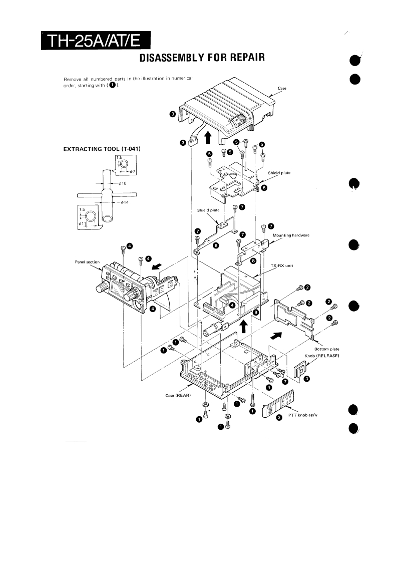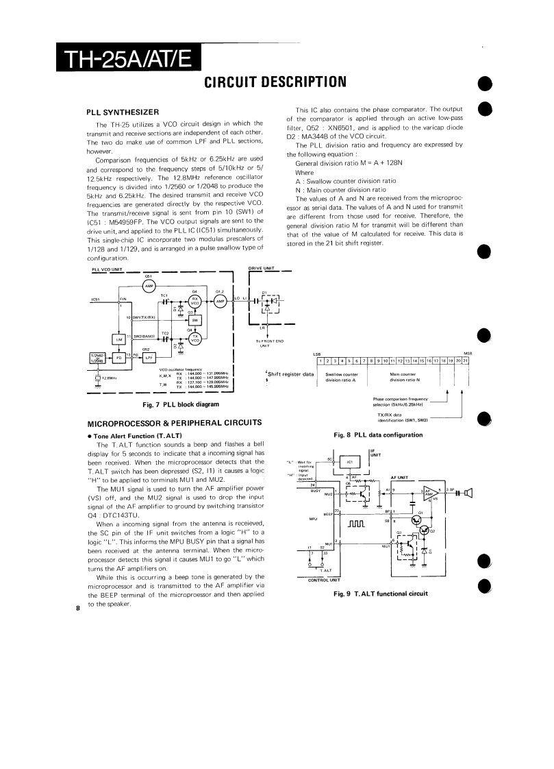 2-m FM HANDHELD TRANSCEIVERTH-25A/AT/EKENWOODSERVICE MANUALC1987-12PRINTED IN JAPANB51-3253-00(01573CONTENTSDISASSEMBLY FOR REPA1R,,,·,,,······2CIRCUIT DESCRIPTION,,·······gSEMICONDUCTOR DATA,,,,,,,,.,,,,,,.,··.····.·0DESCRIPTION OF COMPONENTS,.····.·.···:·:.,.,·,,,,PARTS LISTD1 SASSEBLY,,··始PACKING..29ADJUSTMENT .....................................30PC BOARD VIEWS/CIRCUIT DIAGRAMAVR UN1T{X58.3200-10l31FUN1T(X583210-11…3APC UN1T(X58-3220-10)...·....·.·..·.·.,...,,,,,PLL UN1TX58-3230-10),,,,,,,,,,,,,,,,·,·····MIC AMP UNIT [X59-3300-XX1.........................AFA4PUN1T(X59-331010)......·.····.·.·..··..,,3FR0NT-END UN1T{X59-3320-10).,.···.··.·.·.·..·.·..DRIVE UN1T{X59-3330-10)..,....·................,41SIGNALING UNIT (X52-3090-10)CONTROL UNIT (X53-3080-XX)........................TX-RXUN1T{X573160-XX).,.,·...·....·.·........,,4SCHEMATIC DIAGRAM,·.······.····:···,,,·7BLOCK DIAGRAMLEVEL DIAGRAM50TERMINAL FUNCTIONS,,,··-········。·········BC-9(BATTERY CHARGER)1BC-10(COMPACT CHARGER)BC-11 (RAPID CHARGER)..BT-6 (AAA MANGANESE/ALKALINE BATTERY CASE)........DC.1 DC ADAPTER).,,,,,,,,,,,,,,,,,,,63HMC-2 (HEAD SET WITH VOX PTT)PB-5/6/7/8/9(Ni-Cd BATTERY).····.·.·.·.·...·SC14/15/16s0 FT CASE).·..··..·.·.·.·..:·....:..,6SMC31 SPEAKER MICROPHONE).··.···········.··,·,·TSU6(CTCSS UNIT.·.·········MB-5 (MOBILE BRACKET)..............................WR.1 WATERPROOF CASE).·...,,.,.,,.,,,,,,,,,,,,,,,71SPECIFICATIONS............................BACK COVERPhoto is TH-25AT.方