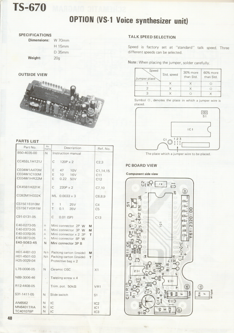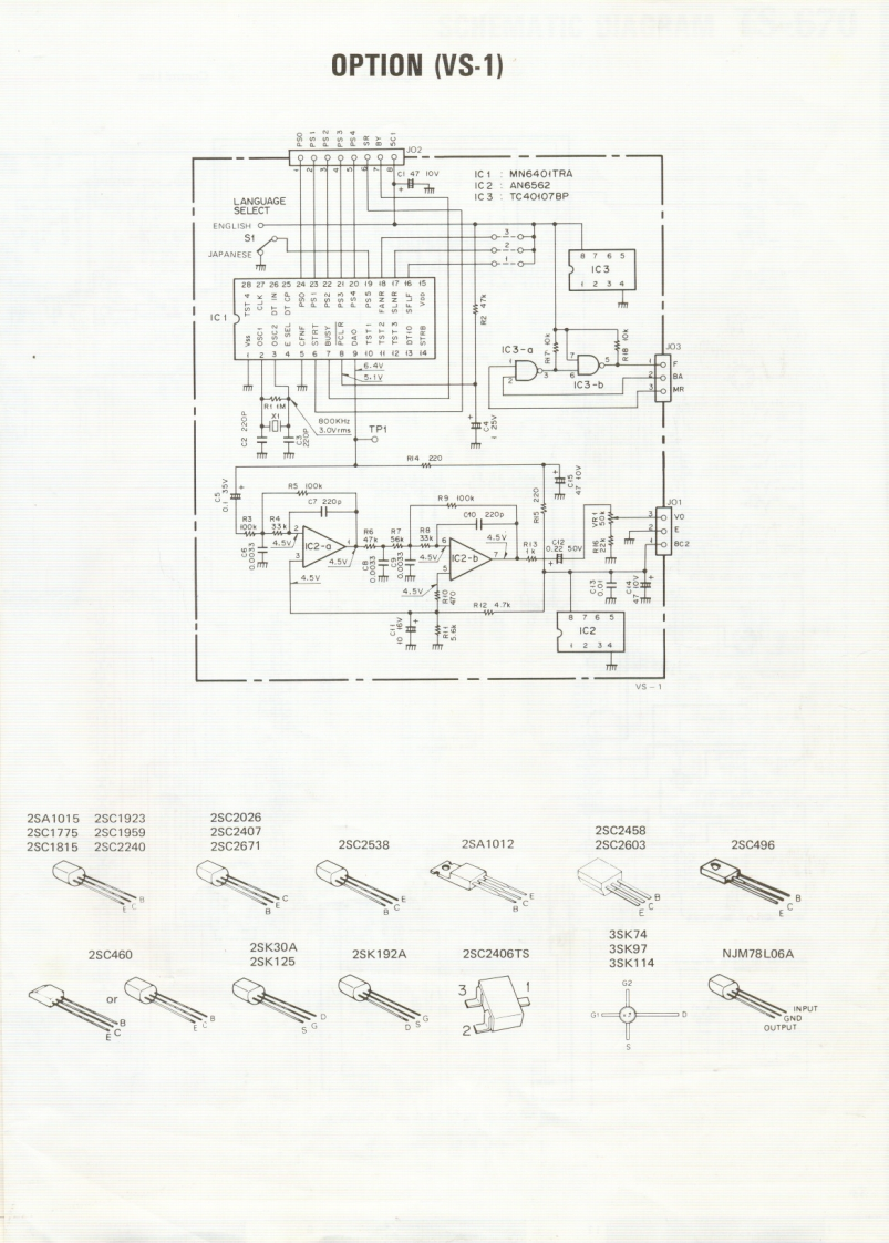 VOICE SYNTHESIZER UNITVS-1KENWOODKENWCOD CORPORATIONINSTRUCTION MANUAL密期质弹四教ACCESSORIESTapping screw..NB9-3006-46....4.pcs.Instruction manual..(B50 4035XX....copy.■OPERATIONFor the other models,refer to the instruction manual provided with the transceiver.1.Voice output level adjustment [VR1]The VS-1 voice output level is adjustod at the factory.This level can be readjusted with VR1.2.Language selector switch (S1)Elther English or Japanese language can be selected with switch S1.VRIOO]