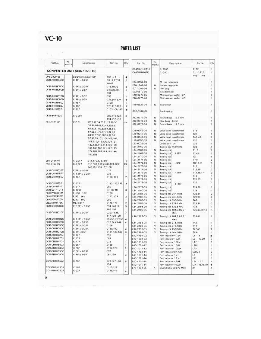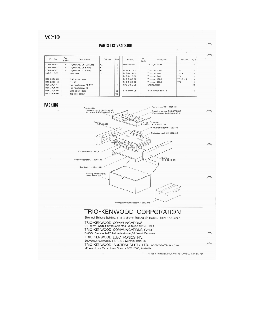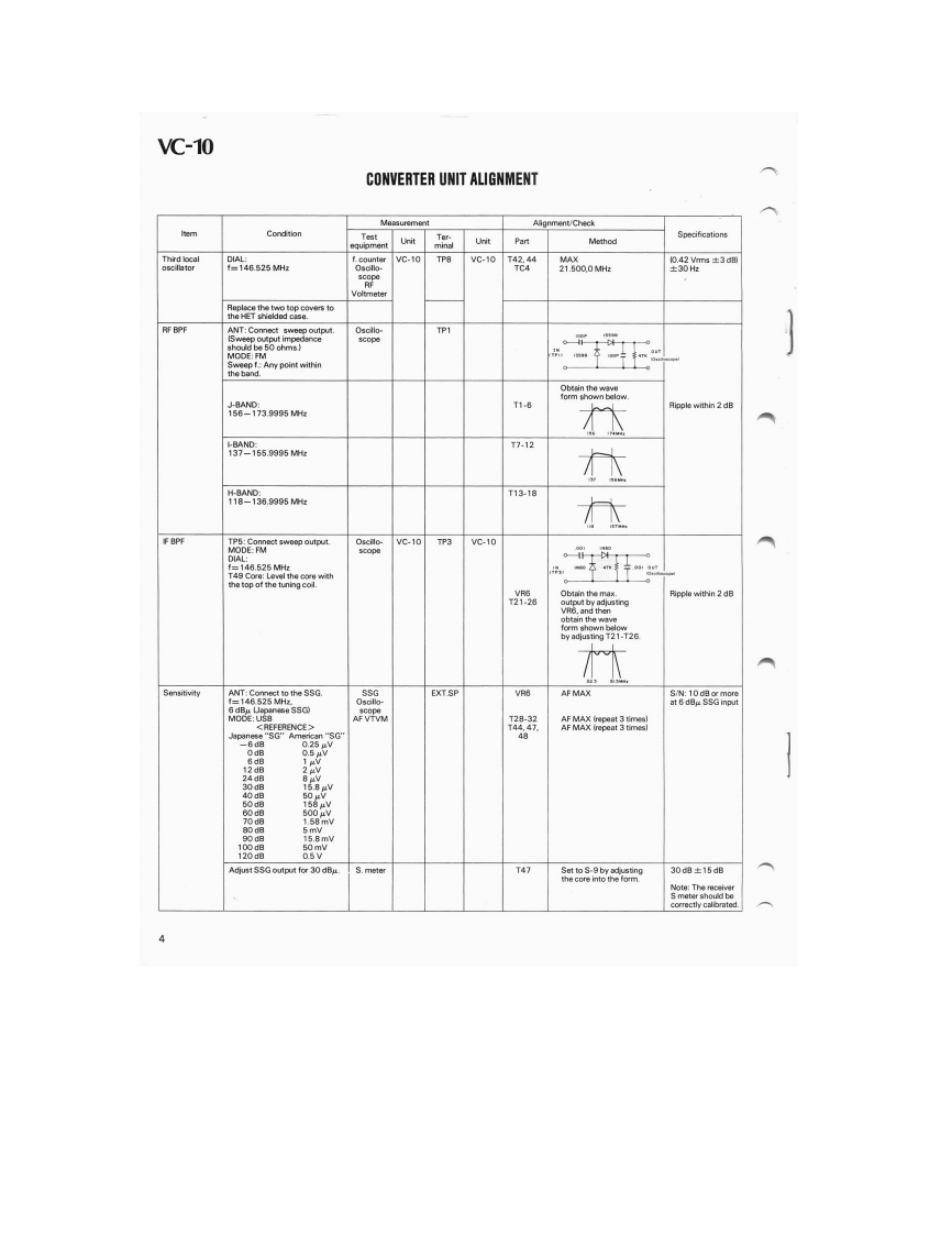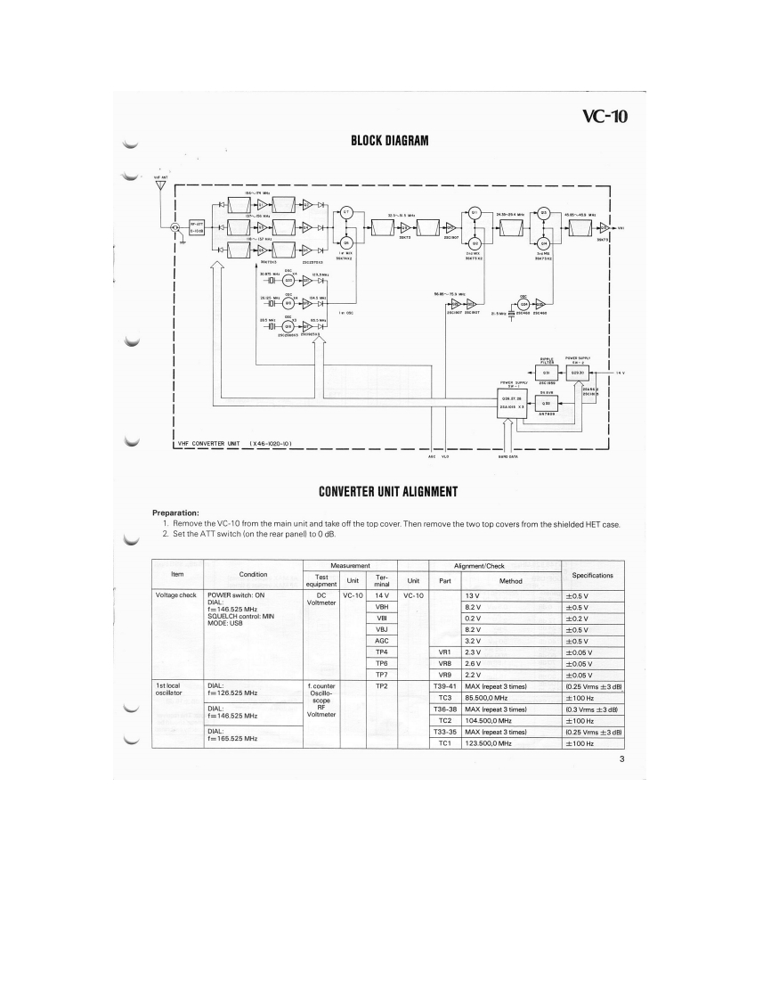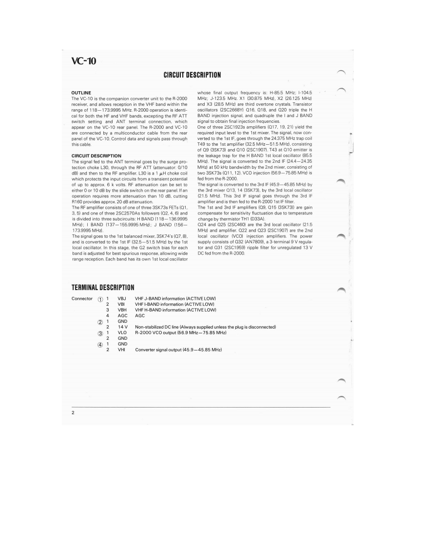 KENWOODSERVICE MANUALVC-10VHF CONVERTERFOR THE R-2000SPECIFICATIONSVC-10 characteristics (measured after installation)Receive frequency range....118-174 MHzReceive sensitivltvAM S+N/N=10dB.......Less than or equal to 10uVSSB/CW S+N/N=10dB..Less than or equal to 1 uVFM S+N/N=20dB ......Less than or equal to 2uV12dB SINAD.......Less than or equal to 2uVOpen squelch sensitivityAM.SSB.CWLess than or equal to 5uVFM.......................Less than or equal to 1uVAntenna impedance50ohmsCONTENTSSPECIFICATIONS.........................TOPCOVERSCHEMATIC DIAGRAMCIRCUIT DESCRIPTION....2CONVERTER UNIT (X46-1020-10)................6BLOCK DIAGRAM..3PCBOARDVIEW.....................7ADJUSTMENT.....................................3PARTSLIST......................................8PACKING…BACK COVERR房