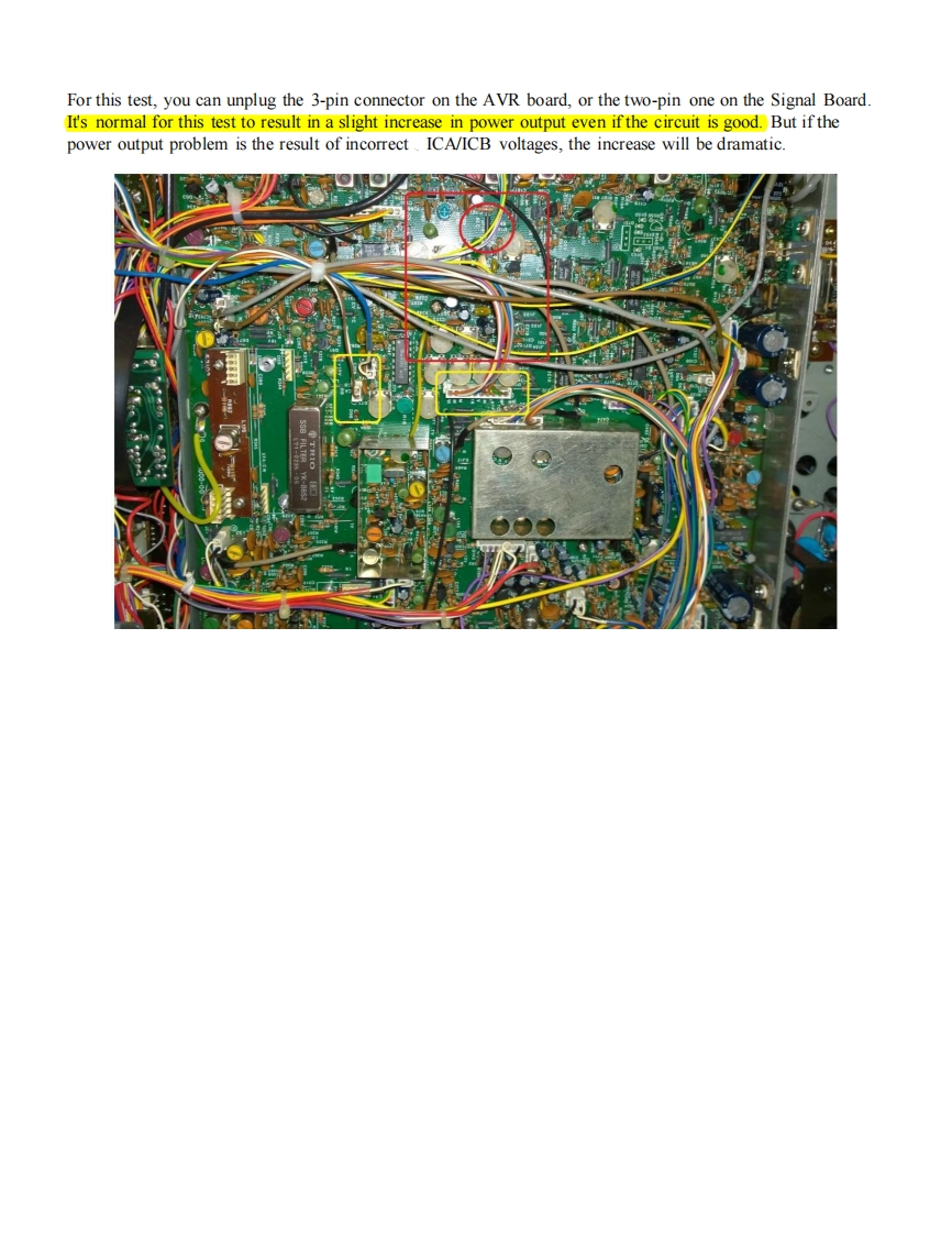 TWO SIGNAL BOARD TESTSThere are a couple safety circuits that are designed to protect the PA.The circuits are circled in red belowand on the photo on the next page.The connectors are outlined in yellow.The larger one is the Automaticlevel Control (ALC)from the LPF.ALC TEST:The ALC level is controlled by a feedback circuit from the Power Amplifier and the LPF.Itreduces the drive from the Signal Unit to the PA as the SWR increases,and it will shut the drive downcompletely if it believes that the SWR is too high,there's a short at the antenna terminal or there's a faultsomewhere else in the output circuit.A simple test is to remove the ALC plug from the right side of the LPFwith the power off.The connector is outlined in red,below.The rig is then turned back on.With the carrier control "off'(fully counter-clockwise),the rig is set toSEND,and the carrier SLOWLY increased.If the output power climbs to 100 watts or more as the carriercontrol is advanced,then the problem is in the LPF,or in the ALC circuit in the Signal Unit.Care is neededhere because the power can go over 150 watts with that plug removed,which could damage the finals.CURRENT CONTROL (ICA/ICB)The other power control circuit is the current limiter (ICA and ICB)which comes from the connector on the AVR board.This circuit,which shuts down the drive to the PA inthe event of a current overload,is maintained while rebuilding the AVR board after the Quint conversion.This circuit receives the main voltage and a slightly lower one from the voltage drop across that 0.05 ohmpower resistor in the PA supply line.The gray wire from that resistor goes to the 3-pin connector on theAVR board,through one of the green inductors,and then down to the signal unit via the brown wire.The28.5V B+goes passes through the other green inductor down to the Signal Unit via the white wire.A simpletest to see if this circuit is malfunctioning is to unplug the two-wire ICA/ICB connector (with the power off).The rig is set to SEND and the carrier control slowly eased in.If the power returns to normal,then theproblem is either in the voltage output from the AVR board,or a bad component on the Signal Unit board