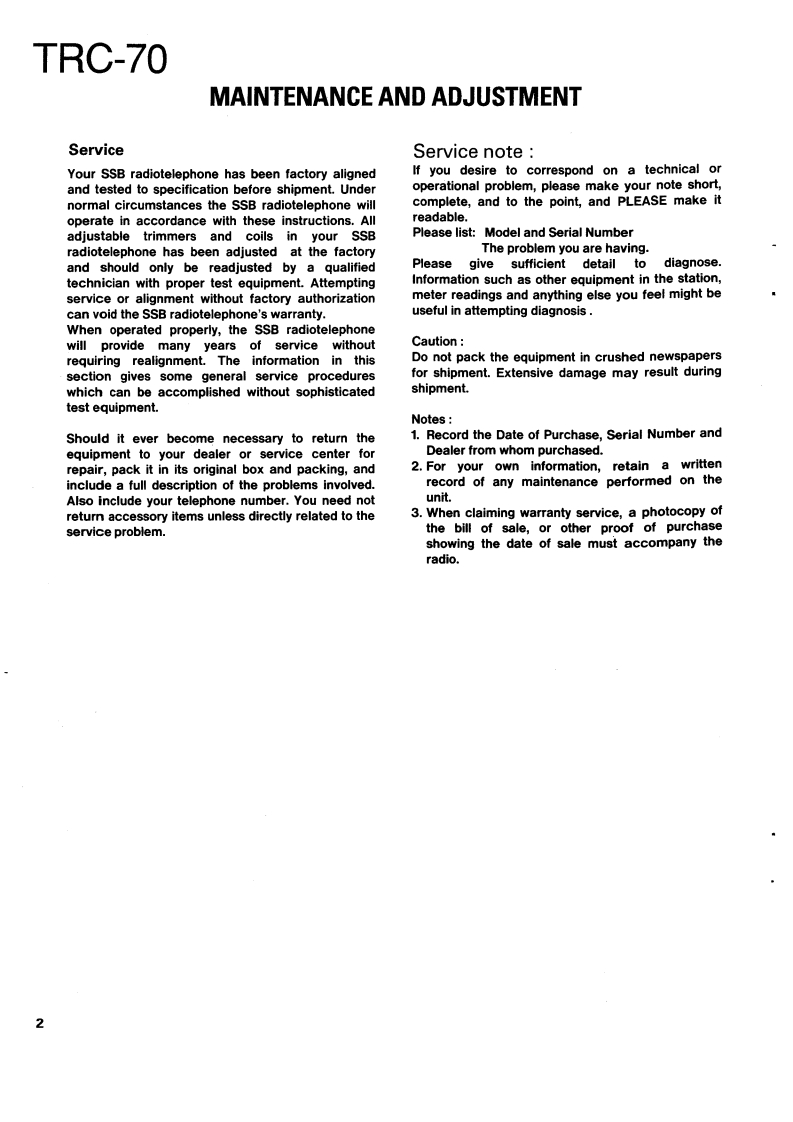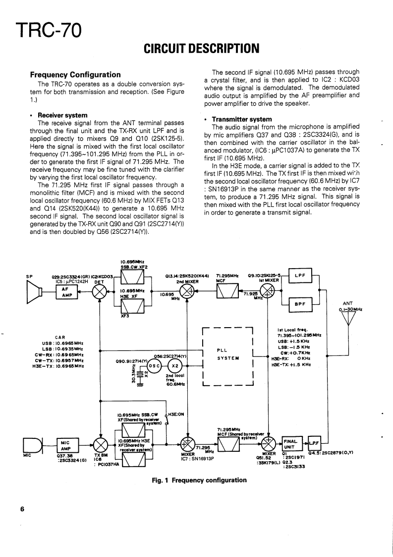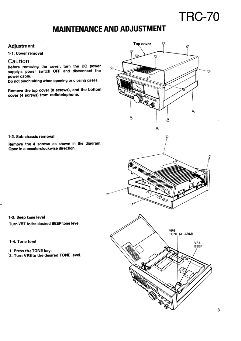 SSB RADIOTELEPHONEKENWOODTRC-70SERVICE MANUAL1989-11 PRINTED IN JAPANB51-8038-000)588KnobKnob (POWER SW)Metallic cabinetKnobFront glassPanel ass'y (DRESSING PANEL)(K29-4540-14)(K29-4519-04)】(A01-1087-02){K29-4540-14)(B10-1129-14)(A20-7061-04)Knob(K29-4540-14)×4MicrophonePhone jackLabelKnob (MAIN DIAL)FootKnob(T91-0388-05)E11-0440-05){B42-3379-04(K29-4538-03)(J02-0323-05)×4(K29-4539-04)×2CONTENTSMAINTENANCE AND ADJUSTMENT...............2C0 NTROL UNIT(X53-3280-21)..85INSTALLATION INSTRUCTIONS.........5TX-RX UNIT(X57-3470-21).93CIRCUIT DESCRIPTION…6FINAL UNIT(X45-3370-21).101DESCRIPTION OF COMPONENTS .........27SCHEMATIC DIAGRAM.…105PARTS LIST33MAT-100 (AUTOMATIC ANTENNA TUNER)EXPLODED VIEW.........63Circuit Description…108PACKING65Bl0 ck Diagram.....…122ADJUSTMENT66Description of Components.........123LEVEL DIAGRAM.....76Parts List…124BLOCK DIAGRAM..7Exploded View…129TERMINAL FUNCTION.....…81PC Board ViewCIRCUIT DIAGRAMS/PC BOARD VIEWSLED UNIT (W02-0844-08)130LCD ASS'Y(B38-0324-05)…83ANT MODULE UNIT(W02-0883-08)..........131VC0X58-3720-10)…83SchematicSDET0NE(X59-1060-00).84Installation Instructions.136DC-DC(X59-1100-00)…84Manual Tuning…140FAN TEMP PROTECTION (X59-3370-00).....84Specifications....141VC0(X59-3440-00)..84SPECIFICATIONS....BACK COVER
