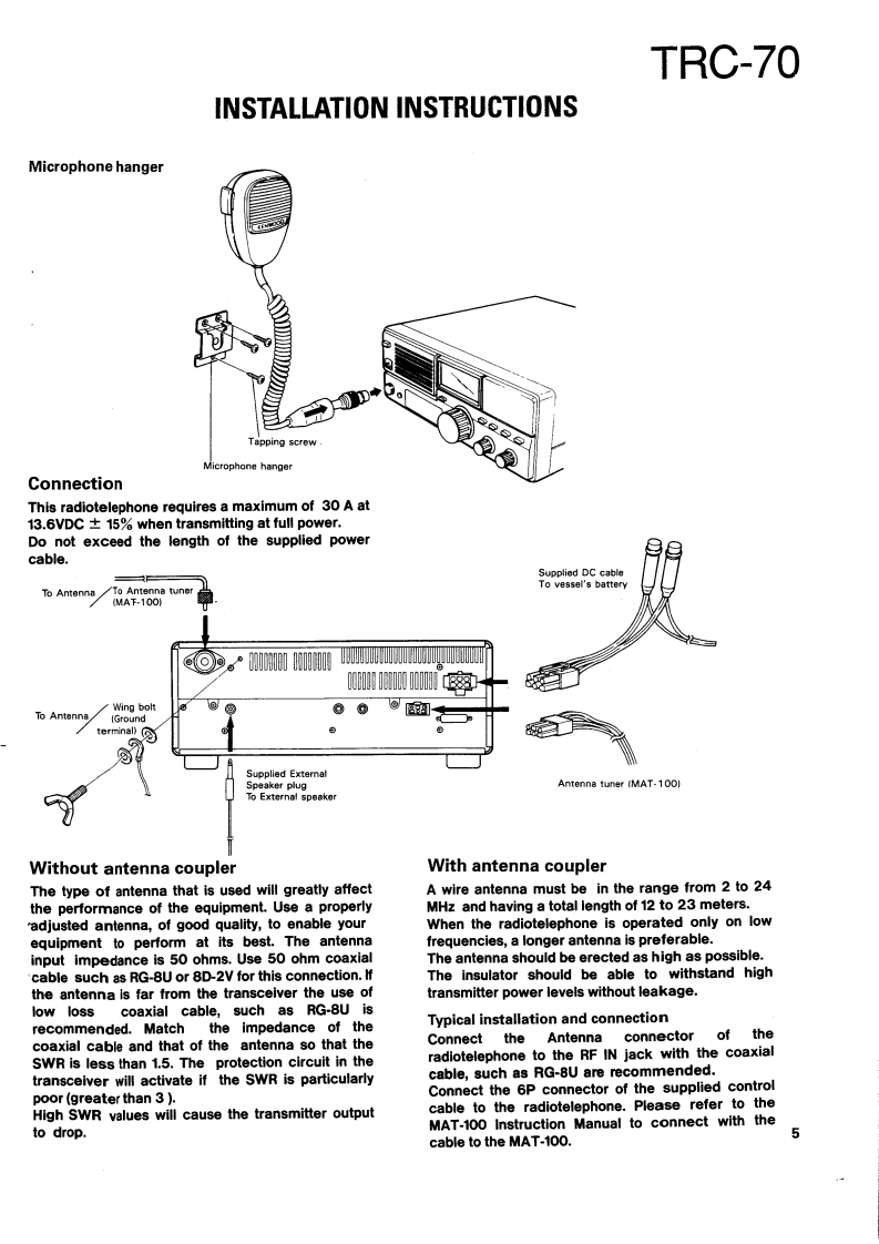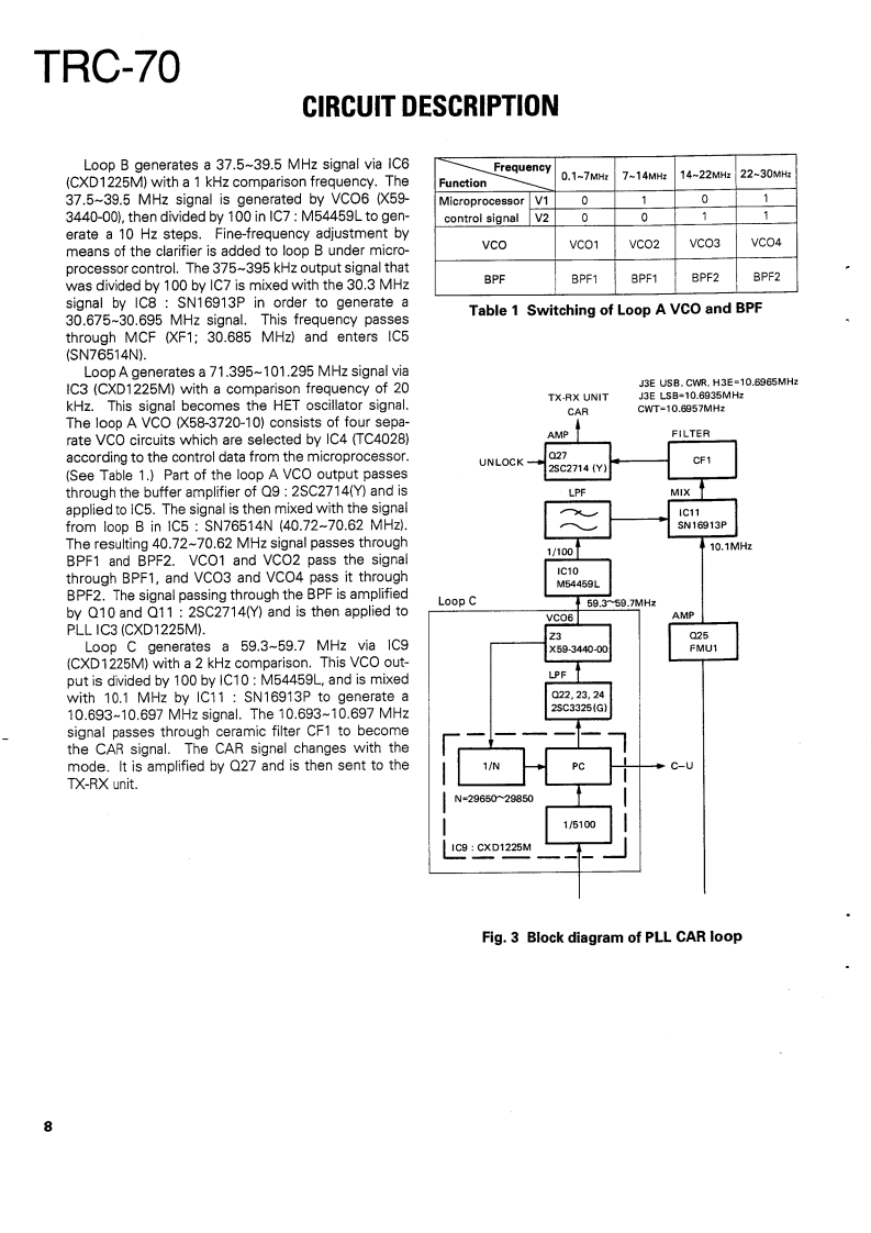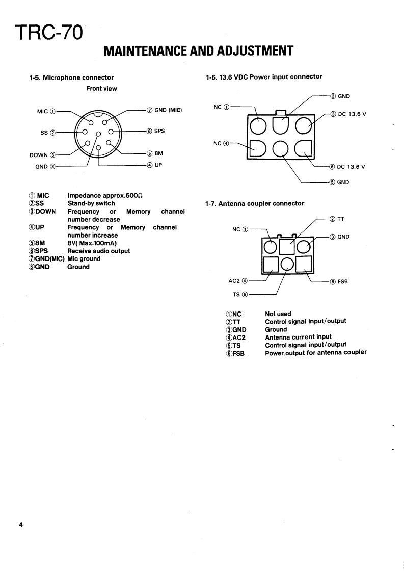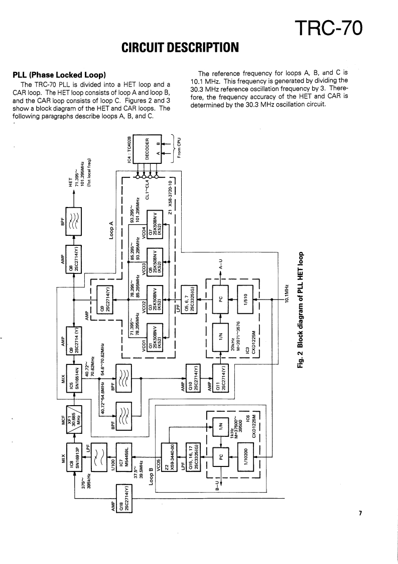 SSB RADIOTELEPHONEKENWOODTRC-70SERVICE MANUAL1989-11 PRINTED IN JAPANB51-8038-000)588KnobKnob (POWER SW)Metallic cabinetKnobFront glassPanel ass'y (DRESSING PANEL)(K29-4540-14)(K29-4519-04)】(A01-1087-02){K29-4540-14)(B10-1129-14)(A20-7061-04)Knob(K29-4540-14)×4MicrophonePhone jackLabelKnob (MAIN DIAL)FootKnob(T91-0388-05)E11-0440-05){B42-3379-04(K29-4538-03)(J02-0323-05)×4(K29-4539-04)×2CONTENTSMAINTENANCE AND ADJUSTMENT...............2C0 NTROL UNIT(X53-3280-21)..85INSTALLATION INSTRUCTIONS.........5TX-RX UNIT(X57-3470-21).93CIRCUIT DESCRIPTION…6FINAL UNIT(X45-3370-21).101DESCRIPTION OF COMPONENTS .........27SCHEMATIC DIAGRAM.…105PARTS LIST33MAT-100 (AUTOMATIC ANTENNA TUNER)EXPLODED VIEW.........63Circuit Description…108PACKING65Bl0 ck Diagram.....…122ADJUSTMENT66Description of Components.........123LEVEL DIAGRAM.....76Parts List…124BLOCK DIAGRAM..7Exploded View…129TERMINAL FUNCTION.....…81PC Board ViewCIRCUIT DIAGRAMS/PC BOARD VIEWSLED UNIT (W02-0844-08)130LCD ASS'Y(B38-0324-05)…83ANT MODULE UNIT(W02-0883-08)..........131VC0X58-3720-10)…83SchematicSDET0NE(X59-1060-00).84Installation Instructions.136DC-DC(X59-1100-00)…84Manual Tuning…140FAN TEMP PROTECTION (X59-3370-00).....84Specifications....141VC0(X59-3440-00)..84SPECIFICATIONS....BACK COVER