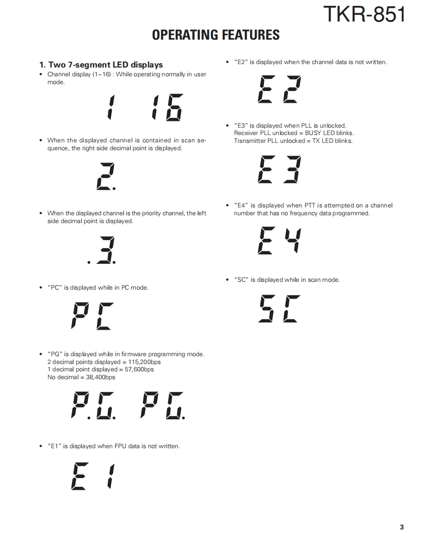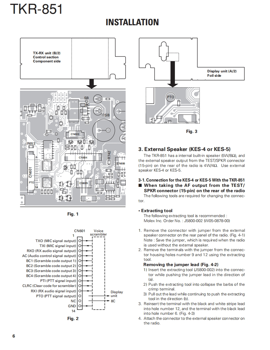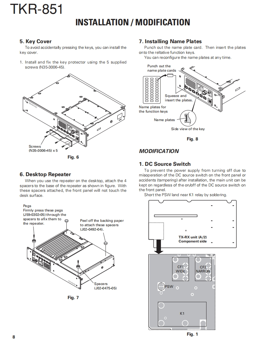 UHF FM REPEATERTKR-851KENWOODSERVICE MANUAL2004-5 PRINTED IN JAPANB51-8684-00(N)987Front panelKnob (Volume)Knob (DC source)(A62-0934-03)(K29-5389-03)(K29-9106-04)·@KENWOOD@8.8©·@@Key topModular jack(K295460-02)(E08-0877-05)Fuse (Blade,10A/32V)(F06-1032-05)X2Antenna cable (N)Antenna cable (BNC)(E30-7528-05)(E30-3418-05)D-sub cable assyDC cord (Ext DC in)(E37-0904-05)(E30-3414-05)TEST/SPKR connector assyDC backup terminal(E37-0913-05)(E70-0402-05)CONTENTSGENERAL.2TERMINAL FUNCTION ..........46SYSTEMSET-UP.2INTERCONNECTION DIAGRAM...........50OPERATING FEATURES..........3PC BOARDREALIGNMENT.4FINAL UNIT(X45-3742-71).52INSTALLATON5DISPLAY UNIT (X54-3330-21)........56MODIFICATION .....8TX-RX UNIT(X57-6962-701(A/2)60DISASSEMBLY FOR REPAIR.10TX-RX UNIT(X57-6962-70)(B/2)64CIRCUIT DESCRIPTION......11RXVC0UNIT(X58-4800-10).…68SEMICONDUCTOR DATA.......18TX VCO UNIT (X58-4810-10).......69COMPONENTS DESCRIPTION.20SCHEMATIC DIAGRAM.70PARTS UST..22BLOCK DIAGRAM...83EXPLODED VIEW34KES-5 (EXTERNAL SPEAKER)86PACKING...SPECIFICATIONS87ADJUSTMENT....37