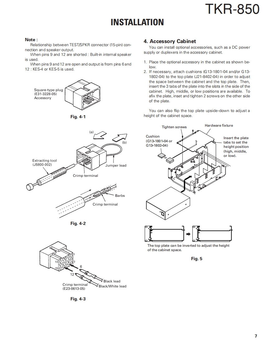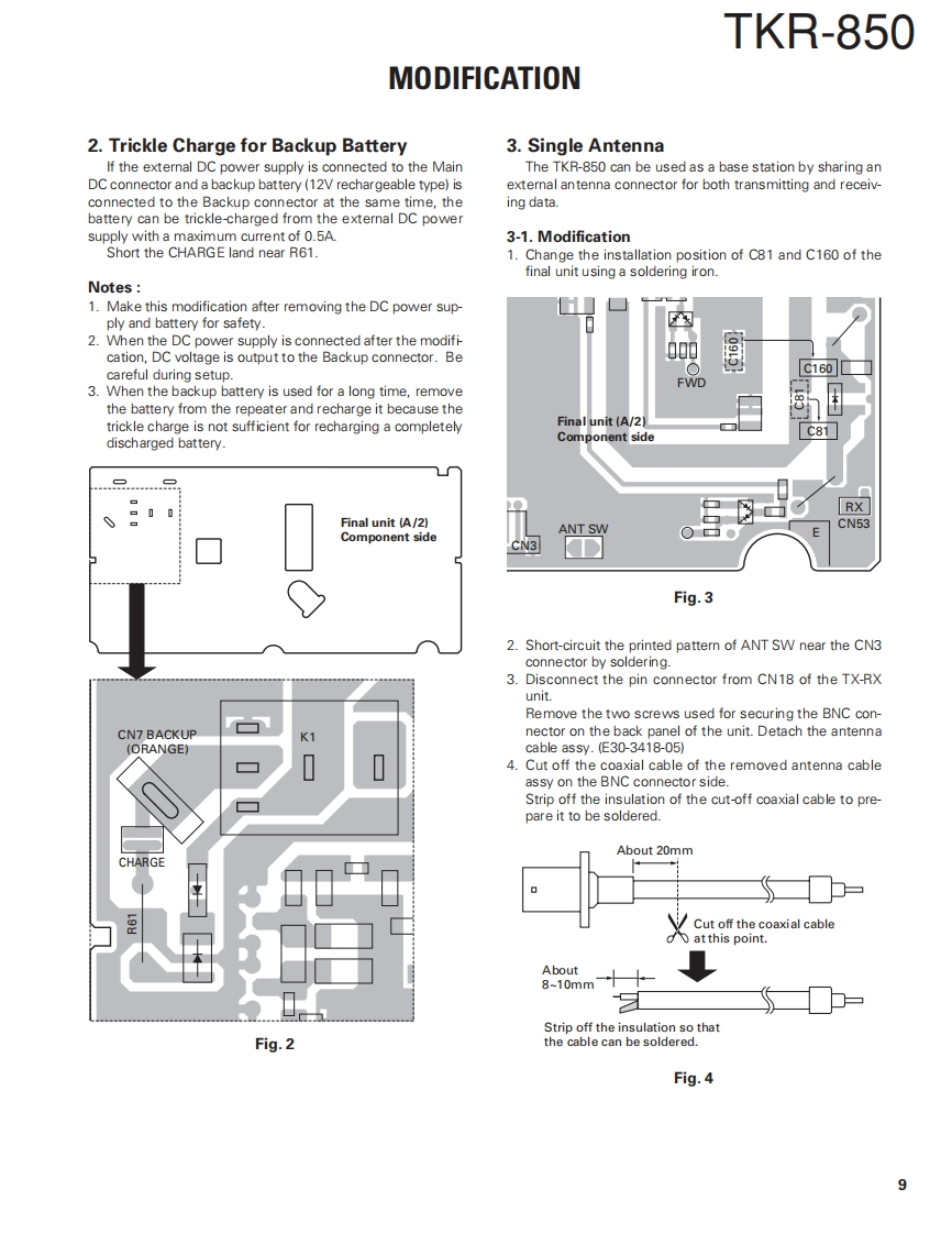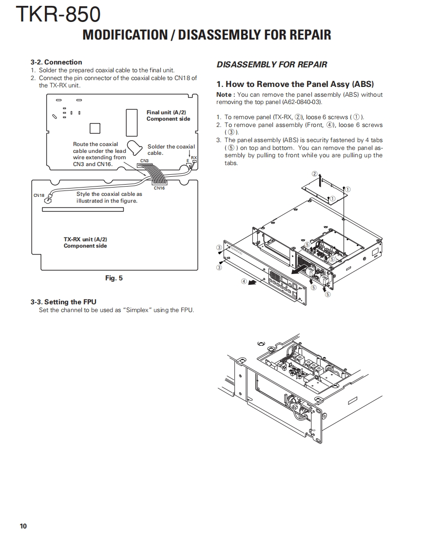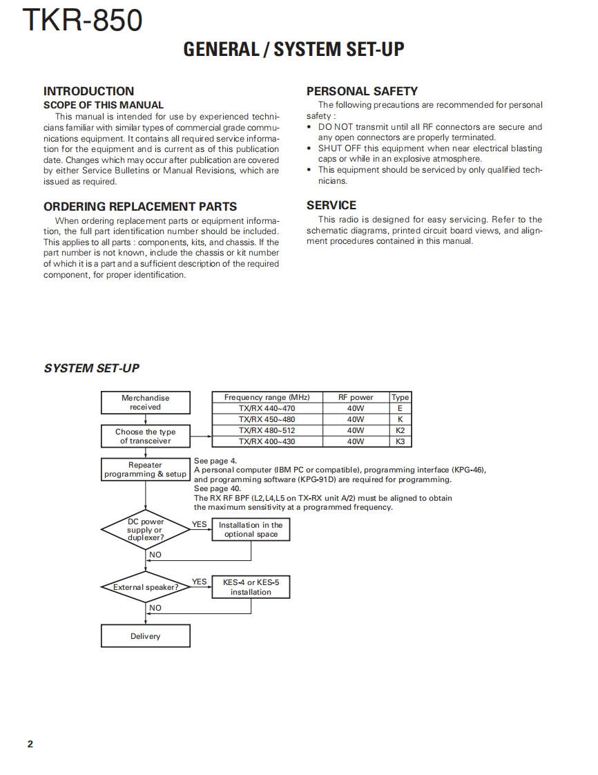 UHF FM REPEATERTKR-850KENWOODSERVICE MANUALREVISED2004-10 PRINTED IN JAPANB51-8557-30(N)1219This service manual applies to products 60700001 or subsequent serial number.In terms of the products with the serial numbers earlier than 60700001,refer to the TKR-850 service manual as per part numberB51-8557-20andB51-8676-00】Front panelKnob (Volume)Knob (DC source)(A62-0934-03)(K29-5389-03)(K29-9106-04·@KENWOOD回回oFuse(Blade,15A/32V)Key topModular jack(F05-1537-05)×2(K295460-02)(E08-0877-05Antenna cable (N)Antenna cable (BNC)(E303419-05)E30-3418-05)D-sub cable assyDC cord (Ext DC in)(E37-0904-05)(E30-3414-05)TEST/SPKR connector assyDC backup terminal(E37-0913-05)(E70-0402-05)CONTENTSGENERAL…TERMINAL FUNCTION46SYSTEM SET-UP2INTERCONNECTION DIAGRAM.50OPERATING FEATURES..3PC BOARDREALIGNMENT....FINAL UNIT (X45-374X-XX)..52INSTALLATION.夕DISPLAY UNIT (X54-3330-21)...56MODIFICATION ......8TX-RX UNIT (X57-696X-XX)(A/2)..60DISASSEMBLY FOR REPAIR10TX-RX UNIT (X57-696X-XX)(B/2)64CIRCUIT DESCRIPTION.......11RX VCO UNIT (X58-480X-XX)......68SEMICONDUCTOR DATA.........18TX VCO UNIT (X58-481X-XX).69COMPONENTS DESCRIPTION20SCHEMATIC DIAGRAM ........70PARTS UST..22BLOCK DIAGRAM......83EXPLODED VIEW34KES-5 (EXTERNAL SPEAKER)。86PACKING36SPECIFICATIONS87ADJUSTMENT.....37