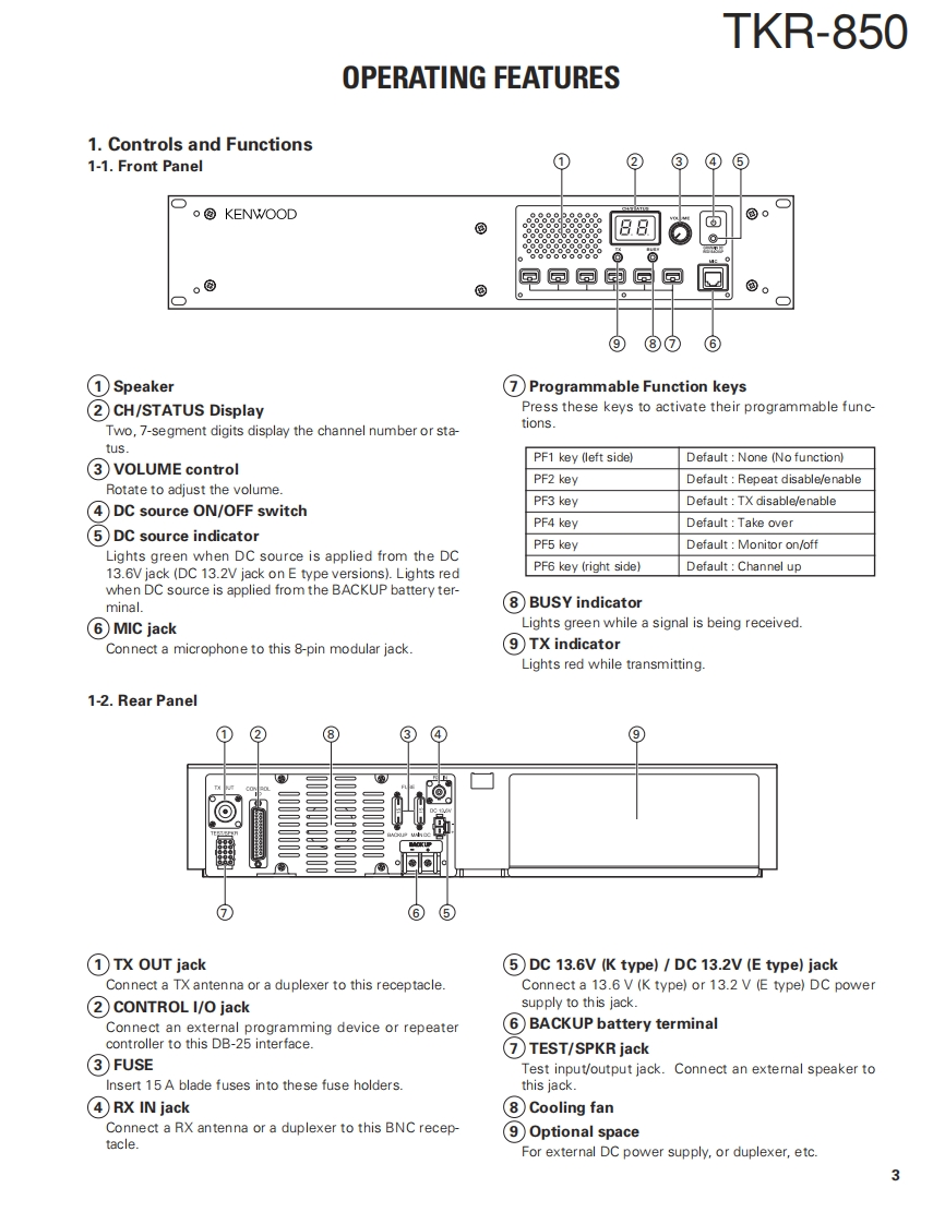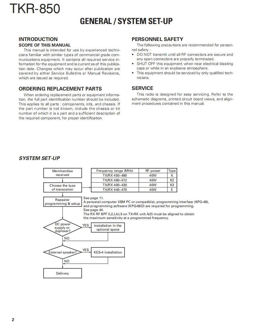 UHF FM REPEATERTKR-850KENWOODSERVICE MANUALREVISED II2002-10 PRINTED IN JAPANB51-8557-20(N)PDFThis Service Manual was revised to include the circuit diagram for the Finalunit (X45-3630-XX)built in the K3 type.Supplemental information contained only in the Supplement of the ServiceManual for TKR-850(B51-8587-00)will become available in this issue.Knob (DC source)(K299106-04)Panel (Outer)Knob (VOL)(A62-0840-03)(K29-5389-03)KENWOODPanel assyKey topModular jack(A62-0934-03)(K29-5460-02)(E08-0877-05)CONTENTSGENERAL.........A*2TERMINAL FUNCTION.....................49SYSTEM SET-UP…2VIRING…53OPERATING FEATURES...............3PC BOARD VIEWSREALIGNMENT.…11RX PLL/VC0(X58-4800-XX)....55INSTALLATION..13TX PLL/VCO (X58-4810-XX)...............56MODIFICATION.15DISPLAY UNIT (X54-3330-20)..........57DISASSEMBLY FOR REPAIR.17FINAL UNIT (X45-3630-XX)................61CIRCUIT DESCRIPTION........18TX-RX UNIT(X57-6270-XX)(A/2)...67SEMICONDUCTOR DATA...................24TX-RX UNIT(X57-6270-XX)(B/2)...73DESCRIPTION OF COMPONENTS .......26SCHEMATIC DIAGRAM................79PARTS LIST.…28BLOCK DIAGRAM.…91EXPLODED VIEW…39KES-4(EXTERNAL SPEAKER)...94PACKING…41SPECIFICATIONS................95ADJUSTMENT..42