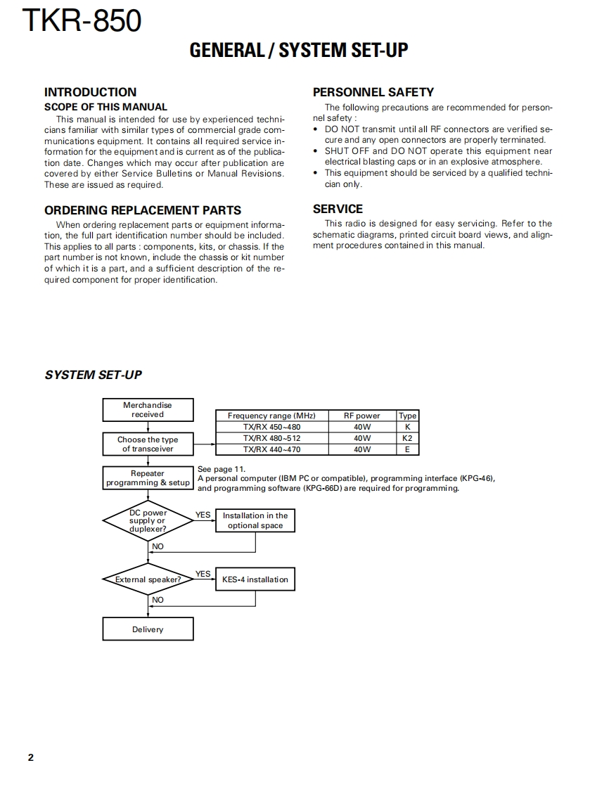 UHF FM REPEATERKENWOODTKR-850SERVICE MANUAL2001-1 PRINTED IN JAPANB51-8557-00(N)1435Knob(DC source)(K29-9106-04)Panel(Outer)Knob (VOL)(A62-0840-03)(K29-5389-03)KENWOODPanel assyKey topModular jack(A62-0934-03)(K29-5460-02)】(E08-0543-05)CONTENTSGENERAL.…2TERMINAL FUNCTION...........47SYSTEM SET-UP251OPERATING FEATURES3PC BOARD VIEWSREALIGNMENT…11RX PLL/VC0(X58-4800-XX)...53INSTALLATION…13TX PLL/VCO (X58-4810-XX).............54MODIFICATION15DISPLAY UNIT (X54-3330-20).............55DISASSEMBLY FOR REPAIR .............16FINAL UNIT (X45-3630-XX)..............59CIRCUIT DESCRIPTION..............17TX-RX UNIT(X57-6270-XX)(A/2)...65SEMICONDUCTOR DATA......23TX-RX UNIT(X57-6270-XX)(B/2)..71DESCRIPTION OF COMPONENTS........25SCHEMATIC DIAGRAM.............77PARTS LIST.27BLOCK DIAGRAM.........89EXPLODED VIEW…37KES-4 (EXTERNAL SPEAKER).............92PACKING39SPECIFICATIONS...........93ADJUSTMENT…40