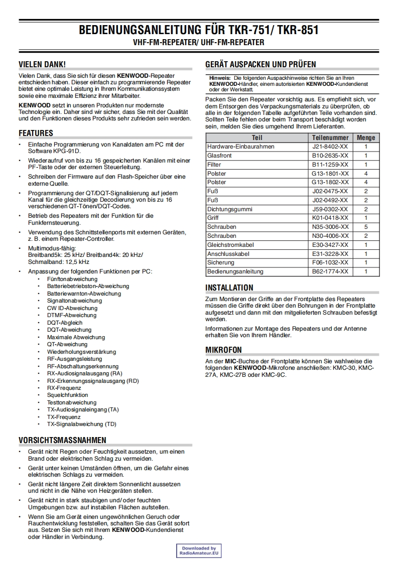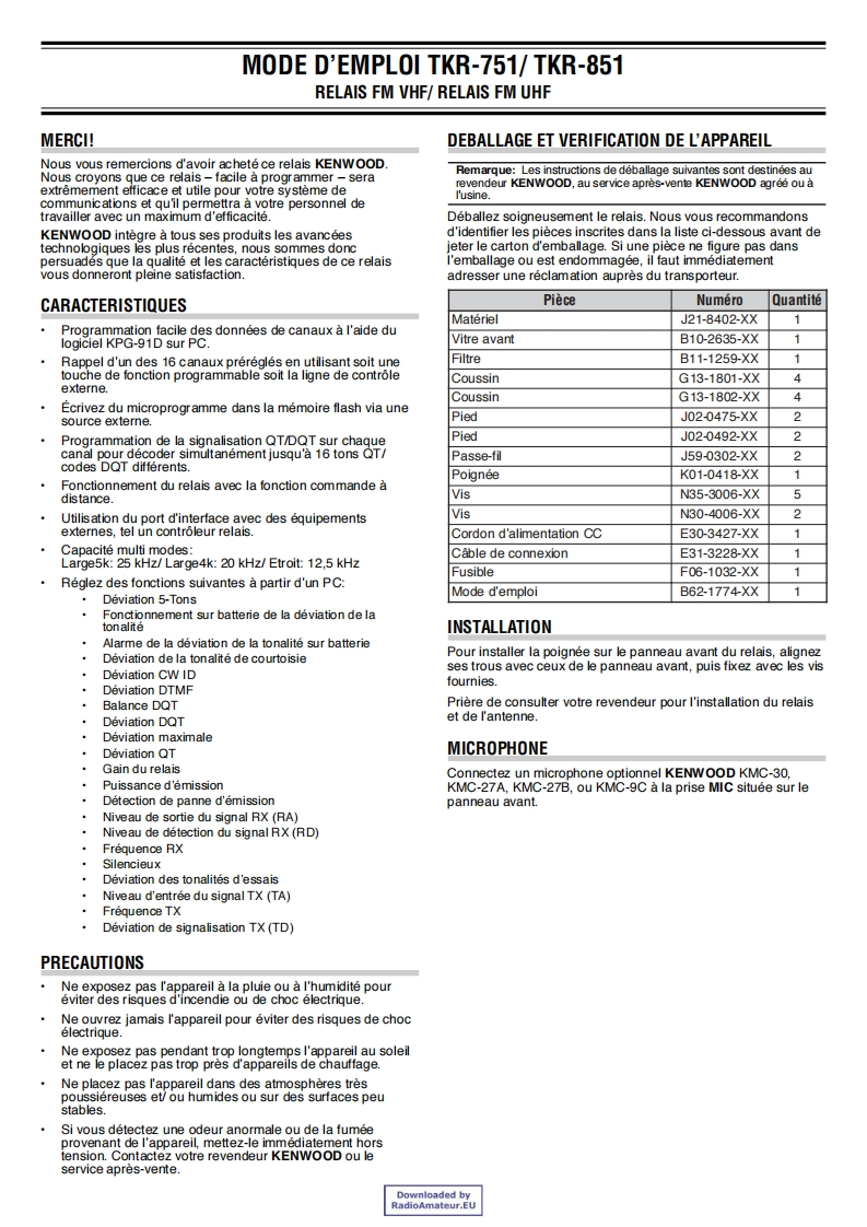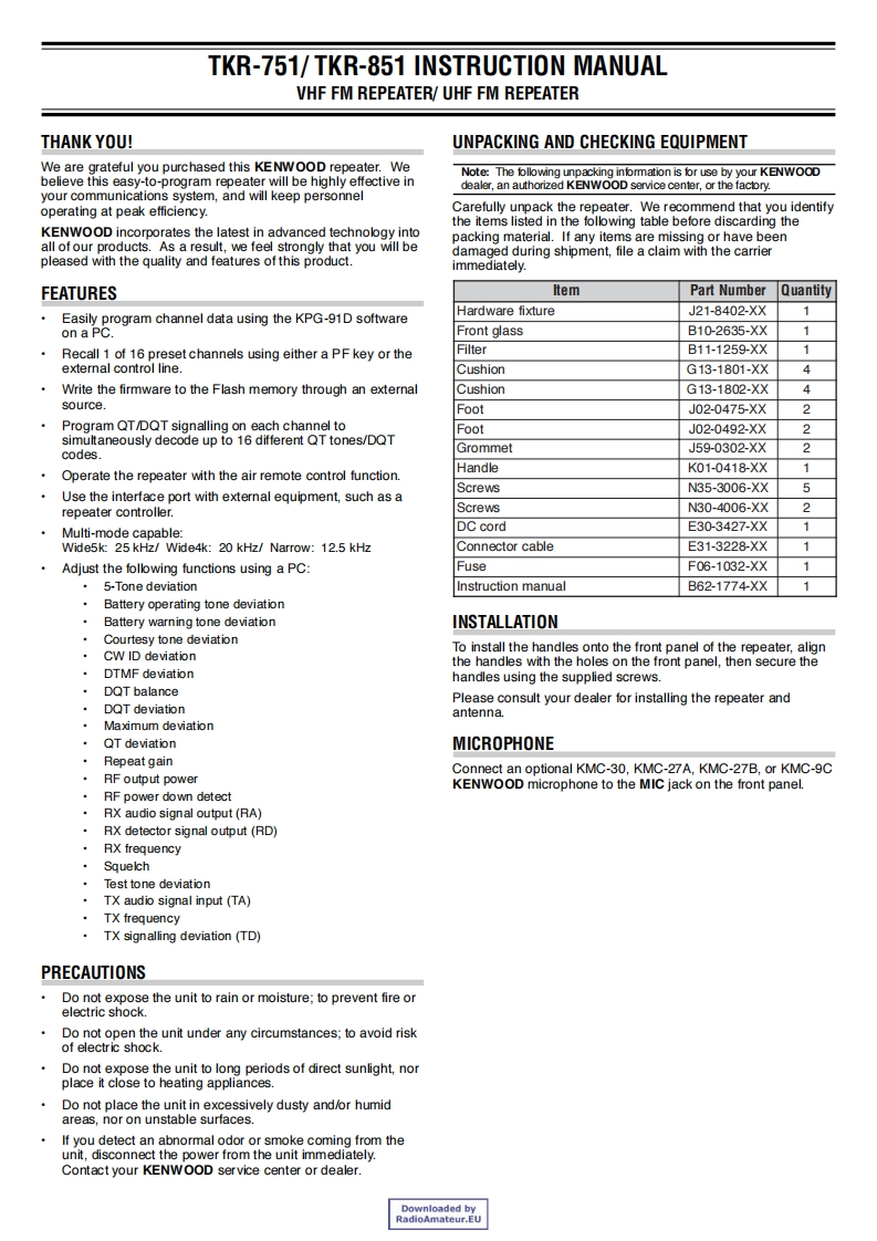 TKR-751/TKR-851VHF FM REPEATER/UHF FM REPEATERINSTRUCTION MANUALKENWOODRELAIS FM VHF/RELAIS FM UHFMODE D'EMPLOIREPETIDOR VHF FM/REPETIDOR UHF FMMANUAL DE INSTRUCCIONESRIPETITORE FM VHF/RIPETITORE FM UHFMANUAL DI ISTRUZIONIVHF-FM-REPEATER/UHF-FM-REPEATERBEDIENUNGSANLEITUNGVHF FM REPEATER/UHF FM REPEATERGEBRUIKSAANWIJZING©B62-1774-00(E)09080706050403020100Downloaded byRadioAmateur.EU