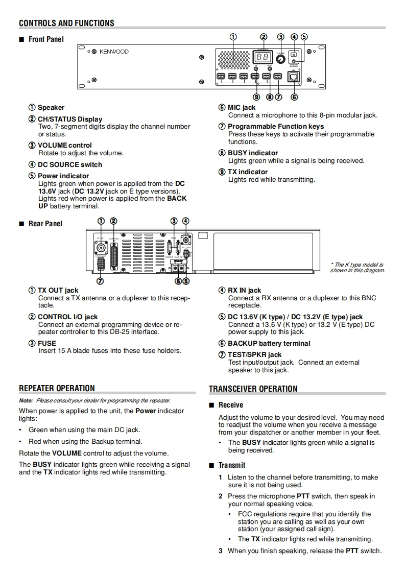 VHF FM REPEATER/UHF FM REPEATERTKR-750/TKR-850KENWOODKENWOOD CORPORATIONINSTRUCTION MANUAL©B62-1327-20(K,目0908070605040302THANK YOU!NOTICES TO THE USERWe are grateful you purchased this KENWOOD repeater.FCC WARNINGWe believe this easy-to-program repeater will be highlyeffective in your communications system,and will keepThis equipmen generates or uses radio frequency energy Changes ormodificatons to this eguipment may cause hamful interference unlesspersonnel operating at peak efficiency.the modifications are expressly approved in the instruction manual TheKENWOOD incorporates the latest in advanced technol-user could lose the authority to operate this equpment ifan unauthorizedchange or modification is made.ogy into all of our products.As a result,we feel stronglythat you will be pleased with the quality and features ofthis product.GOVERNMENT LAWPROHIBITS THE OPERATION OFUMLICENSED RADIO TRANSMITTERS WITHIN THETERRITORIES UNDER GOVERNMENT CONTROL.FEATURESILLEGAL OPERATIONIS PUNISHABLE BY FINE ORIMPRISONMENT OR BOTHYou can easily program channel data using the KPG-66DREFER SERVICE TO QUALIFIED TECHNICIANS ONLY.software on a PC.You can recall 1 of 16 preset channels using either a PF keyor the external control line.UNPACKING AND CHECKING EQUIPMENTThe firmware can be written to the Flash memory throughNote:The blowing unpacking infomation is for use by your KENWOODan external source.dealet an authorized KENWOOD service facily or the factory.QT/DOT signalling can be programmed on each channel.ItCarefully unpack the repeater.We recommend that yousimultaneously decodes up to 16 different QT/DQT tones.identify the items listed in the following table beforediscarding the packing material.If any items are missingThe interface port can be used with external equipment,or have been damaged during shipment.file a claim withsuch as a repeater controller.the carrier immediatelyThe repeater has multi-mode capability.Wide:30 kHz/Narrow:15 kHz(TKR-750;K type only)ItemPart NumberQuantityWide:25 kHz/Narrow:12.5 kHz(TKR-750/TKR-850)Hardware fixtureJ21-8402-X4You can adjust the following functions from a PC:Front glassB10-2635-X41SquelchFilterB11-1259-X41RX audio signal output (RA)CushionG13-1801-X44RX detector signal output (RD)CushionG13-1802-X44RX frequencyFootRF output powerJ02-0475-X52Ma对imum deviationFootJ02-0492-X42TX audio input (TA)GrommetJ59-0302-X52Signalling deviation (TD)HandleK01-0418-X51DOT balanceScrewsN35-3006-455QT deviationDC cordE30-3427-X51DOT deviationConnector cableE31-3228-X51Test tone deviationFuseF05-1537-X5CW ID deviation1·Repeat gainWarranty card(K type only)1·TX frequencyInstruction manualB62-1327-XXPRECAUTIONSINSTALLATIONDo not expose the unit to rain or moisture;to prevent fire orTo install the handles onto the front panel of the repeater.electric shock.align the handles with the holes on the front panel,thenDo not open the unit under any circumstances:to avoid risksecure the handles using the supplied screws.of electric shock.Please co