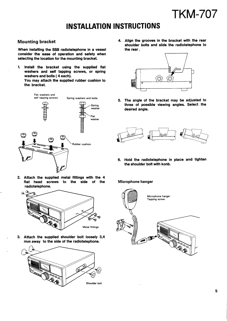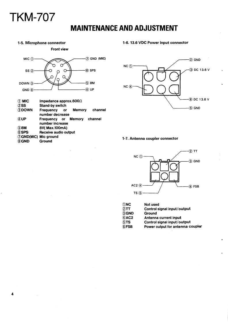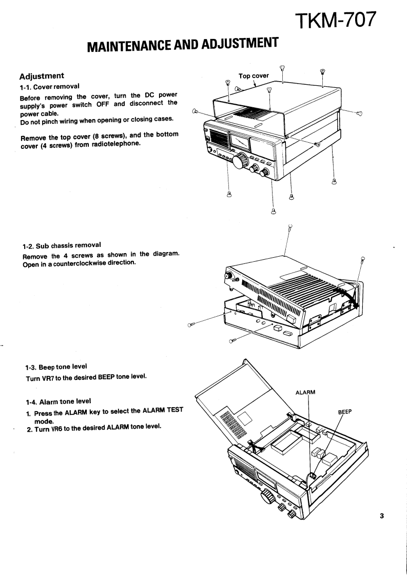 SSB RADIOTELEPHONEKENWOODTKM-707SERVICE MANUAL1989-11 PRINTED IN JAPANB51-8037-00(O)638KnobKnob (POWER SW)Panel ass'y (DRESSING PANEL)(K29-4540-14)(K29-4519-04)(A20-7061-04)Panel ass'yMetallic cabinetFront glassKnobKnob(A20-7045-13)(A01-1086-02)(B10-1129-14)(K29-4540-14)×4(K29-4539-04)×2KENWOOD2.782.0E-[HTM7●MicrophoneCap (PHONES)KnobKnob (MAIN DIAL)Foot(T91-0388-05)(B09-0320-04)(K29-4540-14)x5{K29-4538-03)(J02-0323-05)X4CONTENTSMAINTENANCE AND ADJUSTMENT ......2TX-RX UNIT(X57-3470-10).93INSTALLATION INSTRUCTIONS.....5.FINAL UNIT(X45-3370-10).101CIRCUIT DESCRIPTION.SCHEMATIC DIAGRAM............105DESCRIPTION OF COMPONENTS...............27MAT-100 (AUTOMATIC ANTENNA TUNER)PARTS LST..............33Circuit Description108EXPLODED VIEW...............63Bl0 ck Diagram…122PACKING……65Description of Components123ADJUSTMENT.........,66Parts List.…124LEVEL DIAGRAM..........76Exploded View…129BLOCK DIAGRAM……77PC Board ViewTERMINAL FUNCTION..................81LED UNIT(W02-0844-08).130CIRCUIT DIAGRAMS PC BOARD VIEWSANT MODULE UNIT (W02-0883-08)...........131LCD ASSY(B38-0324-05).83Schematic Diagram133VC0(X58-3720-10).…83Installation Instructions...........136DC-DC(X59-1100-00)…84Manual Tuning.........140FAN TEMP PROTECTION(X59-3370-00).....84Specifications.........…141VC0(X59-3440-00).84SPECIFICATIONS.BACK COVERCONTROL UNIT (X53-3280-10)........................85