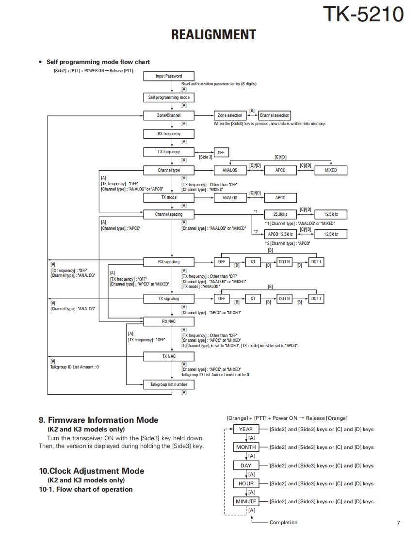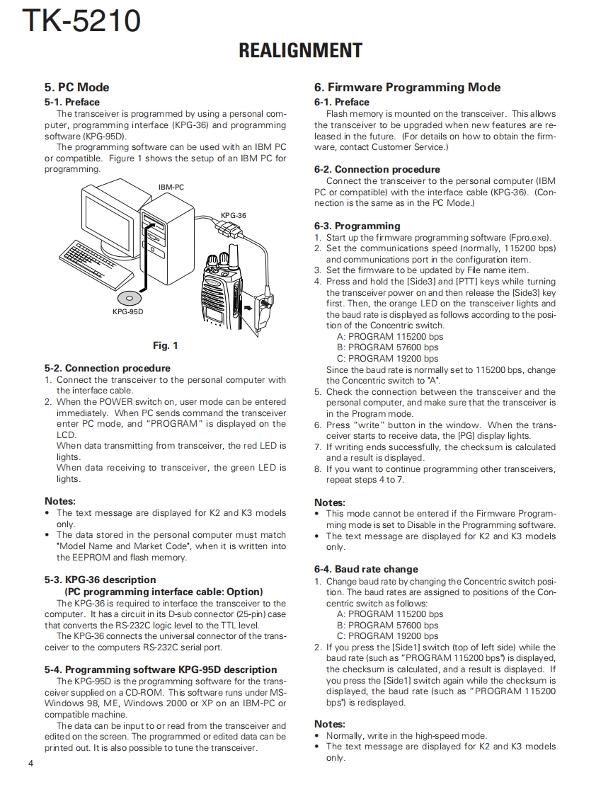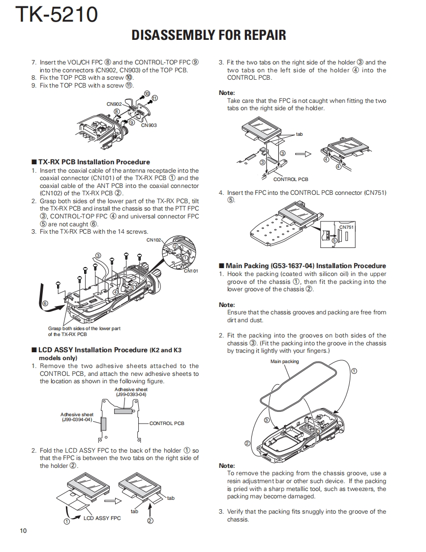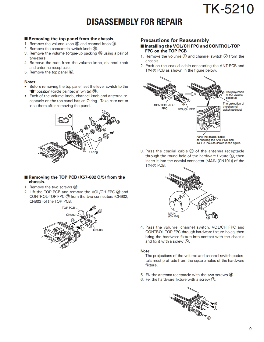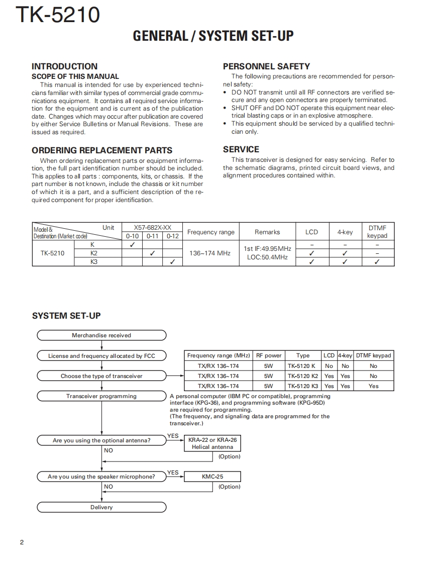 VHF APCO P25 TRANSCEIVERKENWOODTK-5210SERVICE MANUAL2004-11 PRINTED IN JAPANB51-8703-00(S)658Helical AntennaHelical AntennaHelical Antenna(KRA-22:Option)(KRA-22:Option)(KRA-22:Option)Knob (16CH)Knob(16CH)Knob(16CH)(K29-9323-03)(K29-9323-03)(K29-9323-03)Knob (Volume)Knob (Volume)Knob (Volume)(K29-9322-03)(K29-9322-03)(K29-9322-03)Key topKey topKey top(EMG)(EMG)(EMG)(K29-9319-03)(K29-9319-03)(K29-9319-03)kE00000DKENWOODKnob (PTT)Knob (PTT)Knob(PTT)(K299328-02)(K29-9328-02)(K29-9328-02)Key top(4key)(K29-9320-03)Main cabinetMain cabinetMain cabinet(A02-3875-01(4key)(DTMF)(A02.3877-01(A02.3879-01)Key top(DTMF)(K29-9321-13)TK-5210KTK-5210K2TK-5210K3Does not come with antenna.Antenna is available as an option.CONTENTSGENERAL..2ADJUSTMENT..............…40SYSTEM SET-UP.2PC BOARDREALIGNMENT........3TX-RX UNIT (X57-6820-XX).......................5.4DISASSEMBLY FOR REPAIR.................8SCHEMATIC DIAGRAM............................62CIRCUIT DESCRIPTION...........13INTERCONNECTION DIAGRAM.....74TERMINAL FUNCTION ........19BLOCK DIAGRAM.75SEMICONDUCTOR DATA...23LEVEL DIAGRAM...78COMPONENTS DESCRIPTION.25OPTIONAL ACCESSORIESPARTSKNB-31A/32N/33L...…79EXPLODED VIEW..37KSC-32..............…79PACKING...,39SPECIFICATIONS.....BACK COVER