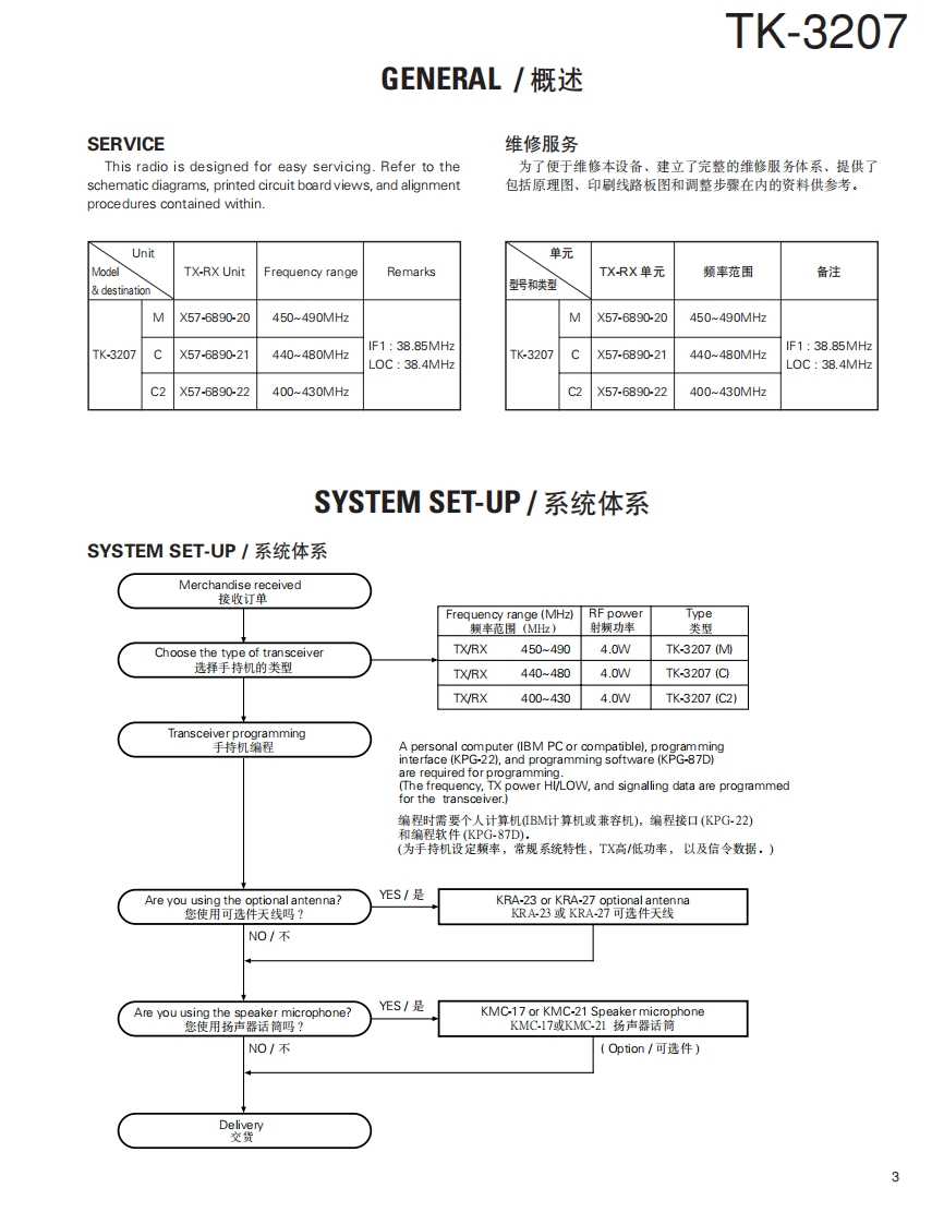 UHF FM TRANSCEIVER/UHF调频对讲机KENWOODTK-3207SERVICE MANUAL/维修手册2004-2 PRINTED IN JAPANB51-8680-00(S)663CONTENTSAntenna天线(T90-1039-05):MGENERAL.....2(T90-0798-15):CSYSTEM SET-UP...................(T90-0800-15):C2.3REALIGNMENT.4DISASSEMBLY FOR REPAIR.7Knob(CH-SELECTOR)CIRCUIT DESCRIPTION......旋钮(信道..12(K29-9318-03)TERMINAL FUNCTION........20Knob (VOLUME)SEMICONDUCTOR DATA...............20旋钮(音量)COMPONENTS DESCRIPTION......22K29-9309-03)PARTS LIST..24EXPLODED VIEW......30Cabinet assyPACKING….31机壳(A02-3851-23)AD JUSTMENT............32PC BOARDKENWOODTX-RX UNIT (X57-6890-XX).44SCHEMATIC DIAGRAM..48BLOCK DIAGRAM..52LEVEL DIAGRAM.54KSC-31 /KNB-29N....55KNB-30A /KBH-10.56Knob(PTT)SPECIFICATIONS】..57按钮PTD(K29-9308-03)