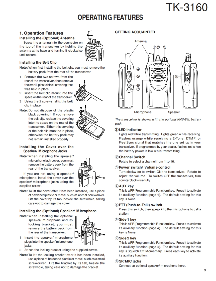UHF FM TRANSCEIVERKENWOODTK-3160SERVICE MANUAL2003-8 PRINTED IN JAPANB51-8653-00(S)1314CONTENTSGENERAL......2SYSTEM SET-UP…2OPERATING FEATURES....3REALIGNMENT...4DISASSEMBLY FOR REPAIR..5Antenna(KRA-27:Option)CIRCUIT DESCRIPTION ........7INSTALLATION11TERM INAL FU NCTION..........12Knob(CH-SELECTOR)SEMICONDUCTOR DATA ....(K29-9280-13).13COMPONENTS DESCRIPTION.14PARTS LIST.15Knob (VOLUME)EXPLODED VIEW..23(K29-9278-13)PACKING.24ADJUSTMENT........25PC BOARDCabinet assyTX-RX UNIT (X57-672X-XX).................30(A02-3826-33)】SCHEMATIC DIAGRAM.34BLOCK DIAGRAM.38LEVEL DIAGRAM...40KSC-30...41SPECIFICATIONS.BACK COVERKnob (PTT)-(K29-9279-03)Does not come with antenna.Antenna is available as an option.