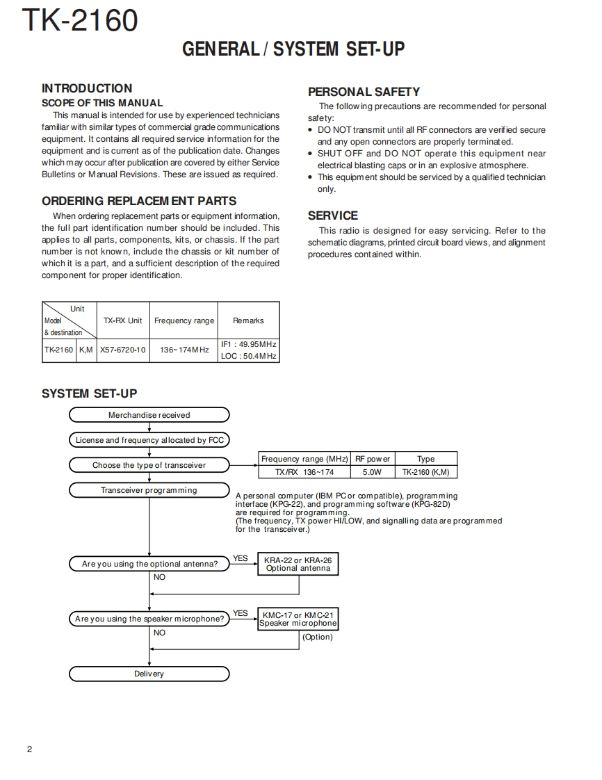 VHF FM TRANSCEIVERKENWOODTK-2160SERVICE MANUAL2003-8 PRINTED IN JAPANB51-8652-00(S)1214CONTENTSGENERAL......2SYSTEM SET-UP…2OPERATING FEATURES3REALIGNMENT.4DISASSEM BLY FOR REPAIR.............Antenna5CIRCUIT DESCRIPTION ........(KRA-26:Option).7INSTALLATION11TERMINAL FUNCTION........12Knob(CH-SELECTOR)SEMICONDUCTOR DATA ....(K29-9280-13).13COM PONENTS DESCRIPTION.14PARTS LIST..15Knob (VOLUME)EXPLODED VIEW..23(K29-9278-13)PACKING.24ADJUSTM ENT..........25PC BOARDCabinet assyTX-RX UNIT (X57-672X-XX).................30(A02-3826-33)SCHEMATIC DIAGRAM.34BLOCK DIAGRAM.38LEV且DIAGRAM.40KSC30….41SPECIFICATIONS..BACK COVERKnob (PTT)(K29-9279-03)Does not come with antenna.Antenna is available as an option.