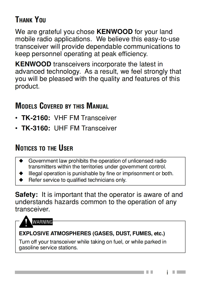 INSTRUCTION MANUALMODE D'EMPLOIMANUAL DE INSTRUCCIONESMANUALE DI ISTRUZIONIBEDIENUNGSANLEITUNGGEBRUIKSAANWIJZINGKENWOODTK-2160/TK-3160VHF FM TRANSCEIVER/UHF FM TRANSCEIVEREMETTEUR-RECEPTEUR FM VHF/EMETTEUR-RECEPTEUR FM UHFTRANSCEPTOR DE FM VHFTRANSCEPTOR DE FM UHFRICETRASMETTITORE FM VHF/RICETRASMETTITORE FM UHFVHF-FM-TRANSCEIVER/UHF-FM-TRANSCEIVERVHF FM ZENDONTVANGER/UHF FM ZENDONTVANGERKENWOOD CORPORATION©B62-1788-00(E,E3)09080706050403020100