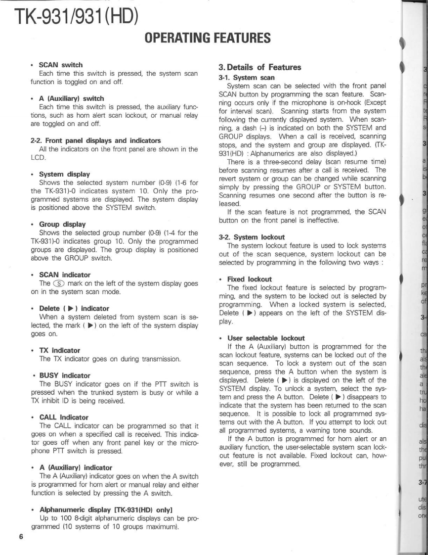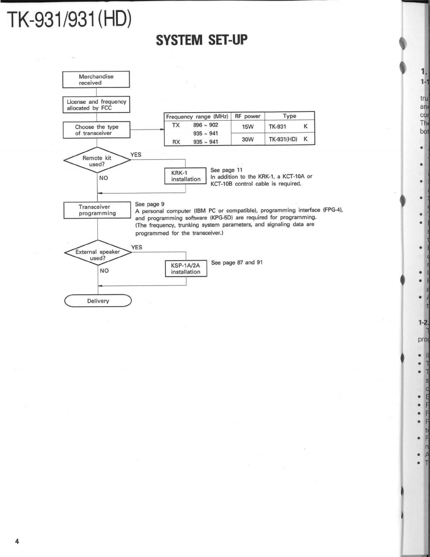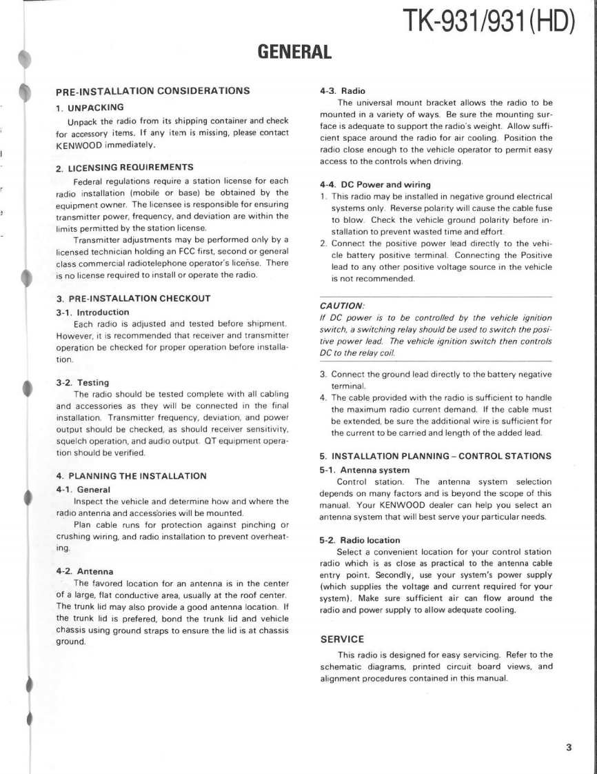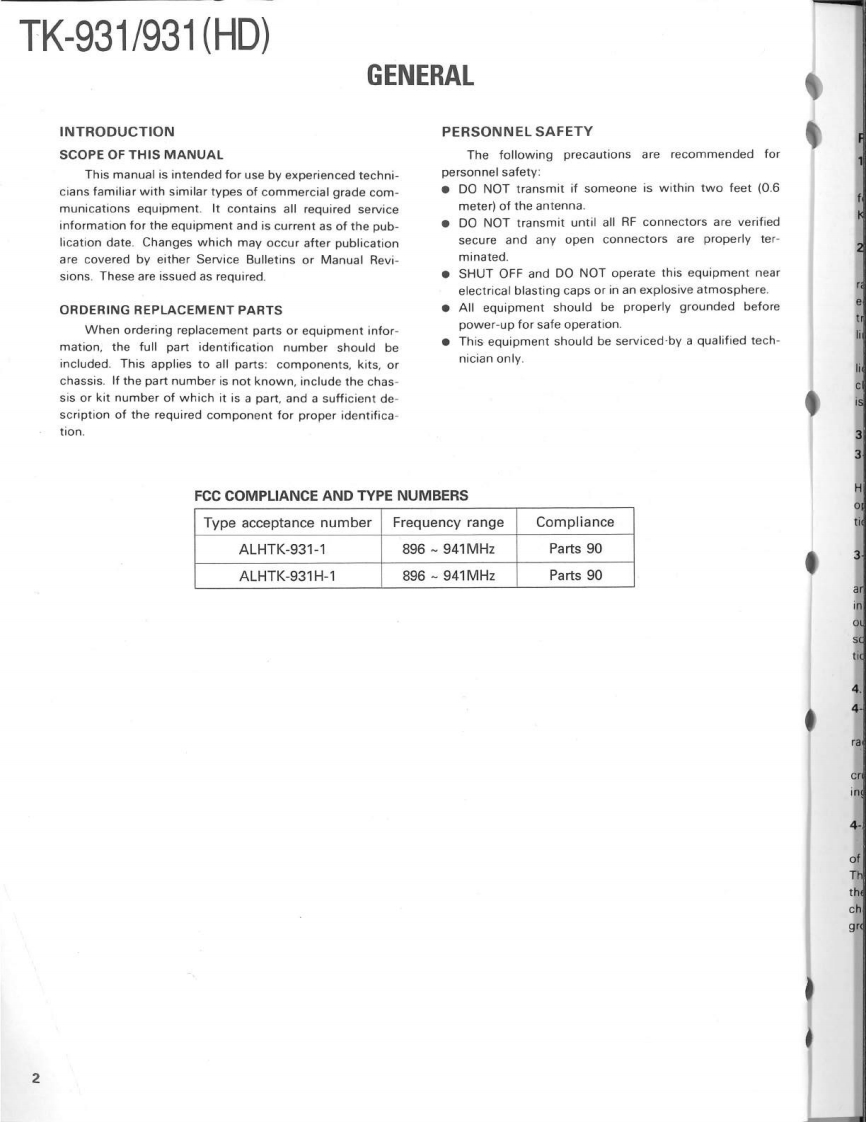 900MHz FM TRUNKED TRANSCEIVERTK-931/931(HD)KENWOODSERVICE MANUAL1990-8 PRINTED IN JAPANB51-8086-00(0)1103CasePanel assy(A01-2003-12)(A62-0014-03)KENWOODRectangular receptacleKey topDressing plate(E08-0673-05)(K29-4566-03)(A62-0017-04)CONTENTSGENERAL.......PC BOARD VIEWS TK-931SYSTEM SET-UP…4TX-RX UNIT(X57-3570-11)-72OPERATION FEATURES.....................5.LCD ASS'Y(B38-0333-05)…74INSTALLATION.11SCHEMATIC DIAGRAM TK-931......DISASSEMBLY FOR REPAIR16SCHEMATIC DIAGRAM TK-931(HD).79LEVEL DIAGRAM.18PC BOARD VIEWS TK-931(HD)BLOCK DIAGRAM.19TX-RX UNIT(X57-3560-11)..83CIRCUIT DESCRIPTION...21LCD ASS'Y(B38-0322-05)…85SEMICONDUCTOR DATA..........28KSP-1A (EXTERNAL SPEAKER).......86DESCRIPTION OF COMPONENTS38KSP-2A (AMPLIFIED EXTERNAL SPEAKER).......90PARTS LST42KPS-10A (DC POWER SUPPLY).96EXPLODED VIEW.....62KCT-10A/10B (CONTROL CABLE)103PACKING.63KPG-4 (PROGRAMMING INTERFACE)......103ADJUSTMENT.............KRK-1 (REMOTE KIT).103TERMINAL FUNCTIONS.71SPECIFICATIONSBACK COVER