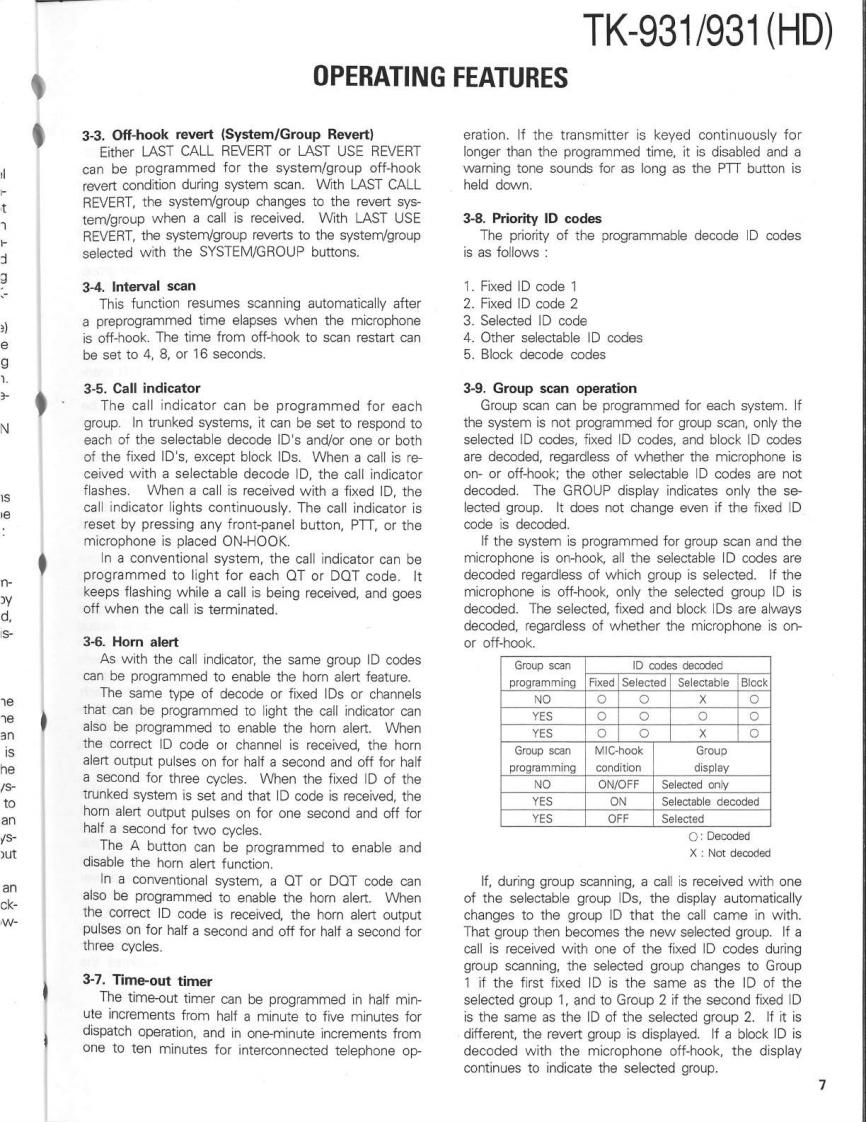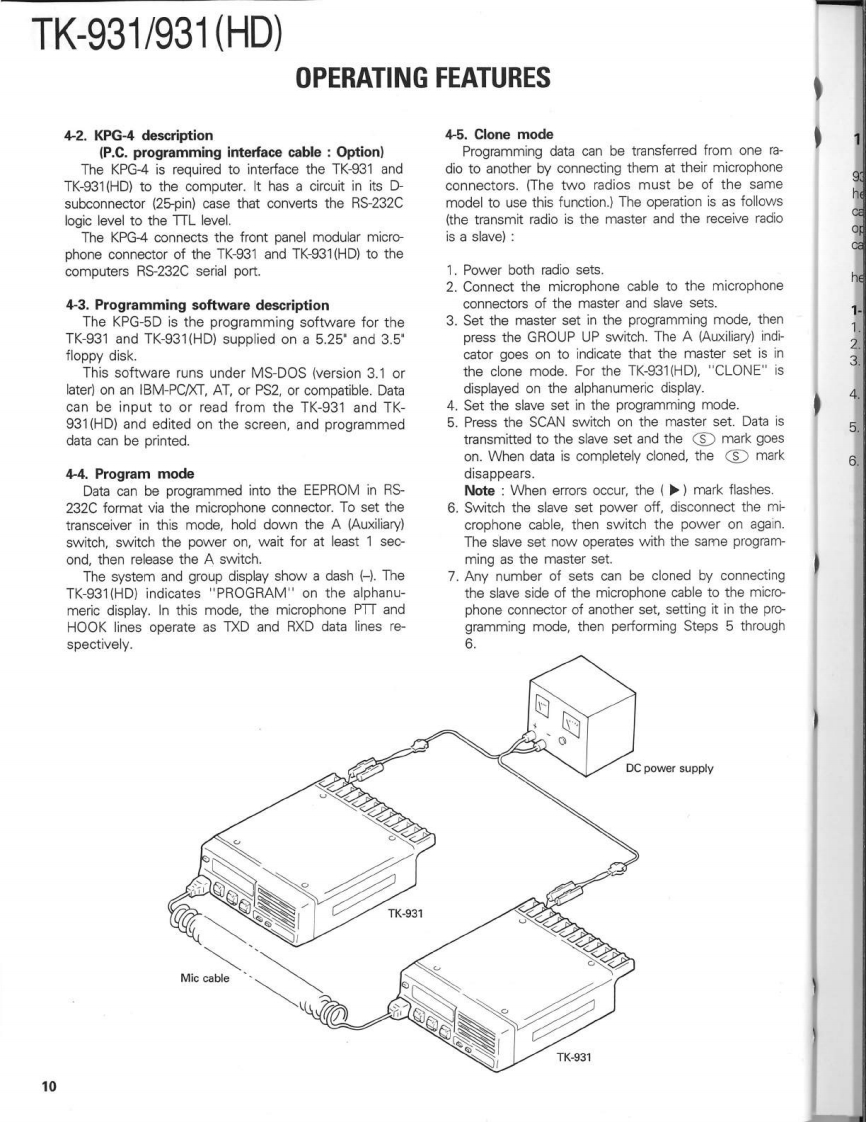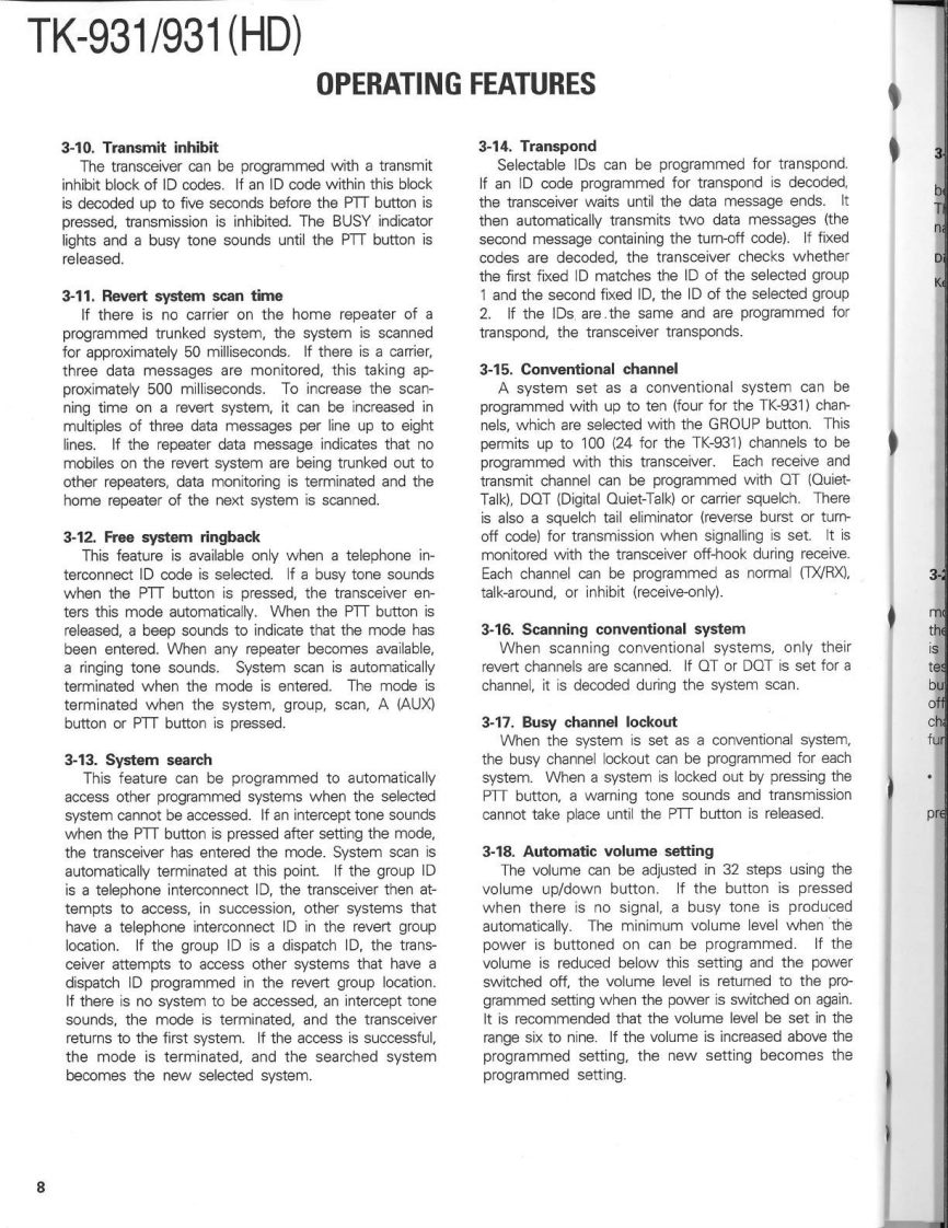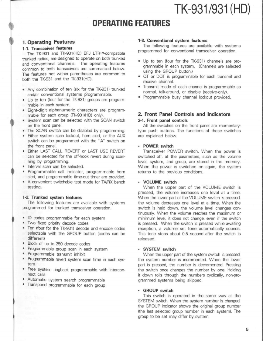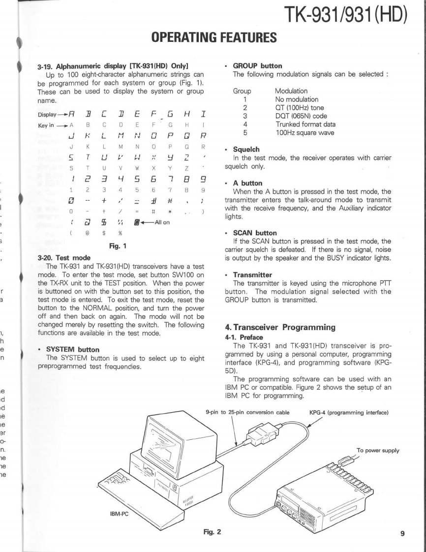 900MHz FM TRUNKED TRANSCEIVERTK-931/931(HD)KENWOODSERVICE MANUAL1990-8 PRINTED IN JAPANB51-8086-00(0)1103CasePanel assy(A01-2003-12)(A62-0014-03)KENWOODRectangular receptacleKey topDressing plate(E08-0673-05)(K29-4566-03)(A62-0017-04)CONTENTSGENERAL.......PC BOARD VIEWS TK-931SYSTEM SET-UP…4TX-RX UNIT(X57-3570-11)-72OPERATION FEATURES.....................5.LCD ASS'Y(B38-0333-05)…74INSTALLATION.11SCHEMATIC DIAGRAM TK-931......DISASSEMBLY FOR REPAIR16SCHEMATIC DIAGRAM TK-931(HD).79LEVEL DIAGRAM.18PC BOARD VIEWS TK-931(HD)BLOCK DIAGRAM.19TX-RX UNIT(X57-3560-11)..83CIRCUIT DESCRIPTION...21LCD ASS'Y(B38-0322-05)…85SEMICONDUCTOR DATA..........28KSP-1A (EXTERNAL SPEAKER).......86DESCRIPTION OF COMPONENTS38KSP-2A (AMPLIFIED EXTERNAL SPEAKER).......90PARTS LST42KPS-10A (DC POWER SUPPLY).96EXPLODED VIEW.....62KCT-10A/10B (CONTROL CABLE)103PACKING.63KPG-4 (PROGRAMMING INTERFACE)......103ADJUSTMENT.............KRK-1 (REMOTE KIT).103TERMINAL FUNCTIONS.71SPECIFICATIONSBACK COVER