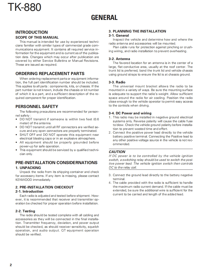 UHF FM TRANSCEIVERTK-880KENWOODSERVICE MANUALREVISEDE·E3-E4 versions2002-2 PRINTED IN JAPANB51-8524-20(N)387This Service Manual was revised based on the servicemanual as per parts No.B51-8524-10,in order to includenew variants with the following destination codes:E4.Panel assyCabinet(Upper)Key top(A62-0642-03)(A01-2165-23)(K29-9105-021KENWOODKENWOODDDCALLCONTENTSGENERAL..…2PLL/VC0(X58-4722-XX)..56OPERATING FEATURES.3SUB UNIT(X58-4850-10).56REALGNMENT.16TX-RX UNIT(X57-6152-XX)(A/21:E,E4..57INSTALLATION.......19TX-RX UNIT(X57-6152-XX)(B/2):E,E4..63CIRCUIT DESCRIPTION.26TX-RX UNIT(X57-6372-70)A/2):3.…67SEMICONDUCTOR DATA...31TX-RX UNIT(X57-6372-70)(B/2):3.…73DESCRIPTION OF COMPONENTS.33SCHEMATIC DIAGRAM (E,E4).........77PARTS LIST…35SCHEMATIC DIAGRAM (E3).........85EXPLODED VIEW.....45BLOCK DIAGRAM.....93PACKING46LEVEL DIAGRAM..96ADJUSTMENT…47TERMINAL FUNCTION98PC BOARD VIEWSSPECIFICATIONS....................99