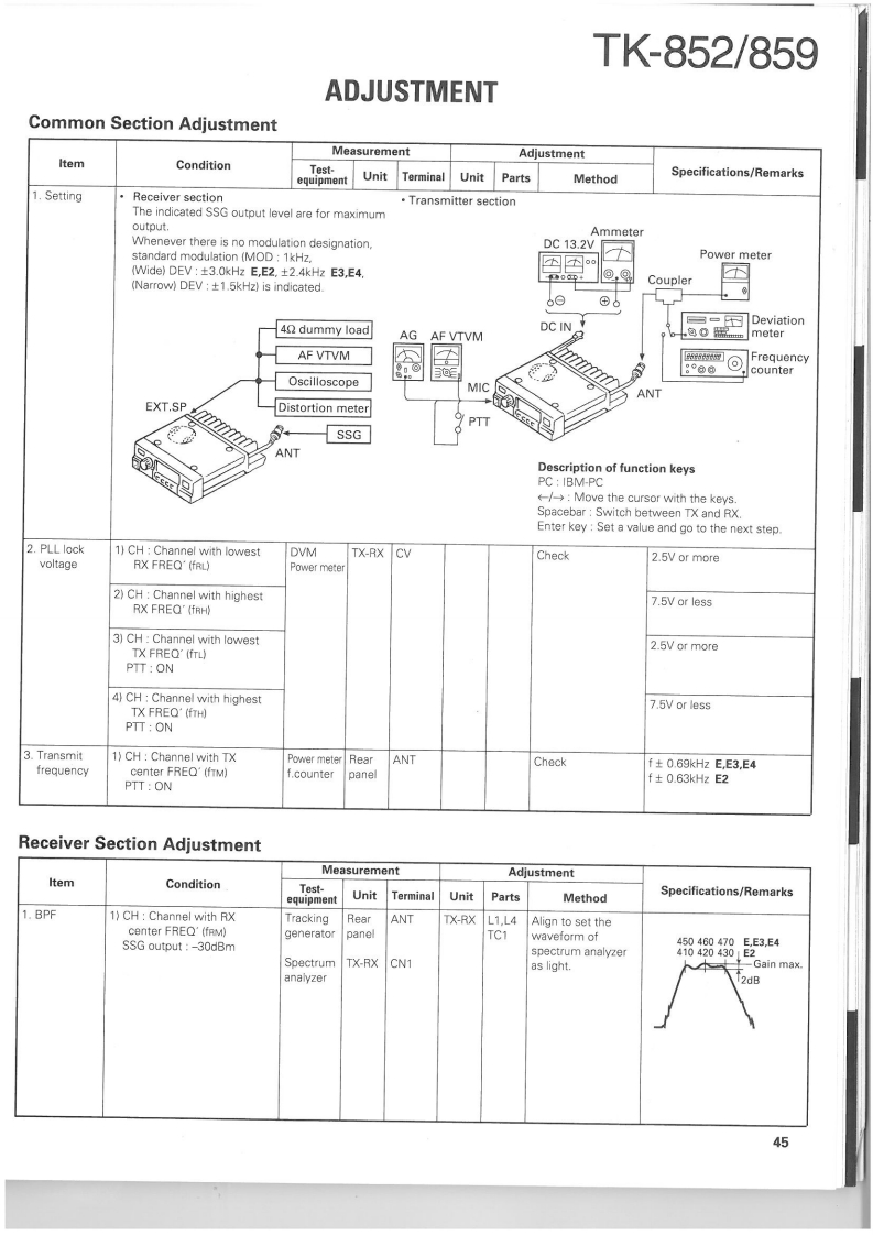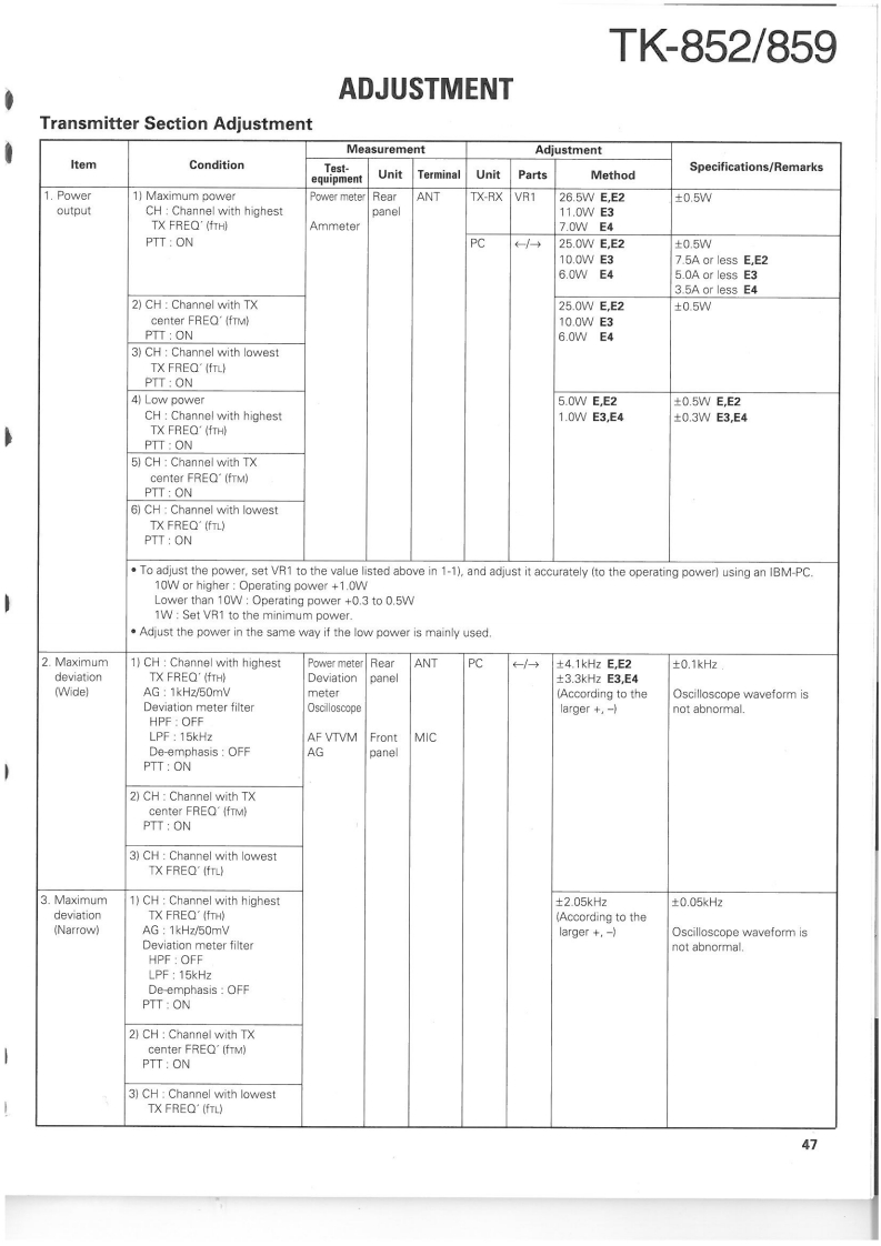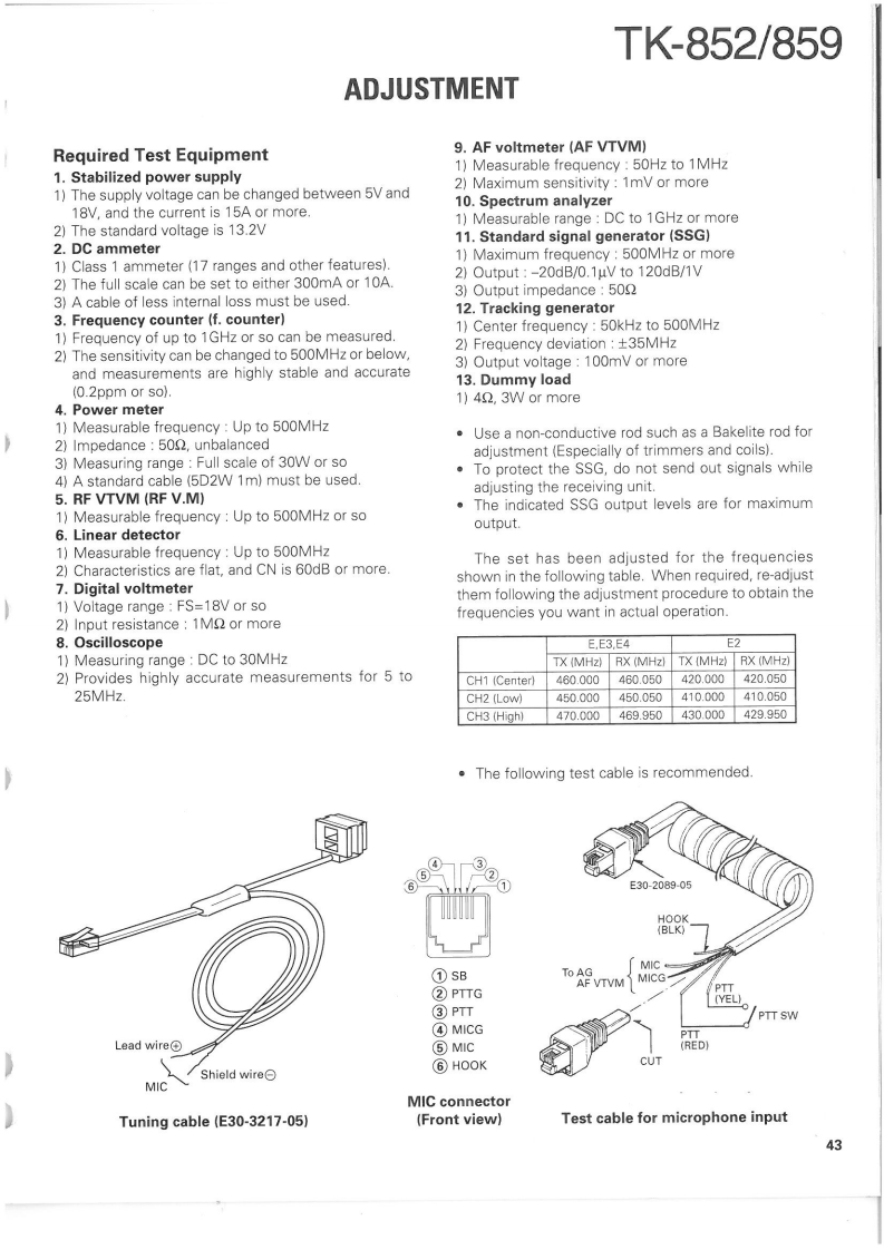 TK-852/859ADJUSTMENTAdjustment Mode·Overview2.One-point adjustmentThe transmission output,deviation,QT,DQT,andWhen the three-point adjustment is carried out,thesquelch can be adjusted by using the KPG-28D.Therecenter(1CH)value is automatically set to magnificationare three-point adjustment and one-point adjustment.rate 1.Therefore,it is not required to perform one-point adjustment.(However,one-point adjustment is1.Three-point adjustmentperformed for squelch only.)(Three-point adjustment is carried out for each desti-In the one-point adjustment,all frequencies in thenation in the factory.After a desired frequency is writ-band can be re-adjusted using the center(CH1)valueten,each rating is checked.)as magnification rate 1.If a frequency is fine-adjusted,In the three-point adjustment,the inclination of ad-a desired frequency is set for 4CH or subsequent chan-justment is obtained based on the center(1CH),lownel (4CH to 8CH),and the frequency is re-adjusted.In(2CH),and high (3CH)frequencies in the frequencythis case,all frequencies in the band are also re-ad-range in which the performance of the transceiver isjusted.guaranteed.The microprocessor calculates the adjust-ment value of the frequency in the band automaticallyInclinationaccording to the inclination.Note:Three-point tuning for the KPG-28D(Adjustment of the center,lower limit,and up-per limit frequencies(Three-point tuning))FrequencyThe electronic volume can be tuned at the centerLOW CENHIlower limit,and upper limit frequencies.(Three-pointThree-point adjustmenttuning)1.Hold down [Alt]+[Shift]and press [F5]on the Mainscreen.The Password Window shown below willopen.PasswordoneA juawsn!pvPasswordFrequencyLOWCENHIOne-point adjustmentNote:One-point adjustment is used by dealers for fine adjustment.All the values are shifted automatically by moving one point2.Enter the password.(3TUNING)(adjustment value).3.Press [Enter].If the password is correct,the TestMode Window opens.Notes:1)When the microprocessor is replaced,the mainmode item of optional feature should be enabledusing the KPG-28D.The main program appropriatefor the version of the microprocessor should bewritten into the flash memory.In this case,re-ad-justment is not required.(If the main item is notenabled,the main program is not written into theflash memory.)2)If the flash memory is replaced,the main programshould be written into the new flash memory.Then,re-adjustment should be carried out using the KPG-28D.In this case,set the frequency,then perform three-point adjustment.Perform one-point adjustment ifnecessary.42