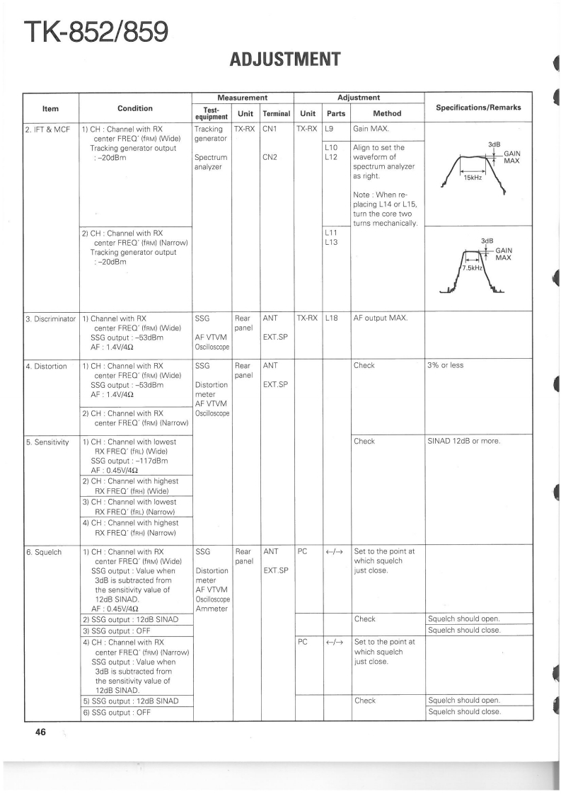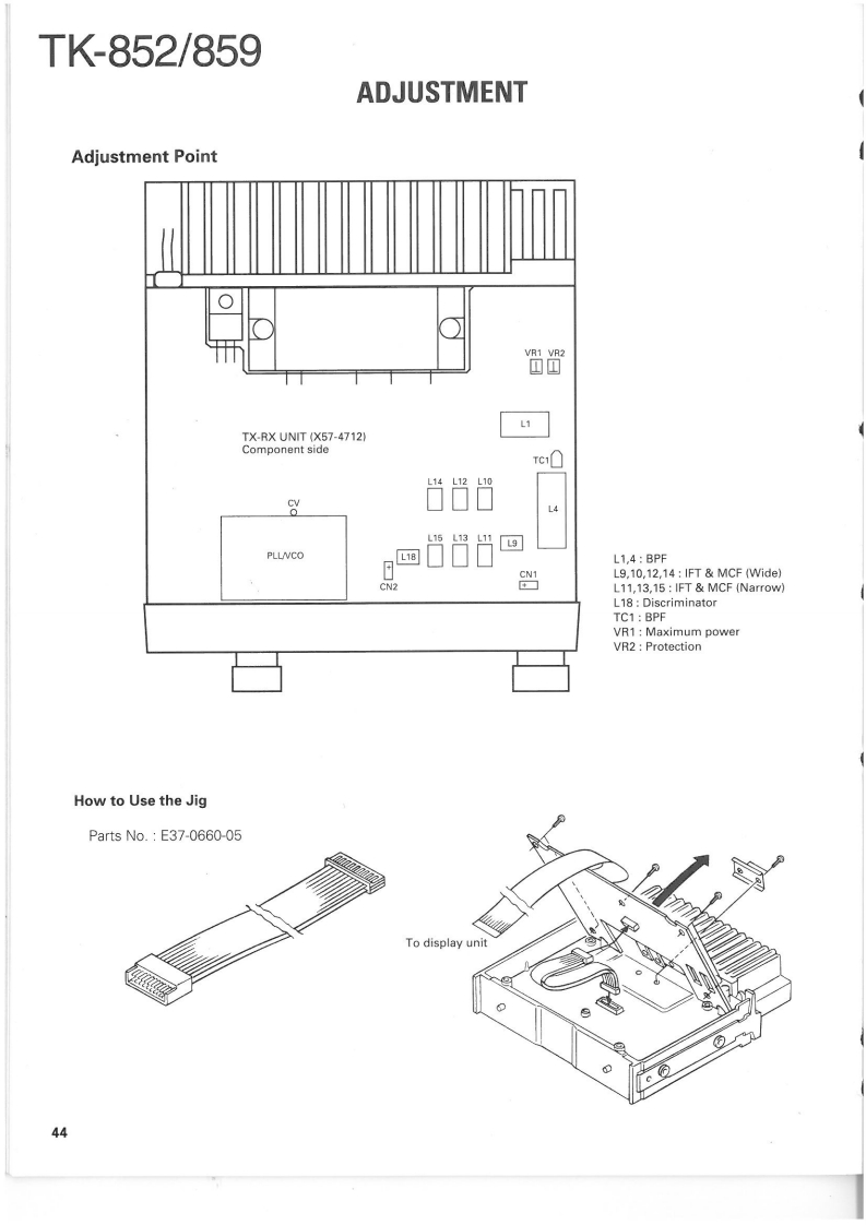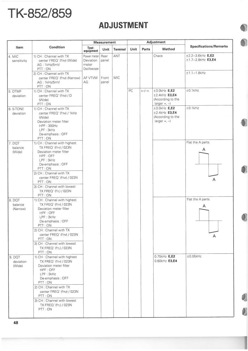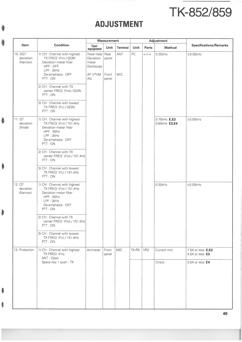 TK-852/859ADJUSTMENTAdjustment Mode·Overview2.One-point adjustmentThe transmission output,deviation,QT,DQT,andWhen the three-point adjustment is carried out,thesquelch can be adjusted by using the KPG-28D.Therecenter(1CH)value is automatically set to magnificationare three-point adjustment and one-point adjustment.rate 1.Therefore,it is not required to perform one-point adjustment.(However,one-point adjustment is1.Three-point adjustmentperformed for squelch only.)(Three-point adjustment is carried out for each desti-In the one-point adjustment,all frequencies in thenation in the factory.After a desired frequency is writ-band can be re-adjusted using the center(CH1)valueten,each rating is checked.)as magnification rate 1.If a frequency is fine-adjusted,In the three-point adjustment,the inclination of ad-a desired frequency is set for 4CH or subsequent chan-justment is obtained based on the center(1CH),lownel (4CH to 8CH),and the frequency is re-adjusted.In(2CH),and high (3CH)frequencies in the frequencythis case,all frequencies in the band are also re-ad-range in which the performance of the transceiver isjusted.guaranteed.The microprocessor calculates the adjust-ment value of the frequency in the band automaticallyInclinationaccording to the inclination.Note:Three-point tuning for the KPG-28D(Adjustment of the center,lower limit,and up-per limit frequencies(Three-point tuning))FrequencyThe electronic volume can be tuned at the centerLOW CENHIlower limit,and upper limit frequencies.(Three-pointThree-point adjustmenttuning)1.Hold down [Alt]+[Shift]and press [F5]on the Mainscreen.The Password Window shown below willopen.PasswordoneA juawsn!pvPasswordFrequencyLOWCENHIOne-point adjustmentNote:One-point adjustment is used by dealers for fine adjustment.All the values are shifted automatically by moving one point2.Enter the password.(3TUNING)(adjustment value).3.Press [Enter].If the password is correct,the TestMode Window opens.Notes:1)When the microprocessor is replaced,the mainmode item of optional feature should be enabledusing the KPG-28D.The main program appropriatefor the version of the microprocessor should bewritten into the flash memory.In this case,re-ad-justment is not required.(If the main item is notenabled,the main program is not written into theflash memory.)2)If the flash memory is replaced,the main programshould be written into the new flash memory.Then,re-adjustment should be carried out using the KPG-28D.In this case,set the frequency,then perform three-point adjustment.Perform one-point adjustment ifnecessary.42