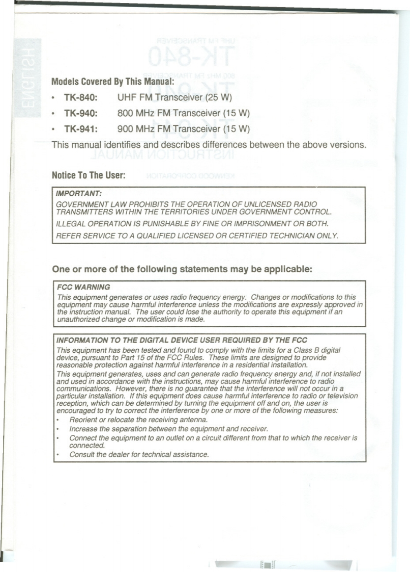 TK-840TK-940KENWOODTK-941UHF FM TRANSCEIVER800 MHz FM TRANSCEIVER900 MHz FM TRANSCEIVERINSTRUCTION MANUALEMETTEUR-RECEPTEUR FM UHFEMETTEUR-RECEPTEUR FM 800 MHzEMETTEUR-RECEPTEUR FM 900 MHzMODE D'EMPLOITRANSCEPTOR FM DE UHFTRANSCEPTOR FM DE 800 MHzTRANSCEPTOR FM DE 900 MHzMANUAL DE INSTRUCCIONESKENWOOD CORPORATION©B62-0459-10(K)12111009080706050403