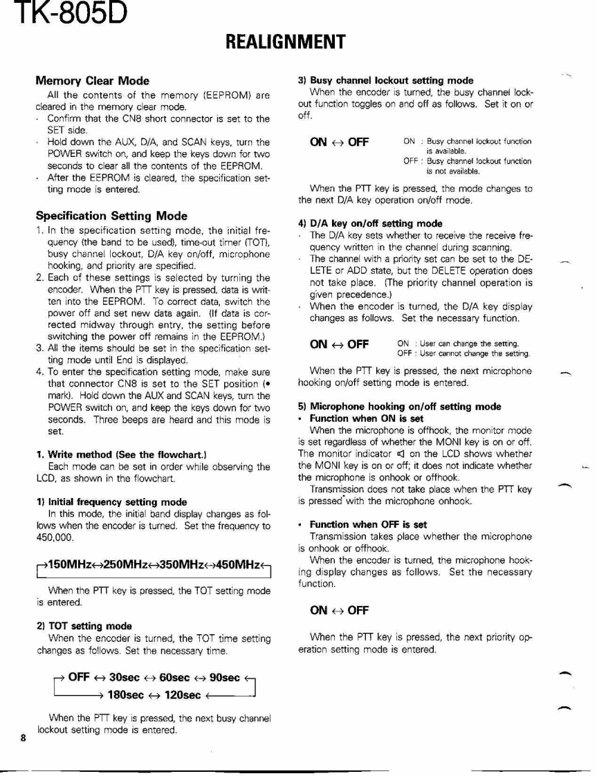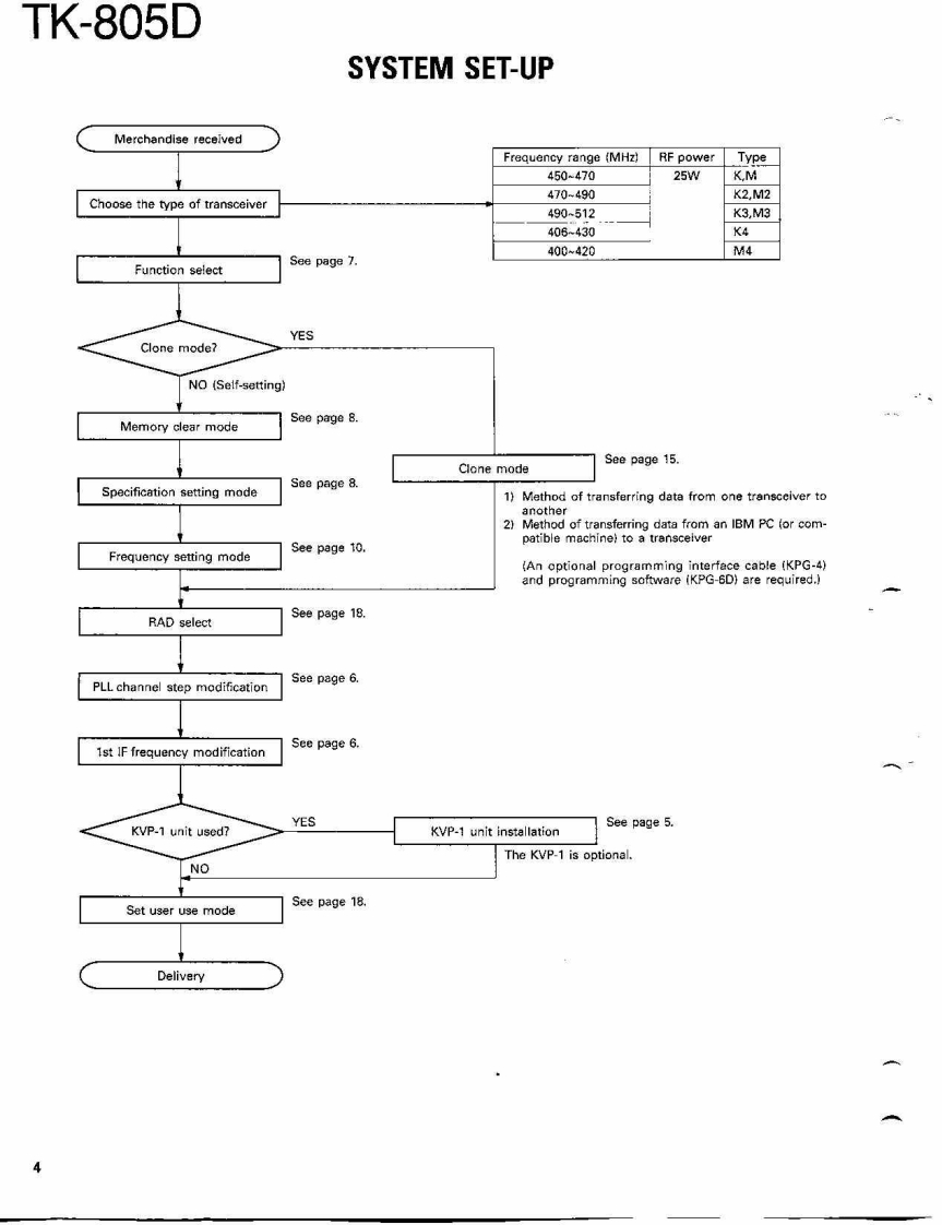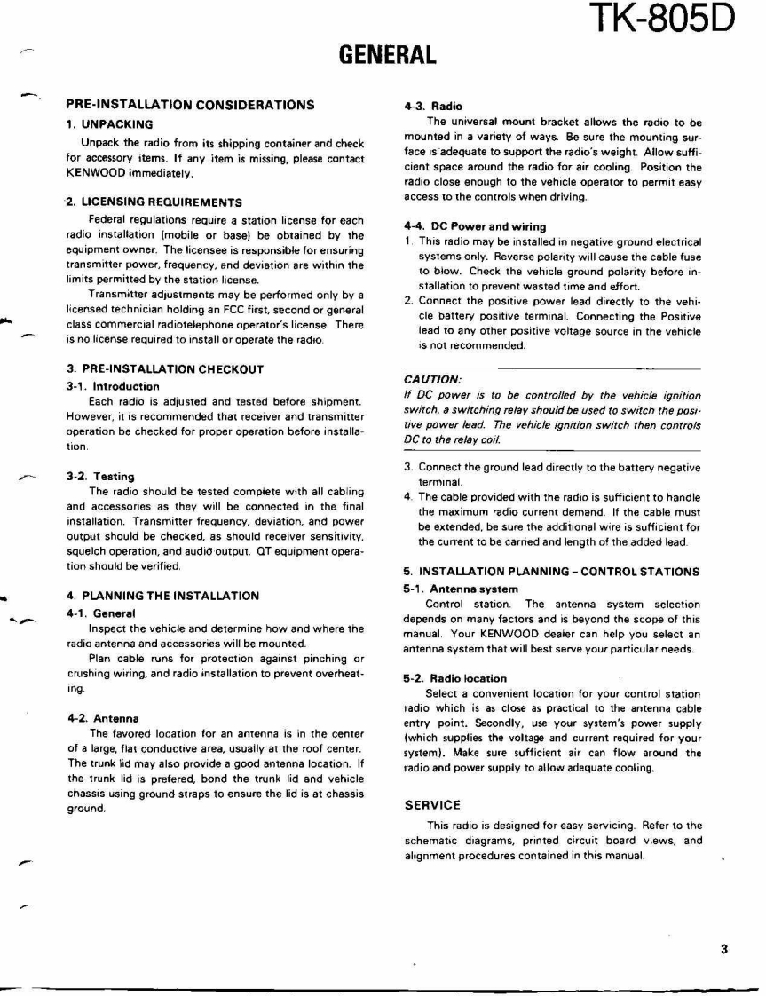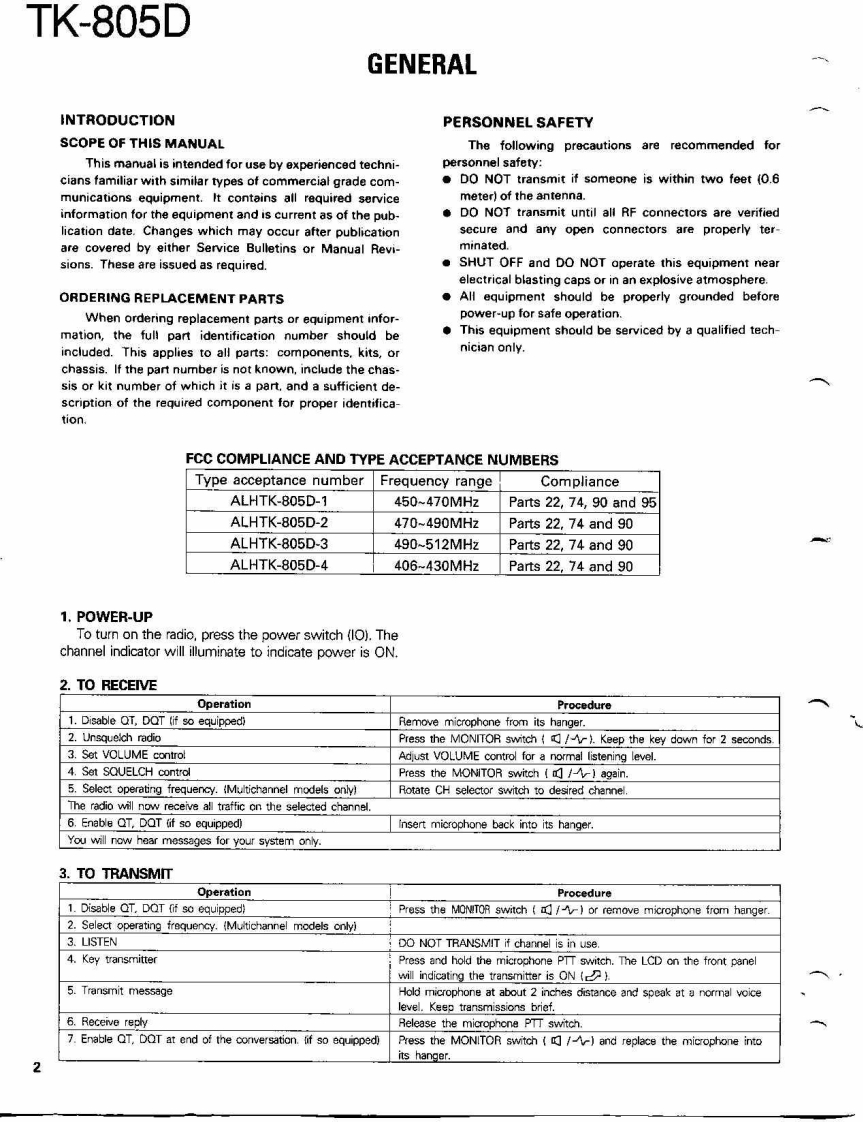 COMPACT SYNTHESIZED UHF FM TWO-WAY RADIOTK-805DKENWOODSERVICE MANUAL1991-3 PRINTED IN JAPANB51-8108-00(O)1139Microphone(T91-0362-151:K,K2.K3,K4(T91-0509-05):M,M2.M3,M4KENWOODKnob (POWER)Knob (VOL)KnobKnob (CH)Panel ass'y(K27-3052-04)K29-4534-04{K29-4535-04)×5K29-4533-04j(A62-0093-03)Photo is K.K2,K3,K4 type.CONTENTSGENERAL.42PACKING…47SYSTEM SET-UP,4ADJUSTMENT............48INSTALLATION5TERMINAL FUNCTIONS52MODIFICATION..6CIRCUIT DIAGRAMS/PC BOARD VIEWSREALGNMENT....7PLL(X58-3700-XX)4-53DISASSEMBLY FOR REPAIR..........21APC(X59-3130-00.55LEVEL DIAGRAMHPF(X59-3740-11】…55BLOCK DIAGRAM…23TX-RX UNIT (X57-3850-XX).....56CIRCUIT DESCRIPTON..25SCHEMATC DIAGRAM....59SEMICONDUCTOR DATA.......…30KVP-1 (DIGITAL RECORDING UNIT)463DESCRIPTION OF COMPONENTS32KPG-4 (PROGRAMMING INTERFACE).....69PARTS UIST4…33SPECIFICATIONS.BACK COVEREXPLODED VIEW.....46