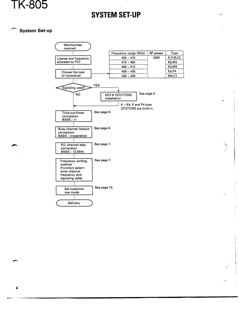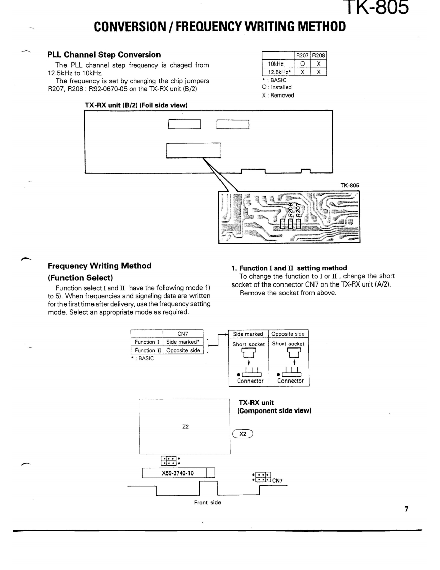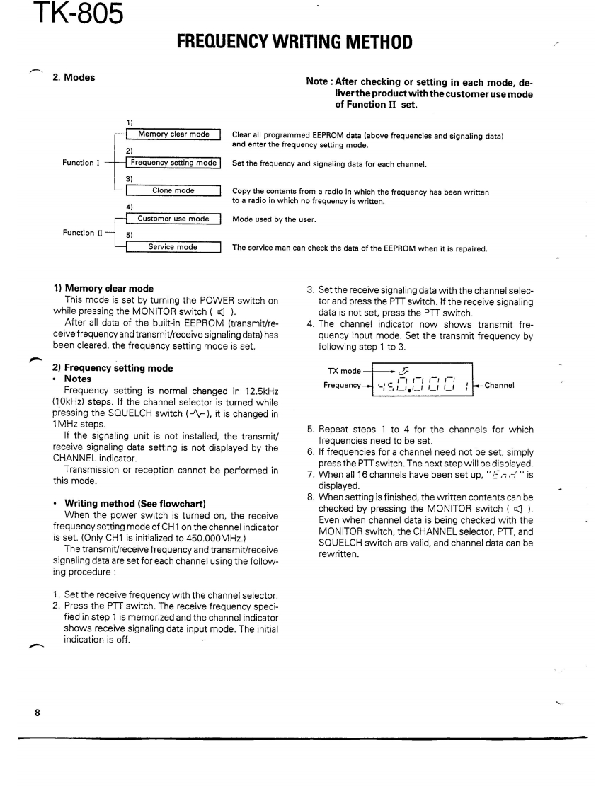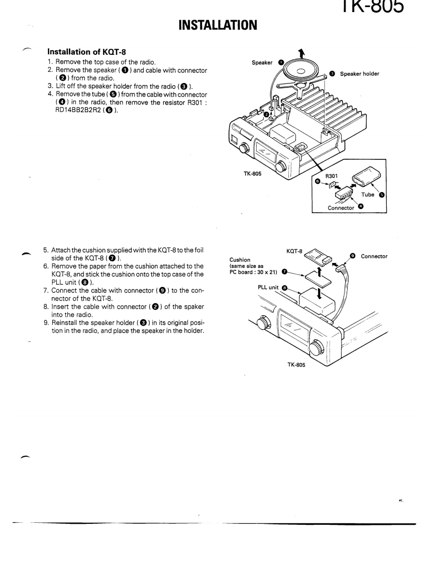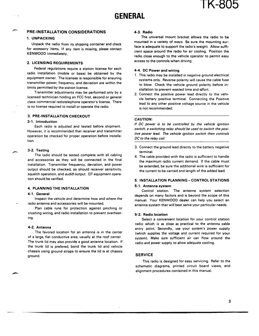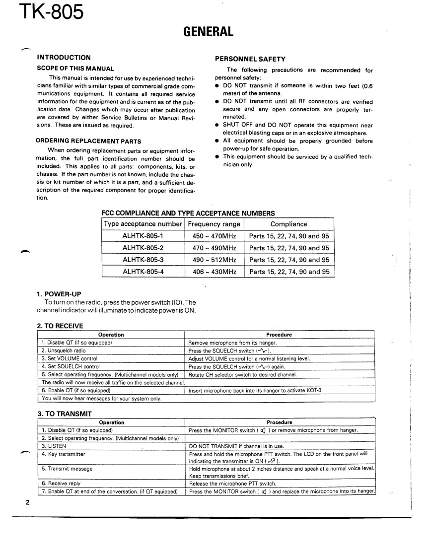 COMPACT SYNTHESIZEDUHF FM TWO-WAY RADIOKENWOODTK-805SERVICE MANUAL1989-10 PRINTED IN JAPANB51-8019-000)1253KENWOODKENWOODch 16CONTENTSGENERAL2PARTS LIST…21SYSTEM SET-UP…4EXPLODED VIEW......31INSTALLATION5PACKING…32CONVERSION..............6ADJUSTMENT............33FREQUENCY WRITING METHOD.7TERMINAL FUNCTIONS...36DISASSEMBLY FOR REPAIR..11PC BOARD VIEWSLEVELDIAGRAM....12TX-RX UNIT (X57-344X-XX).37BLOCK DIAGRAM…13SCHEMATIC DIAGRAM........................39CIRCUIT DESCRIPTION.5KQT-8(QT/CTCSS)…42DESCRIPTION OF COMPONENTS...20SPECIFICATIONS.BACK COVER