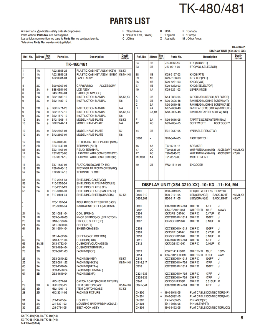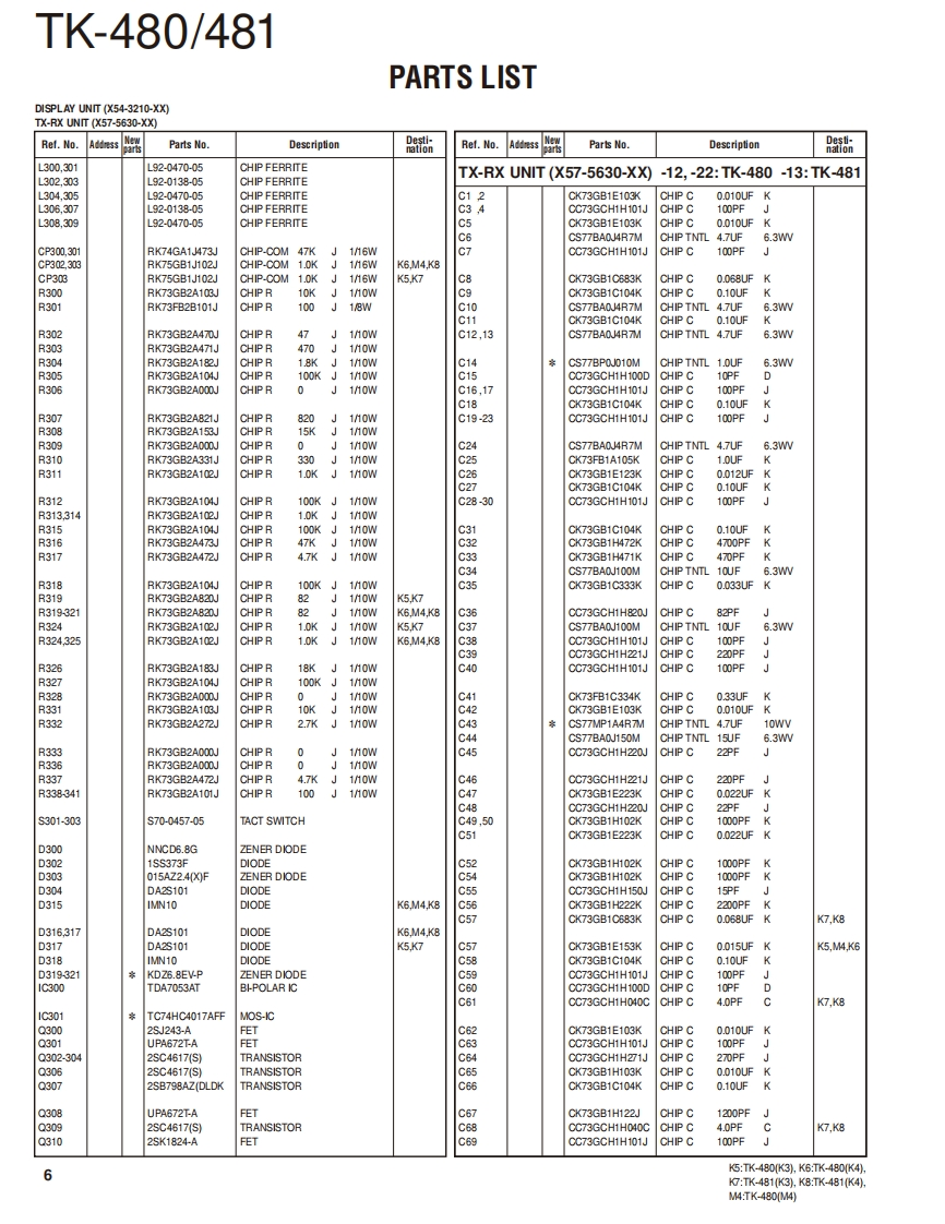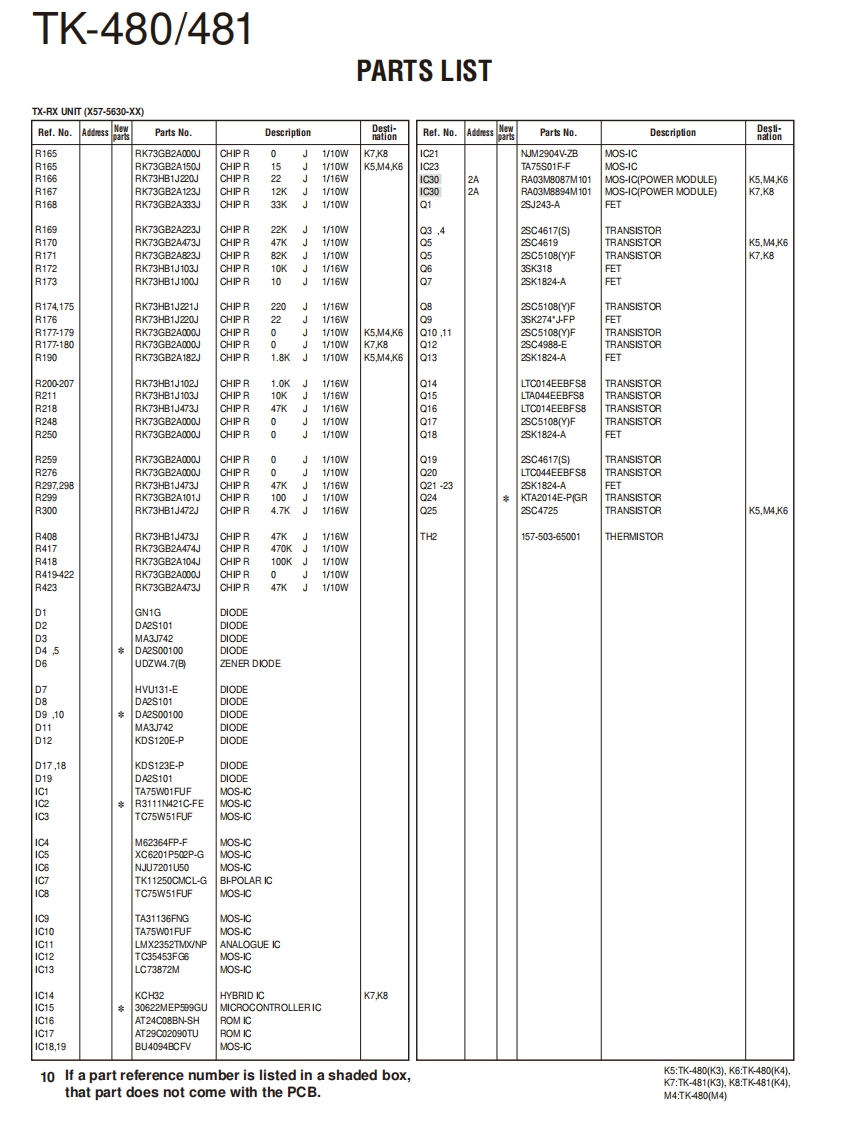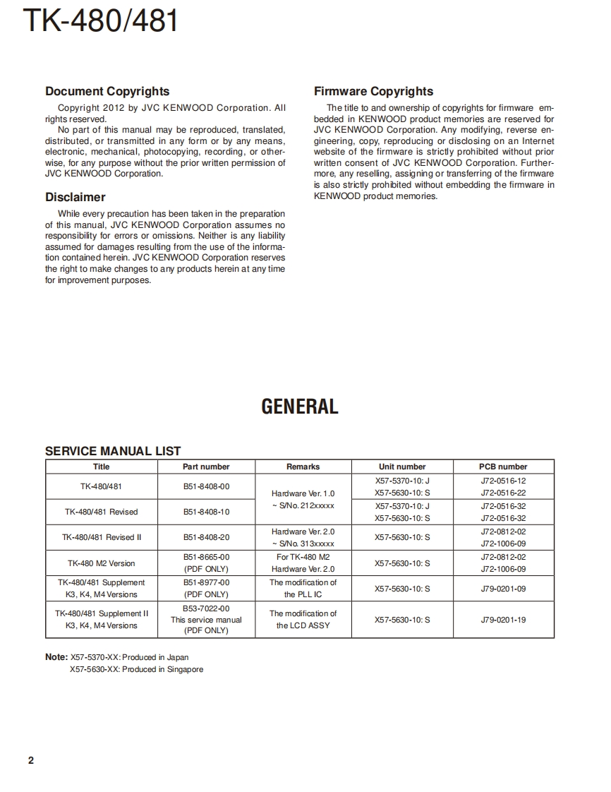 800MHz/900MHz FM TRANSCEIVERTK-480/481KENWOODJVC KENWOOD CorporationSERVICE MANUALSUPPLEMENT II K3,K4,M4 versions2012-4 PRINTED IN JAPANB53-7022-00Y)PDFThis service manual has been revised due to the modification of the LCD ASSY and is-sues it as a supplemental manual.This service manual applies to products with B2200001 (TK-480),B2200001 (TK-481)or subsequent serial numbers.Refer to the TK-480/481 series service manual for anyinformation which has not been covered in this manual.Knob(Selector)(K29-5232-03)Knob (VOL)(K29-5231-03)Whip antenna-(T90-0636-25):TK480(T90-0640-25):TK-481Panel assyBadgeKENWOOD】(A62-0981-04)(B43-1139-04)CONTENTSKnob (PTT)(K29-5157-03)GENERAL.…2DISASSEMBLY FOR REPAIR..........3PARTS LIST.........040A0间0CEXPLODED VIEW.............11Packing(G53-084122:K4PC BOARDTX-RX UNIT(X57-5630-XX)..12SCHEMATIC DIAGRAM......................16Cabinet assy(A02-3659-23):K4CAUTIONIllustration is TK-480/481 K4 type.When using an external power connector,please use with maximum final module protec-tion of 9V.