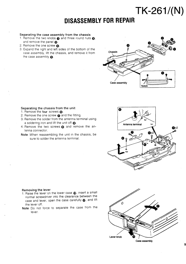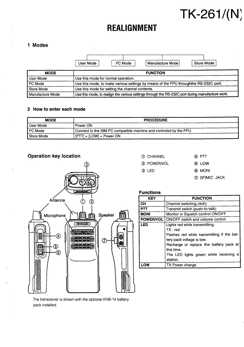 VHF FM TRANSCEIVERKENWOODTK-261/(N)SERVICE MANUAL1997-10 PRINTED IN JAPANB51-8413-00(B)478Helical antennaT90-0450-05】Knob(CHANNEL)(K29-5166-03)CONTENTSGENERAL…2REALIGNMENT..3KnobDISASSEMBLY FOR REPAIR........5(VOLUME)(K29-5168-13)CIRCUIT DESCRIPTION7SEMICONDUCTOR DATA......13DESCRIPTION OF COMPONENTS..15Key top(PTT)-PARTS LIST17(K29-50e9-12)EXPL0 DED VIEW…23PACKING.24ADJUSTMENT25PC BORD VIEWSTX-RX UNIT (X57-5522-XX)...31Cabinet assySCHEMATIC DIAGRAM37A02-2166-13)BLOCK DIAGRAM..41LEVEL DIAGRAM.43KNB-14/15A (Ni-Cd BATTERY).44CHARGER/AC ADAPTER...45SPECIFICATIONS...BACK COVERCAUTION:When using an external power connector,please use with maximum final moduleprotection of 9V.