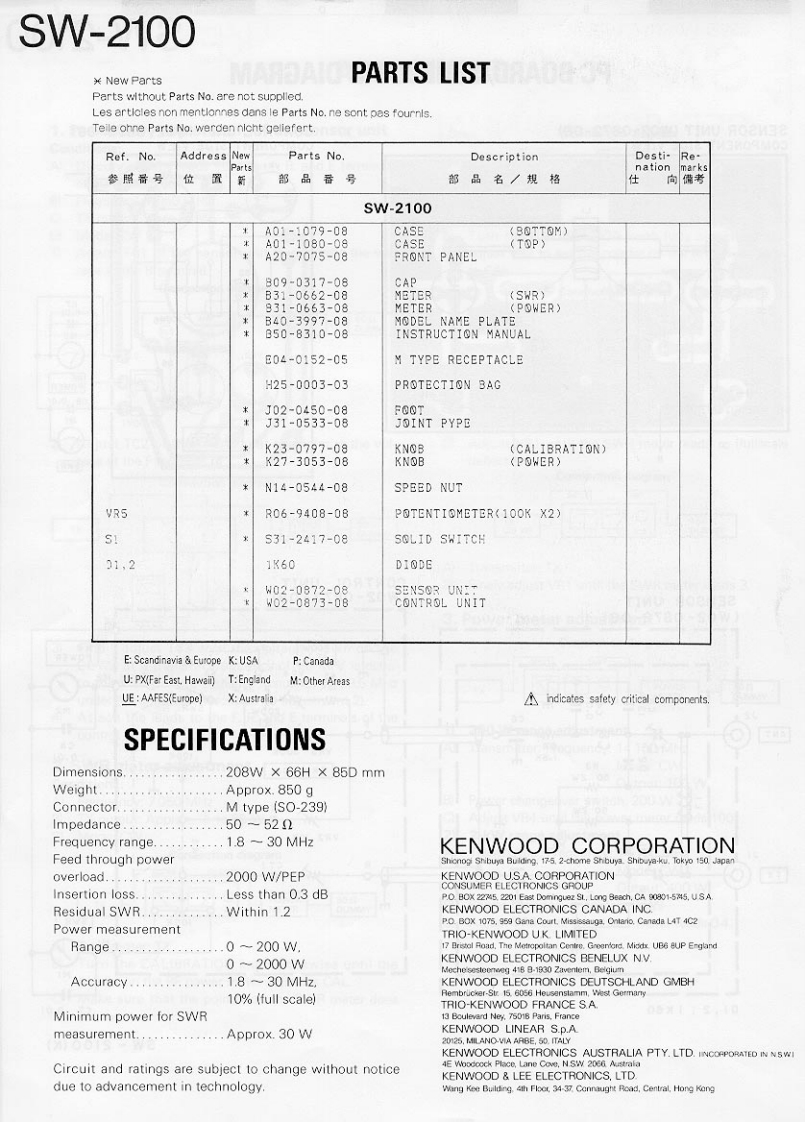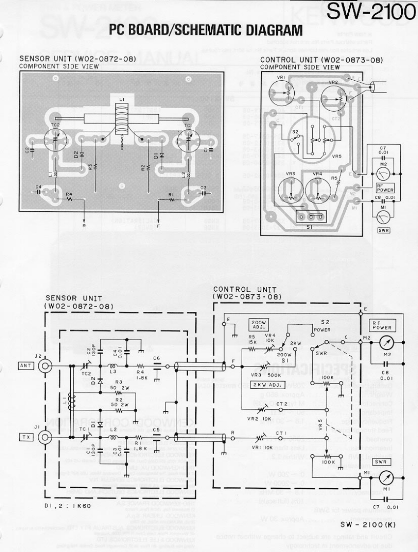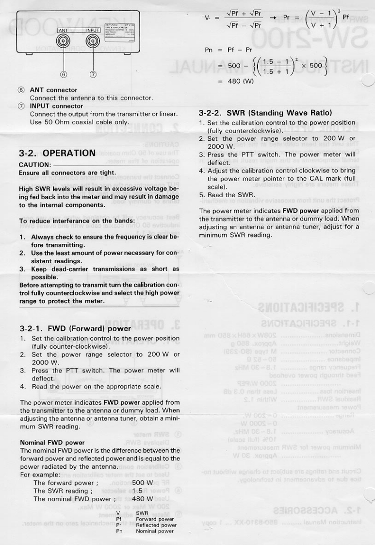 SWR POWER METERSW-2100KENWOODKENWOOD CORPORATIONINSTRUCTION MANUAL8X209876月avsW pnibna?2W2S-S-dBEFORE OPERATION2.CONNECTIONThis unit has been calibrated at the factory.CAUTIONS:Do not remove the case or attempt to readjust the in-The use of 50 Ohm coaxial cable is required for properternal components as this might result in an error inoperation of this meter.the accuracy or may cause the unit to malfunction.Connect the transceivers antenna connector to the IN-These meters are highly sensitive.PUT connector on the rear of the meter.Connect theANT connector on the rear of the meter to your an-Protect the unit from excessive vibration or mechani-tenna or dummy load.cal shock.When transporting the unit turn the calibration con-Best accuracy will be obtained when you use non-trol to minimum (fully counter-clockwise).inductive 50 Ohm coaxial cable with and overall SWRreading of 1.1.ANTSW-2100 (REARTRANSCEIVER1.SPECIFICATIONS1-1.SPECIFICATIONS3.OPERATIONDimensions.................208W×66H×85Dmm02Weight.…Approx.850 g3-1.OPERATING CONTROLSConnector…M type (SO-239)2Impedance.................50-520Frequency range ...........1.8-30MHzFeed through power overload4448444g2000 W/PEPInsertion loss.…Less than 0.3 dBResidual SWR...............Within 1.2Power measurementRange.................O~200 W,0-2000W5Accuracy…1.8-30MHz①SWR meter10%(full scale)Displays SWR.Minimum power for SWR measurement②:POWER meter日animon orTApprox.30 WDisplays RF power.③Calibration controlCircuit and ratings are subject to change without no-Used to set the meter calibration and to select thetice due to advancement in technology.RF power function.④Power Range selectorUsed to select the desired range:1-2.ACCESSORIES200 W Max or 2000 W Max.5 Meter Zero adjustmentInstruction Manual ........B50-8310-XX ..1 copyUse to adjust the mechanical zero on the meter.