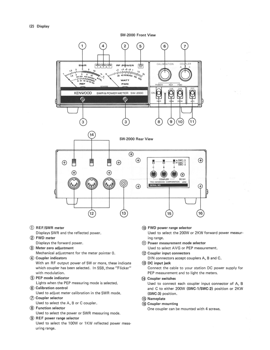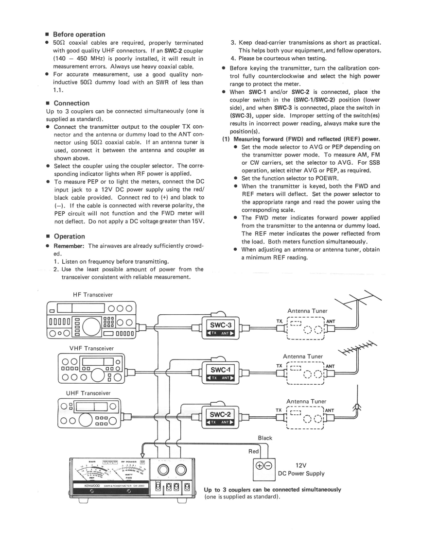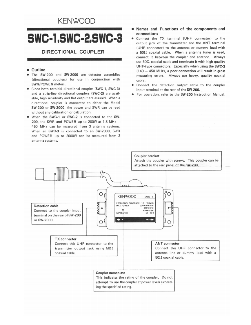 KENWOODComponent parts and their functionsSW-2000①TX ConnectorA UHF connector accepts transmitter output through aSWR/POWER METER502 coaxial cable.②ANT connectorUHF connector for the antenna or dummy load.③Coupler bracket■FeaturesUse this to affix the coupler with screws.The couplerThe SW-2000 through-type SWR/POWER meter which,incan be mounted on the rear of the display unit.conjunction with a directional coupler,can be used in the④Detector cable1.8-450 MHz frequency range.Connect to the coupler input terminal on the display.As a through-type meter,it can be connected betweenunit rear panel.the transmitter and antetta so that output can be meas-⑤Nameplateured during operation.This indicates the rating of the coupler.Do not attemptto use the coupler at power levels exceeding the speci-fied rating.(1)DetectorKENWOOD3wc-328ecoaE-44MPEDANCE率TANT(Figure denotes SWC-3)Either a toroidal directional coupler (SWC-1/SWC-3)ora strip line directional coupler (SWC-2)are used in thecompanion detectors.Sensitivity is high,the outputcharacteristics are flat and power can be measured with-out any calibration or calculation.SWR may be measur-ed with as little as 30W of RF power (approx.3W whenusing SWC-1)in the 1.8 MHz HF band.The coupler and display unit can be separated so the dis-play unit can be mounted wherever convenient.Sinceup to 3 couplers can be connected to the display unit,one display unit can be used to observe a number oftransmitters or antenna systems..The display unit uses dual meters to simultaneouslymeasure forward and reflected power for fast and easytransmitter and antenna tuning..The SW-2000 SWR/POWER meter can measure singleside band PEP (Peak Envelope Power).