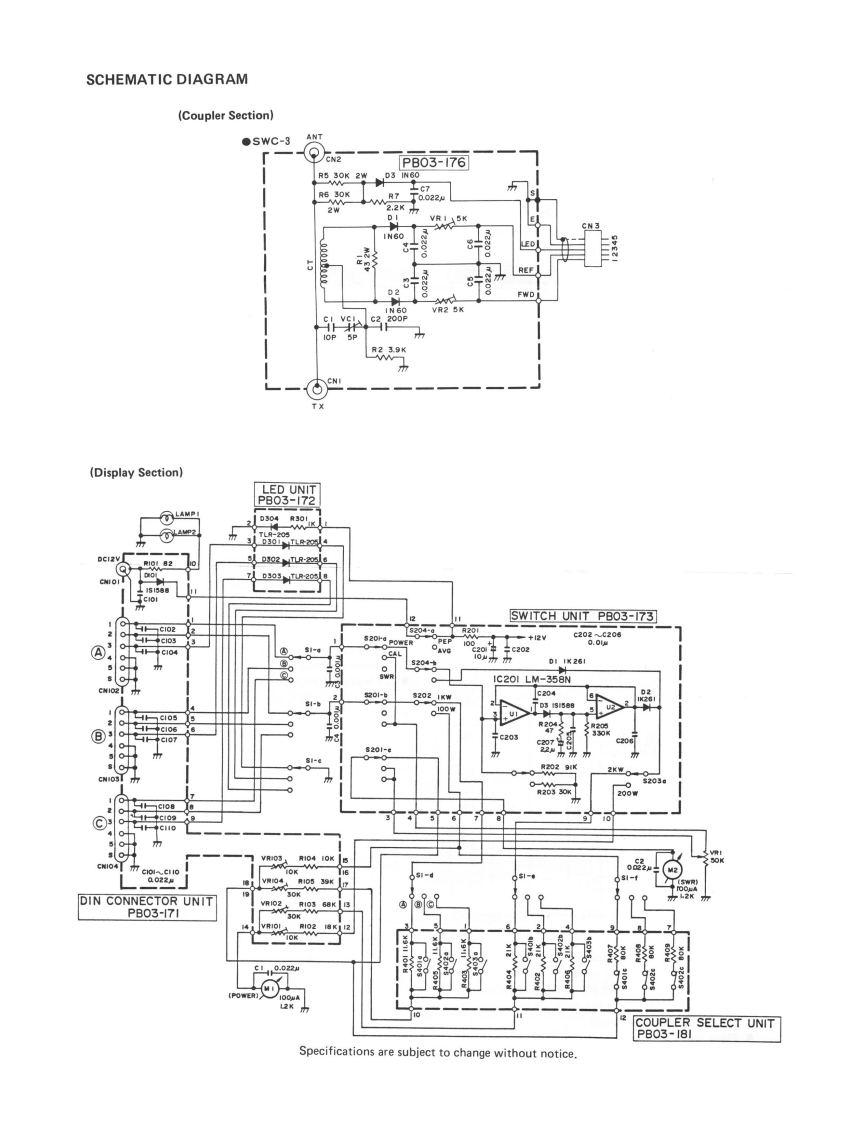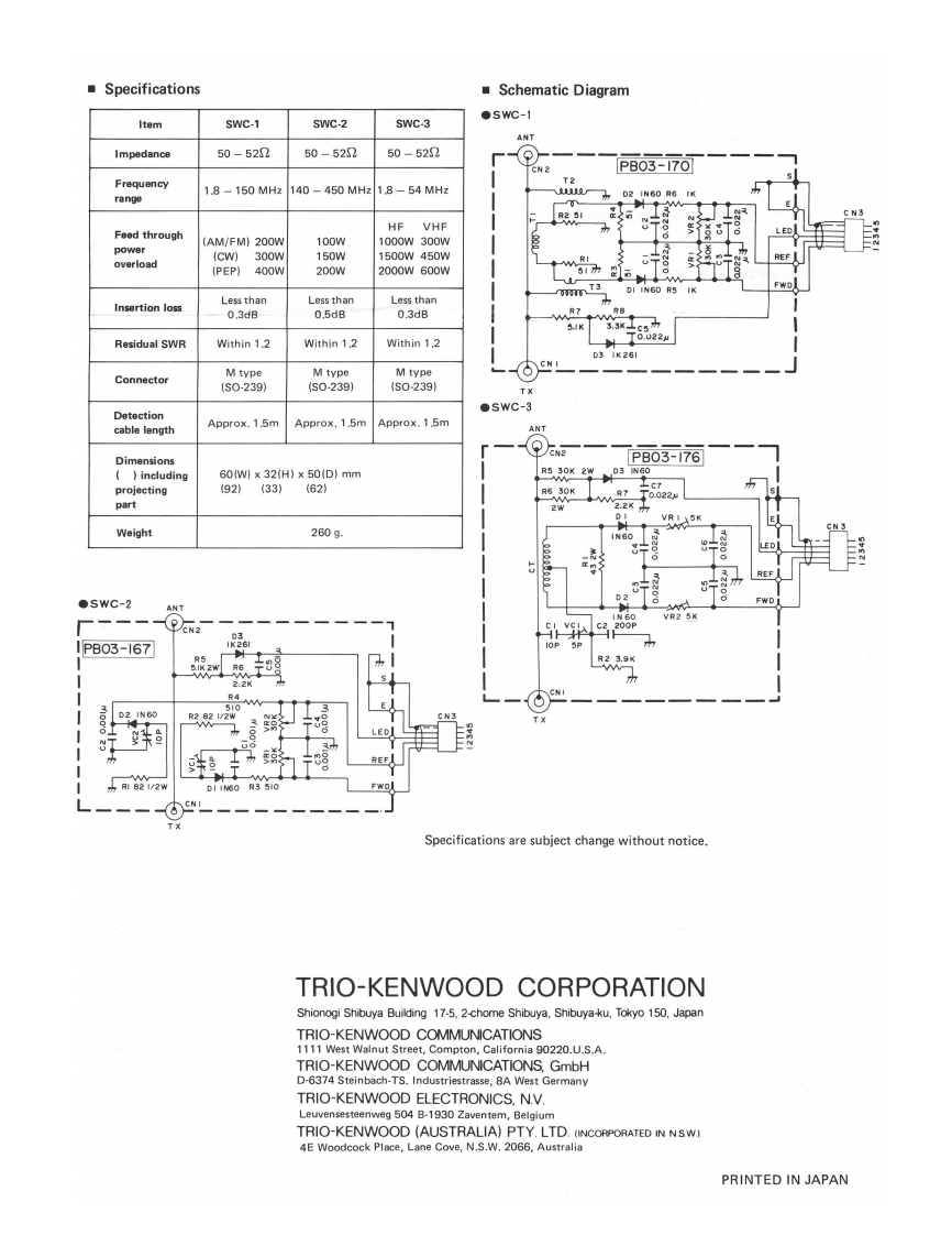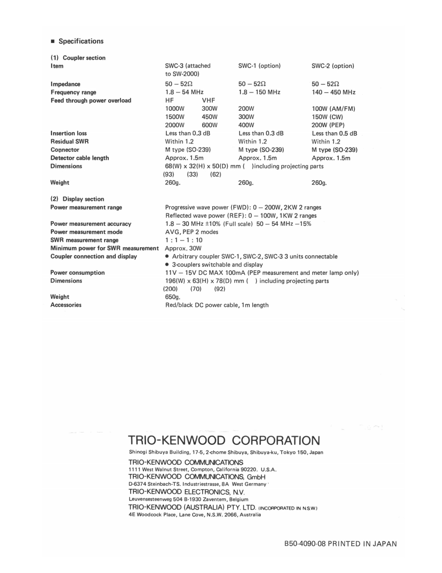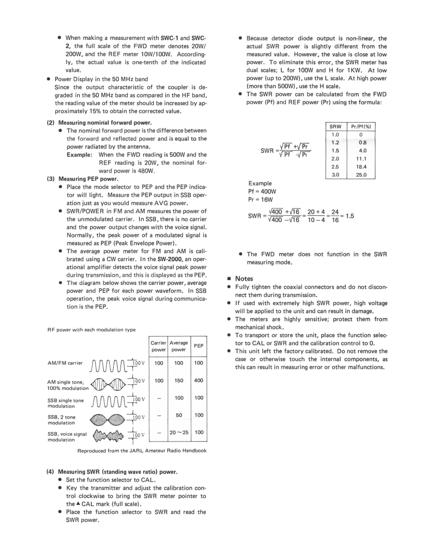 KENWOODComponent parts and their functionsSW-2000①TX ConnectorA UHF connector accepts transmitter output through aSWR/POWER METER502 coaxial cable.②ANT connectorUHF connector for the antenna or dummy load.③Coupler bracket■FeaturesUse this to affix the coupler with screws.The couplerThe SW-2000 through-type SWR/POWER meter which,incan be mounted on the rear of the display unit.conjunction with a directional coupler,can be used in the④Detector cable1.8-450 MHz frequency range.Connect to the coupler input terminal on the display.As a through-type meter,it can be connected betweenunit rear panel.the transmitter and antetta so that output can be meas-⑤Nameplateured during operation.This indicates the rating of the coupler.Do not attemptto use the coupler at power levels exceeding the speci-fied rating.(1)DetectorKENWOOD3wc-328ecoaE-44MPEDANCE率TANT(Figure denotes SWC-3)Either a toroidal directional coupler (SWC-1/SWC-3)ora strip line directional coupler (SWC-2)are used in thecompanion detectors.Sensitivity is high,the outputcharacteristics are flat and power can be measured with-out any calibration or calculation.SWR may be measur-ed with as little as 30W of RF power (approx.3W whenusing SWC-1)in the 1.8 MHz HF band.The coupler and display unit can be separated so the dis-play unit can be mounted wherever convenient.Sinceup to 3 couplers can be connected to the display unit,one display unit can be used to observe a number oftransmitters or antenna systems..The display unit uses dual meters to simultaneouslymeasure forward and reflected power for fast and easytransmitter and antenna tuning..The SW-2000 SWR/POWER meter can measure singleside band PEP (Peak Envelope Power).