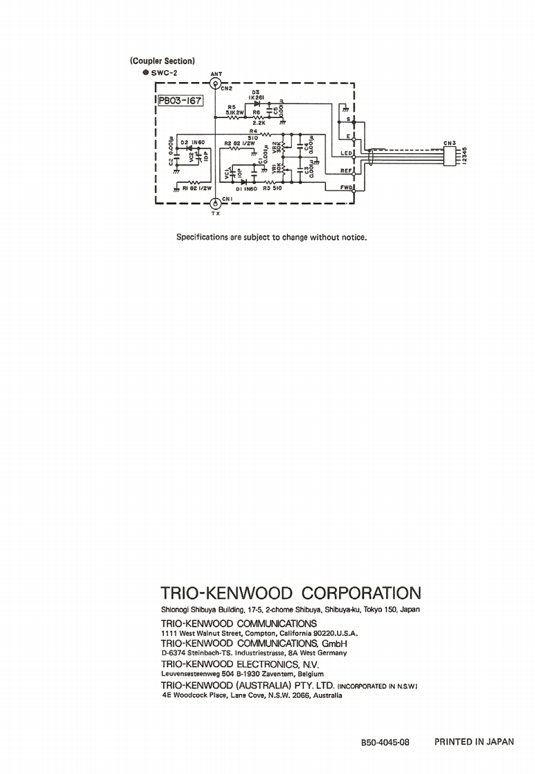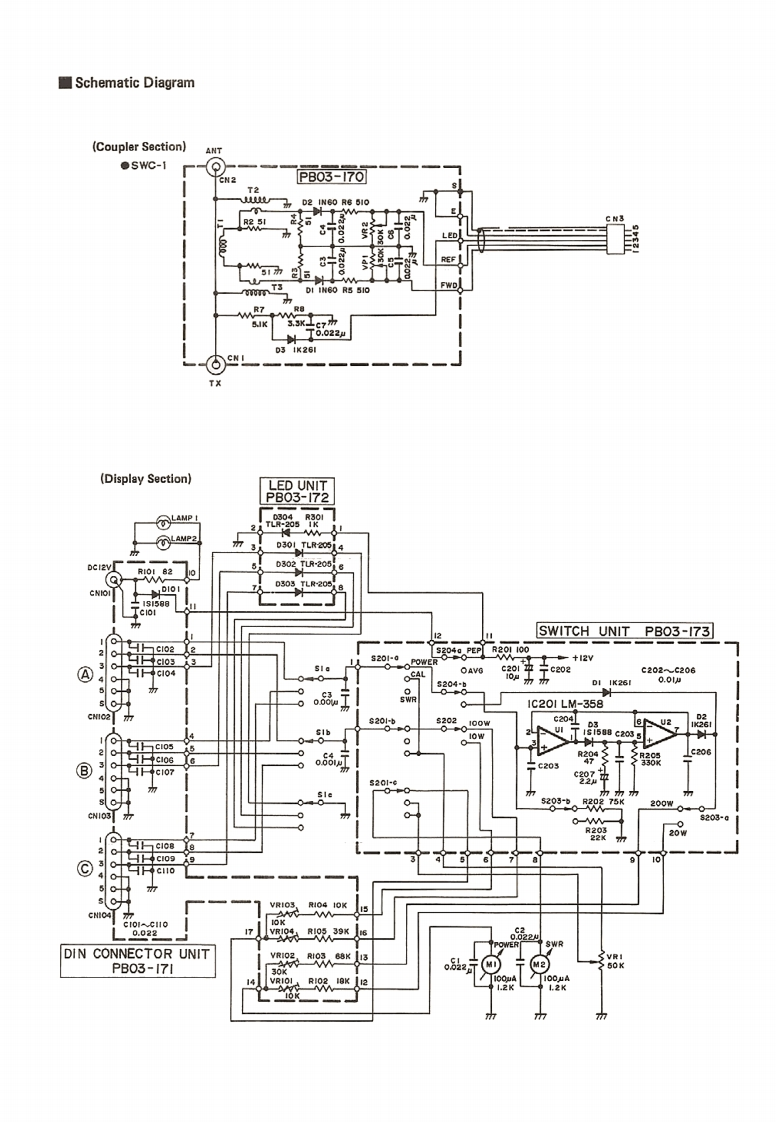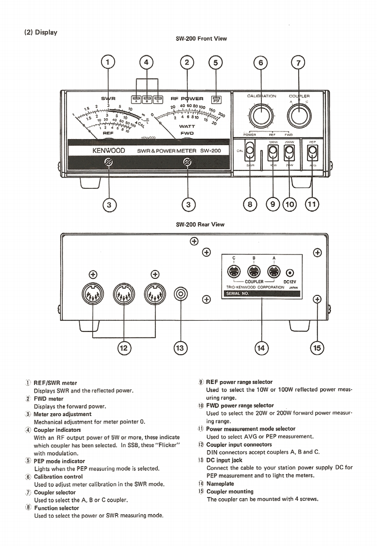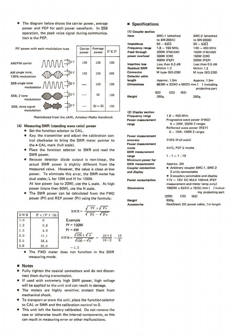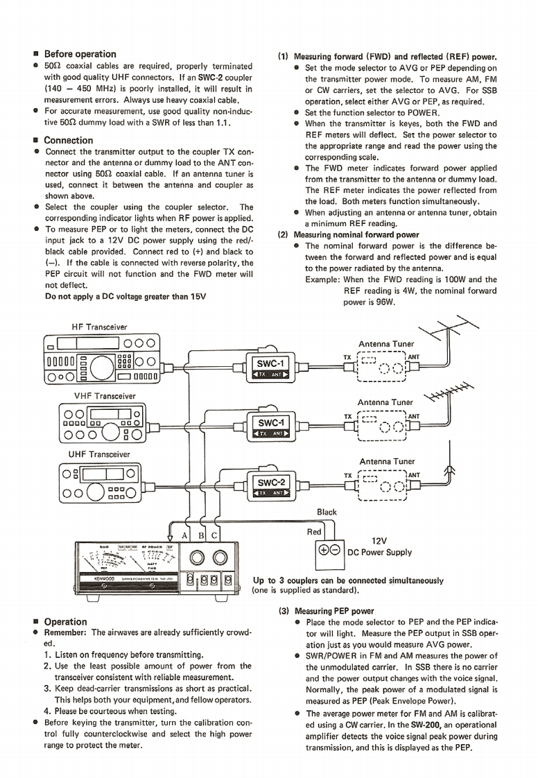 KENWOODComponent parts and their functionsV-21 TX connectorA UHF connector accepts transmitter output througha 501 coaxial cable.SWR/POWER METER2 ANT connectorUHF connector for the antenna or dummy load.3 Coupler bracketUse this to affix the coupler with screws.The couplerFeaturescan be mounted on the rear of the display unit.The SW-200 through-type SWR/POWER meter which,in4 Detector cableconjunction with a directional coupler,can be used in theConnect to the coupler input terminal on the display1.8-450 MHz frequency range.unit rear panel..As a through-type meter,it can be connected between5 Nameplatethe transmitter and antenna so that output can be meas-This indicates the rating of the coupler.Do not attemptured during operation.to use the coupler at power levels exceeding the specifi-Either a toroidal directional coupler (SWC-1)or a striped rating.line directional coupler (SWC-2)are used in the compan-ion detectors.Sensitivity is high,the output character-istics are flat and power can be measured without anycalibration or calculation.SWR may be measured withas little as 3W of power,in the 1.8 MHz HF band.(1)DetectorKENWOODSw0-1COVERAGE18-1500AM400w558IMPEDANCE50=520ANTThe coupler and display unit can be separated so the dis.(Figure denotes SWC-1)play unit can be mounted wherever convenient.Sinceup to 3 couplers can be connected to the display unit,one display unit can be used to observe a number oftransmitters or antenna systems.The display unit uses dual meters to simultaneouslymeasure forward and reflected power for fast and easytransmitter and antenna tuning.The SW-200 SWR/POWER meter can measure single sideband PEP (Peak Envelope Power).APDF resteraan hrough to you by www.rigpis.cm