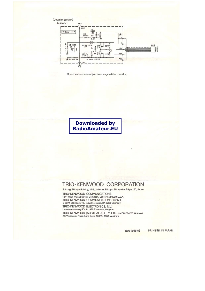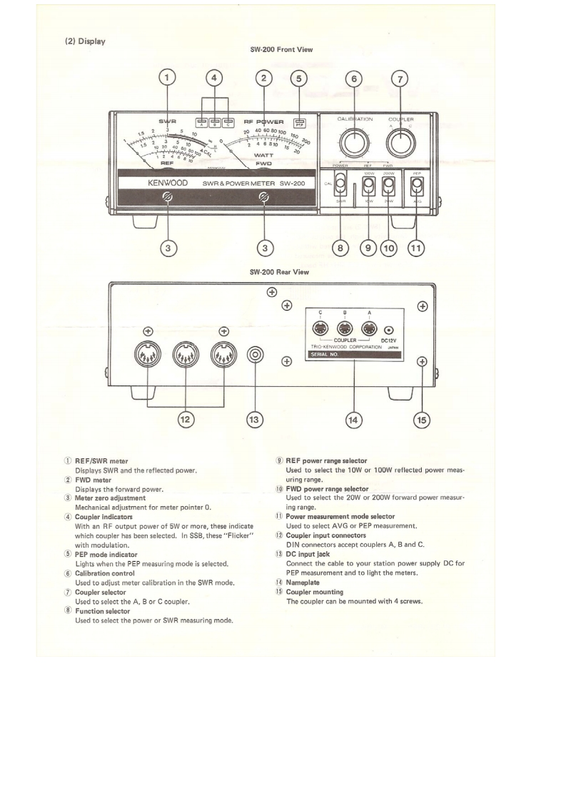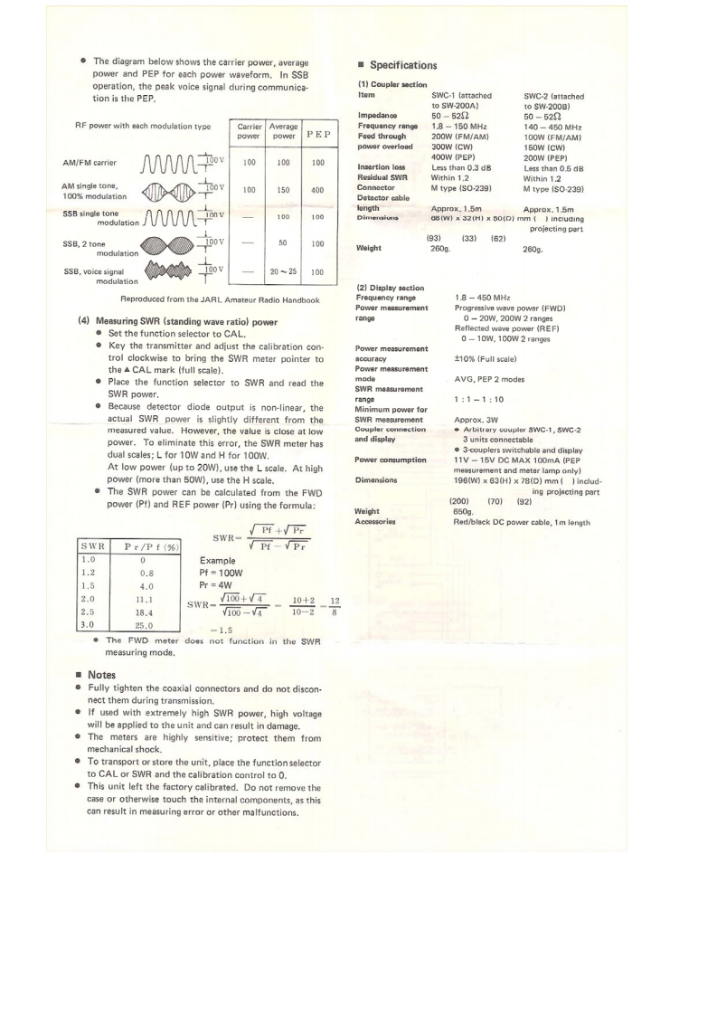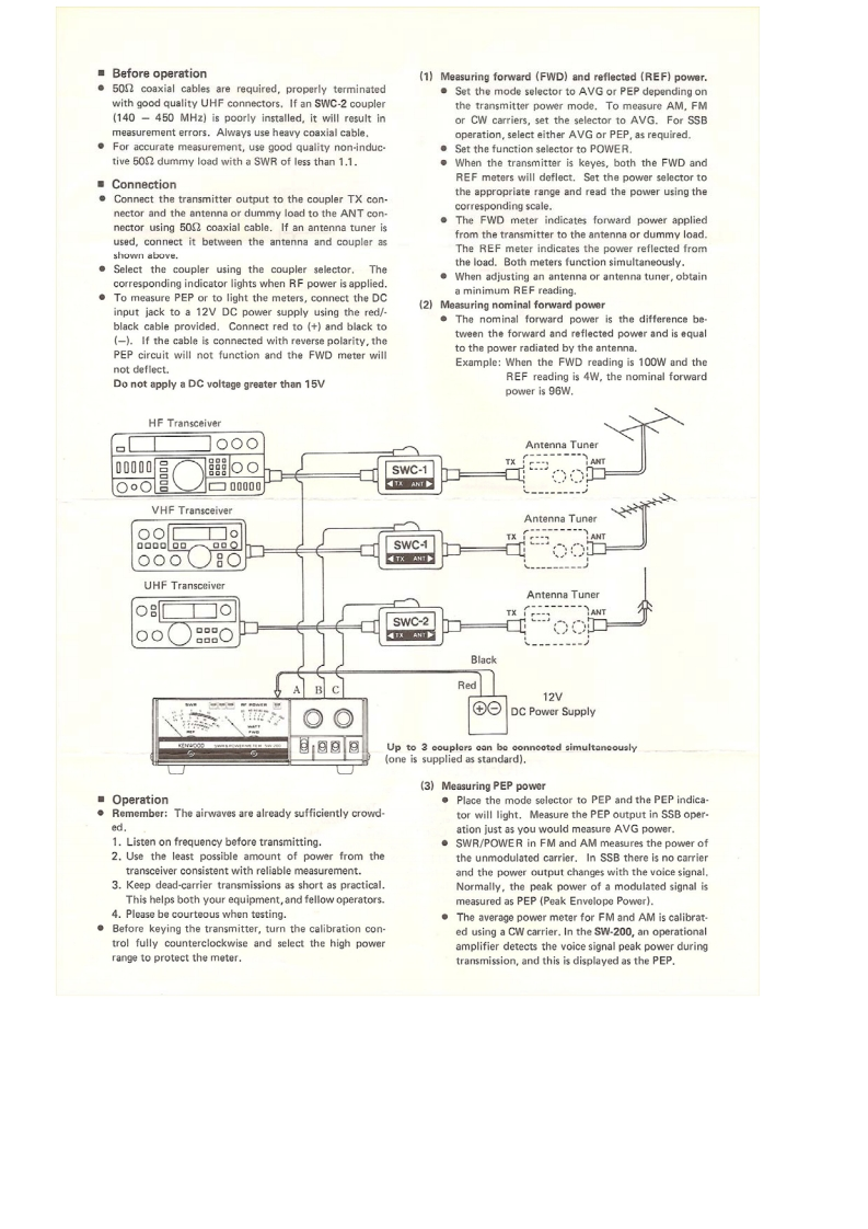 KENWOODComponent parts and their functionssV-2▣▣1 TX connectorA UHF connector accepts transmitter output througha 502 coaxial cableSWR/POWER METER2 ANT connectorUHF connector for the antenna or dummy load.3 Coupler bracketUse this to affix the coupler with screws.The coupler■Featurescan be mounted on the rear of the display unit.The SW-200 through-type SWR/POWER meter which,in4 Detector cableconjunction witn a directional coupier,can be used in theCuneut tu the suupler input terminal on the dlsplay1.8-450 MHz frequency range.unit rear panel..As a through-type meter,it can be connected between5 Nameplatethe transmitter and antenna so that output can be meas-This indicates the rating of the coupler.Do not attemptured during operation.to use the coupler at power levels exceeding the specifi.Either a toroidal directional coupler (SWC-1)or a striped rating.line directional coupler (SWC-2)are used in the compan-ion detectors.Sensitivity is high,the output character.istics are flat and power can be measured without anycalibration or calculation.SWR may be measured withas little as 3W of power,in the 1.8 MHz HF band.(1)Detector2KENWOOD5wG-1MPEDANCE50520ANT.The coupler and display unit can be separated so the dis-(Figure denotes SWC-1)play unit can be mounted wherever convenient.Sinceup to 3 couplers can be connected to the display unit,one display unit can be used to observe a number oftransmitters or antenna systems..The display unit uses dual meters to simultaneouslymeasure forward and reflected power for fast and easyDownloaded bytransmitter and antenna tuning.The SW-200 SWR/POWE R meter can measure single sideRadioAmateur.EUband PEP (Peak Envelope Power).