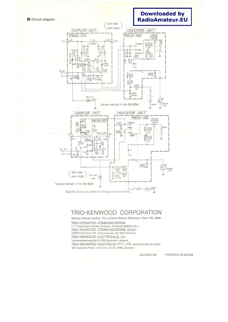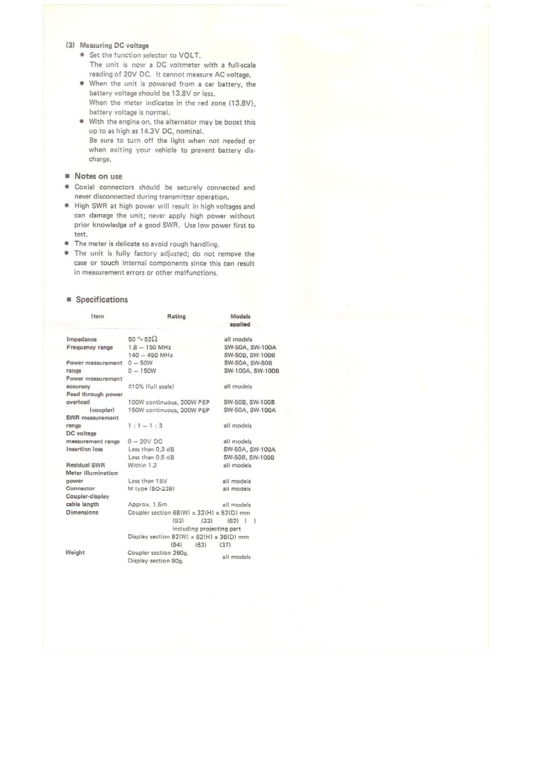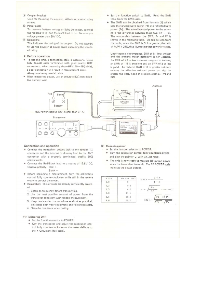 KENWOODsW-5O/sW-Mo▣SWR/POWER METERDownloaded by里FeaturesRadioAmateur.EU.Measurements over a wide frequency range can bemade with this through-type SWR/POWER mater..Although compact,SWR/RF Power and battery voltagecan be measured and ON AIR indicators and illumina-tion for night use are provided..The coupler and display unit can be separated.Thedisplay unit can be mounted wherever convenient..The compact display unit will improve operation ofboth a fixed station and can also be installed in a mobilestation.Part names and their functions(Figure denote SW-50A as a typical example)(Rear panel)6310119FnOW银RKENWOODKENWOOD5W-s0(Display unit)(coupler)527①Met培r5 Adjustable tilt mounting bracketFull-scale deflection indicates RF power at 50W (SW-This is used to secure the display unit and allows the dis.50A/B)or 150W (SW-100A/B)and DC voltage up toplay unit to be positioned most conveniently.Peel of20V.The meter can be illuminated for night time opera-the protective backing from the adhesive strip at the bot-tion.tom of the bracket and affix in te ueaired puoition.2 Function selectorTwo holes are also provided in the mounting bracket soUsed to select POWER.SWR or VOLT.it can also be attached with screws.Loosen the bracket3 Calibration controlside-screws and adjust the viewing angle of the displayFor SWR measurement,this control adjusts meter sensi-unit.tivity.When this control is turned fully counterclock-6 Lamp switchwise and the transmitter is ON,the meter functions as aControls lamp power for meter illumination.If thispower meter.switch is left ON for too long,the battery will discharge.4 ON AIR indicatorFor normal operation,place at OFF.This lights when the RF output power is 3W or greater:7 TX connectorthe brightness increases with the output level,andThis UHF connector should be connected to the trans-Flick8rs“in SSB mode,ceiver output jack.8)ANT connectorThis UHF connector should be connected to the antennaor dummy load.