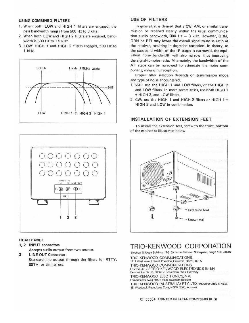 MODELSP-230SPEAKEROPERATING MANUALWe're happy that you've chosen the Model SP-230 forCONTROLS AND THEIR FUNCTIONyour receiving needs.It has undergone stringent qualitycontrol inspection and tests prior to packing and has leftour factory in perfect operating condition.Please inspectyour SP-230 carefully for any signs of damage in transit.If the unit is damaged,immediately notify the salesrepresentative from whom you purchased the unit.SP.230GENERALYour SP-230 is a sophisticated external speaker designedto further enchance operation of HF Transceivers.It fea-tures precise audio response and matches the KENWOOD-2HF transceiver in appearance.Its advantages are:Built-in selectable tone filters to attenuate high or lowfrequency response inputs;Two channel selectable input and the headphone outputthrough the tone filters.SPECIFICATIONSSpeaker used:12 cm dia.Rated Input:2 WattsImpedance:82Frequency response:100Hz to 5kHz.Filter cut-off frequency,Front PanelLOW:500Hz,-3dB.1 PHONES ConnectorHIGH 1:3kHz,-3dB.Standard headphone output,through the tone filters.HIGH 2:1.5kHz,-3dB.2 INPUT SwitchHIGH 1+HIGH 2:1 kHz,-3dB.Selects one of two audio inputs.Filter attenuation:-6dB/oct.3.FILTERS,LOW SwitchDimensions:W180mm(7-1/16)This switch attenuates frequencies below 500 Hz;-3H133mm(5-1/4")dB at 500 Hz,-6 dB/octave.D287mm(11-5/16)4 FILTERS,HIGH 1 SwitchNet weight1.8kg.(4.0bs.)This switch attenuates frequencies above 3 kHz;-3 dBAccessories fumished:Speaker cord,1 pc.(E14-0101-05)at 3 kHz,-6 dB/octave.Extension foot,2 pcs.5 FILTERS,HIGH 2 Switch(J02-0049-04)This switch attenuates frequencies above 1.5 kHz;-3Screw,M4 x 12,2 pcs.dB at 1.5 kHz,-6 dB/octave.(N30-4012.41)】FILTERS,HIGH 1 and HIGH 2 Switch1 pin plug,2 pcs.These attenuate frequencies above 1 kHz;-3 dB at 1(E20-1610-05)kHz,-6 dB/octave.PACKINGPlease save the shipping cartons and packing material.They have been designed for the safe shipping of your unit.There will be considerably less chance of damage if youship your unit in its original cartons and packing.