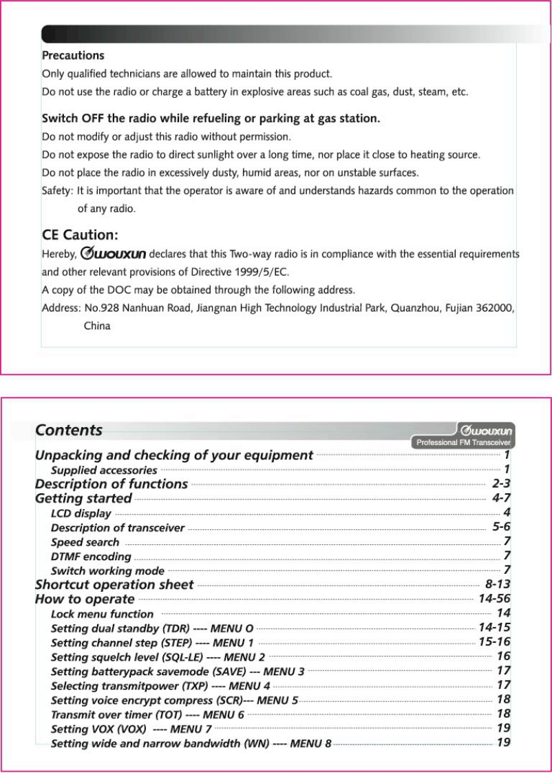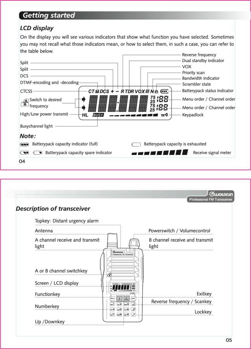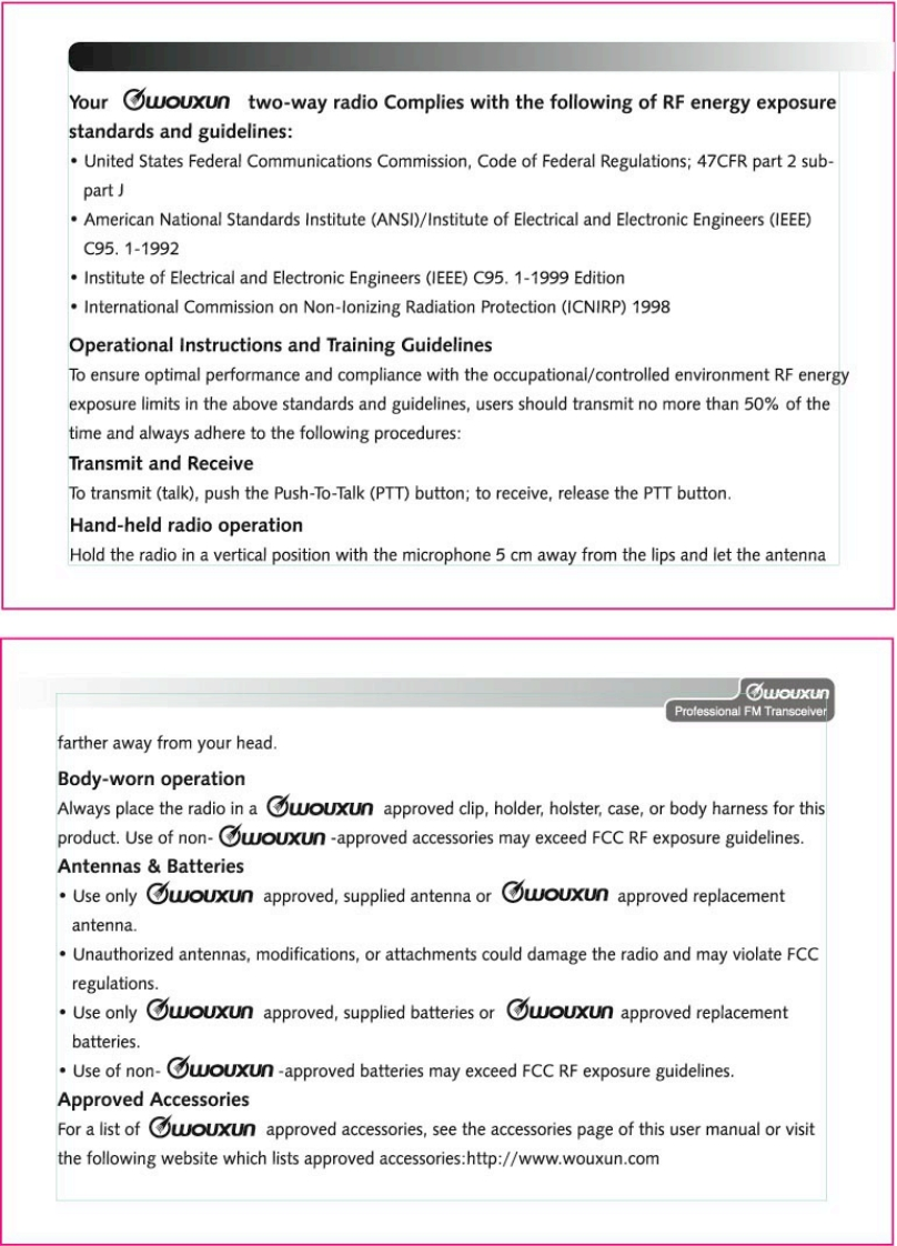 Thanks for buying the wouxun KG-689E series transceiver.This transceiver offers latest in design,multi-functionality,stable behaviour and easy operation.We believe you willbe pleased with the high quality and dependable featuresfor all your communication needs.wouxunProfessional FM TransceiverUser Safety,Training,and General InformationREAD THIS IMPORTANT INFORMATION ON SAFE AND EFFICIENT OPERATION BEFORE USINGYOUR wouxun PORTABLE TWO-WAY RADIO.Compliance with RF Energy Exposure StandardsYour wouxun two-way radio is designed and tested to comply with a number of national andinternational standards and guidelines(listed below)regarding human exposure to radio frequencyelectromagnetic energy.This radio complies with the IEEE(FCC)and ICNIRP exposure limits foroccupational/controlled RF exposure environment at duty cycles of up to 50%talk-50%listen andshould be used for occupational use only.In terms of measuring RF energy for compliance with theFCC exposure guidelines,your radio radiates measurable RF energy only while it is transmitting(during talking),not when it is receiving (listening)or in standby mode.NOTE△>>The approved batteries supplied with this radio are rated for a 5-5-90 duty cycle (5%talk-5%listen-90%standby),even though this radio complies with the FCC occupational RF exposure limits at duty cycles of upto 50%talk.
