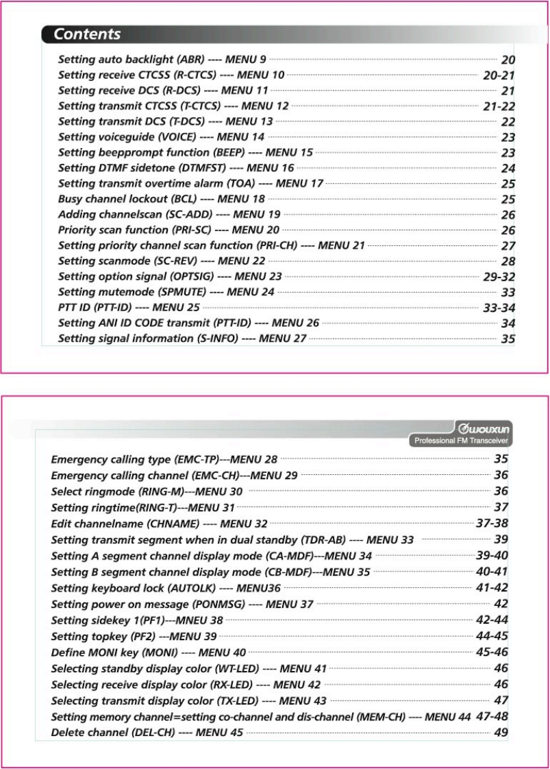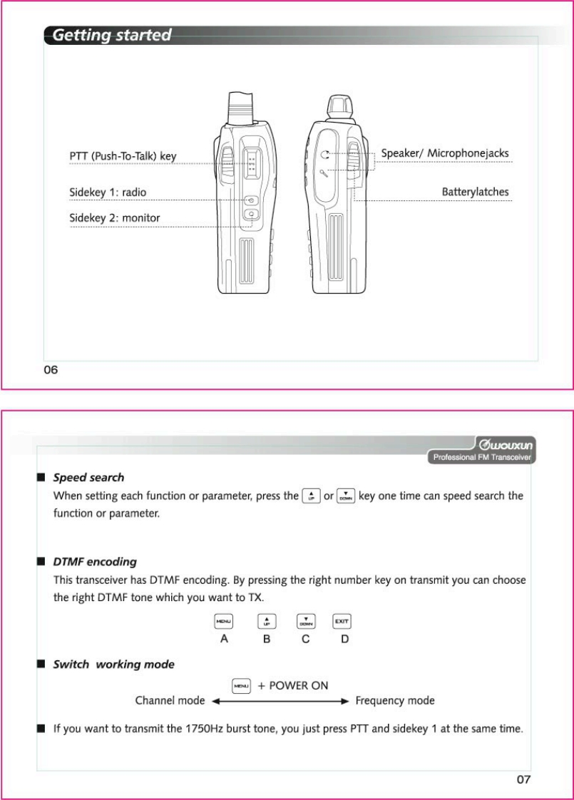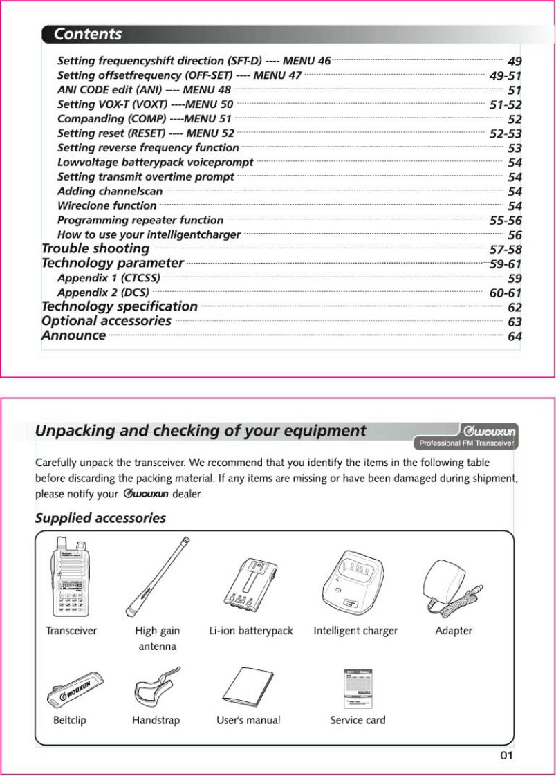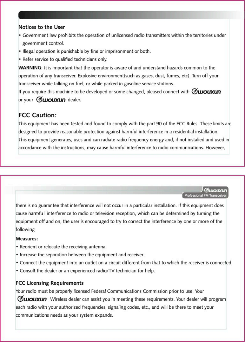 Thanks for buying the wouxun KG-689E series transceiver.This transceiver offers latest in design,multi-functionality,stable behaviour and easy operation.We believe you willbe pleased with the high quality and dependable featuresfor all your communication needs.wouxunProfessional FM TransceiverUser Safety,Training,and General InformationREAD THIS IMPORTANT INFORMATION ON SAFE AND EFFICIENT OPERATION BEFORE USINGYOUR wouxun PORTABLE TWO-WAY RADIO.Compliance with RF Energy Exposure StandardsYour wouxun two-way radio is designed and tested to comply with a number of national andinternational standards and guidelines(listed below)regarding human exposure to radio frequencyelectromagnetic energy.This radio complies with the IEEE(FCC)and ICNIRP exposure limits foroccupational/controlled RF exposure environment at duty cycles of up to 50%talk-50%listen andshould be used for occupational use only.In terms of measuring RF energy for compliance with theFCC exposure guidelines,your radio radiates measurable RF energy only while it is transmitting(during talking),not when it is receiving (listening)or in standby mode.NOTE△>>The approved batteries supplied with this radio are rated for a 5-5-90 duty cycle (5%talk-5%listen-90%standby),even though this radio complies with the FCC occupational RF exposure limits at duty cycles of upto 50%talk.