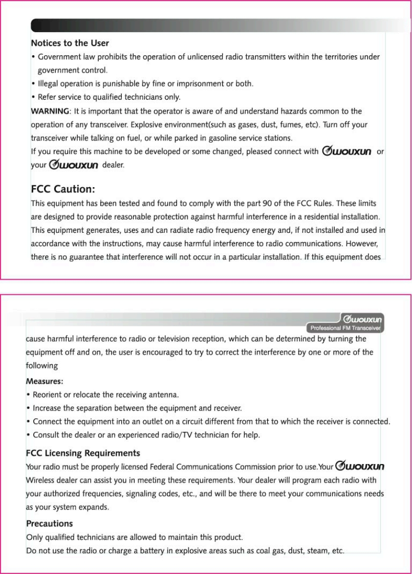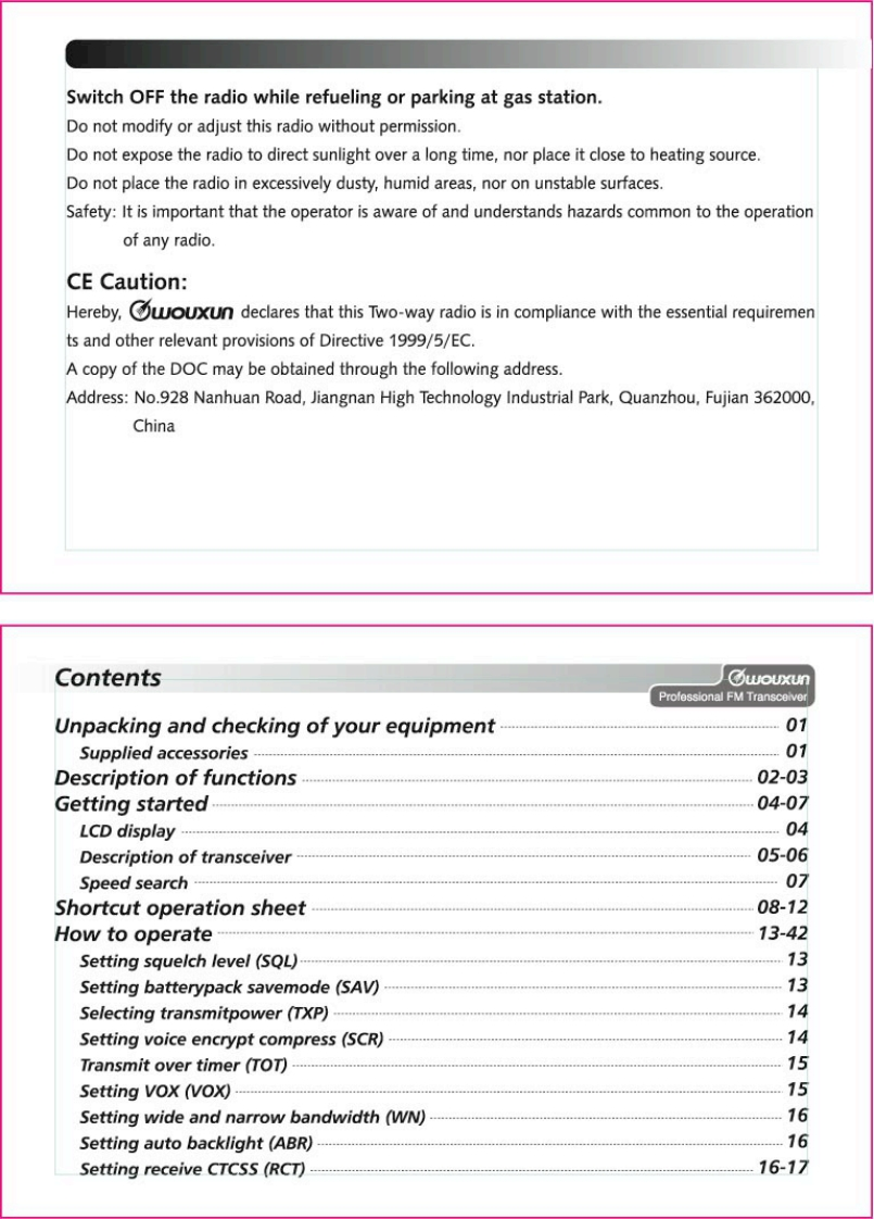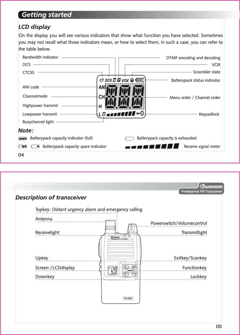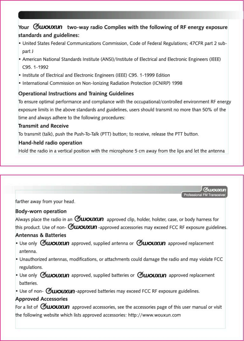 Thanks for buying the wouxun KG-659E series transceiver.This transceiver offers latest in design,multi-functionality,stable behaviour and easy operation.We believe you will bepleased with the high quality and dependable features for allyour communication needs.C⑦oUXLnProfessional FM TransceiverUser Safety,Training,and General InformationREAD THIS IMPORTANT INFORMATION ON SAFE AND EFFICIENT OPERATION BEFORE USING YOURwouxun PORTABLE TWO-WAY RADIO.Compliance with RF Energy Exposure StandardsYour wouxun two-way radio is designed and tested to comply with a number of national andinternational standards and guidelines(listed below)regarding human exposure to radio frequencyelectromagnetic energy.This radio complies with the IEEE(FCC)and ICNIRP exposure limits foroccupational/controlled RF exposure environment at duty cycles of up to 50%talk-50%listen andshould be used for occupational use only.In terms of measuring RF energy for compliance with theFCC exposure guidelines,your radio radiates measurable RF energy only while it is transmitting(during talking),not when it is receiving (listening)or in standby mode.NOTE△>>The approved batteries supplied with this radio are rated for a 5-5-90 duty cycle (5%talk-5%listen-90%standby),even though this radio complies with the FCC occupational RF exposure limits at duty cycles of upto 50%talk.