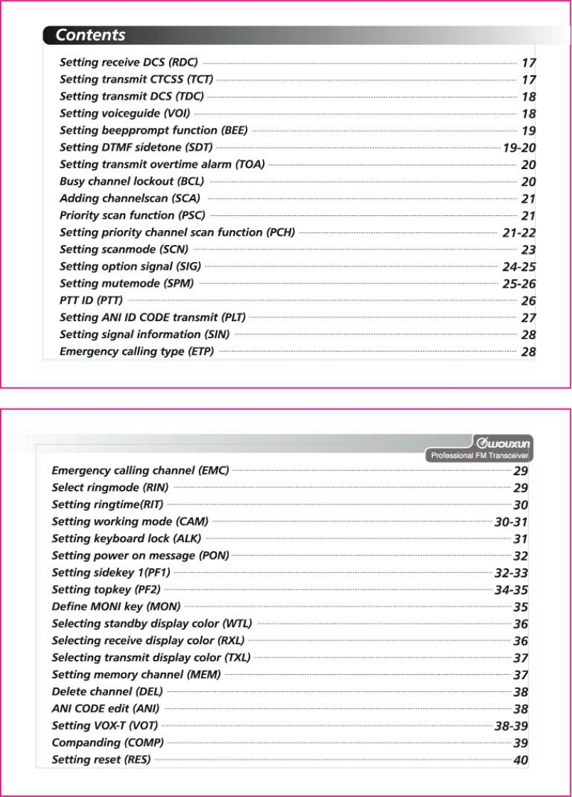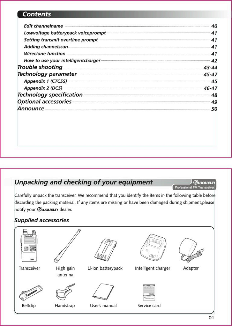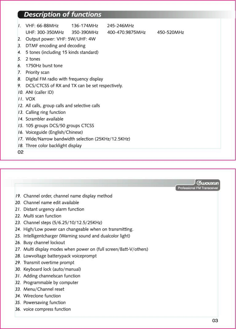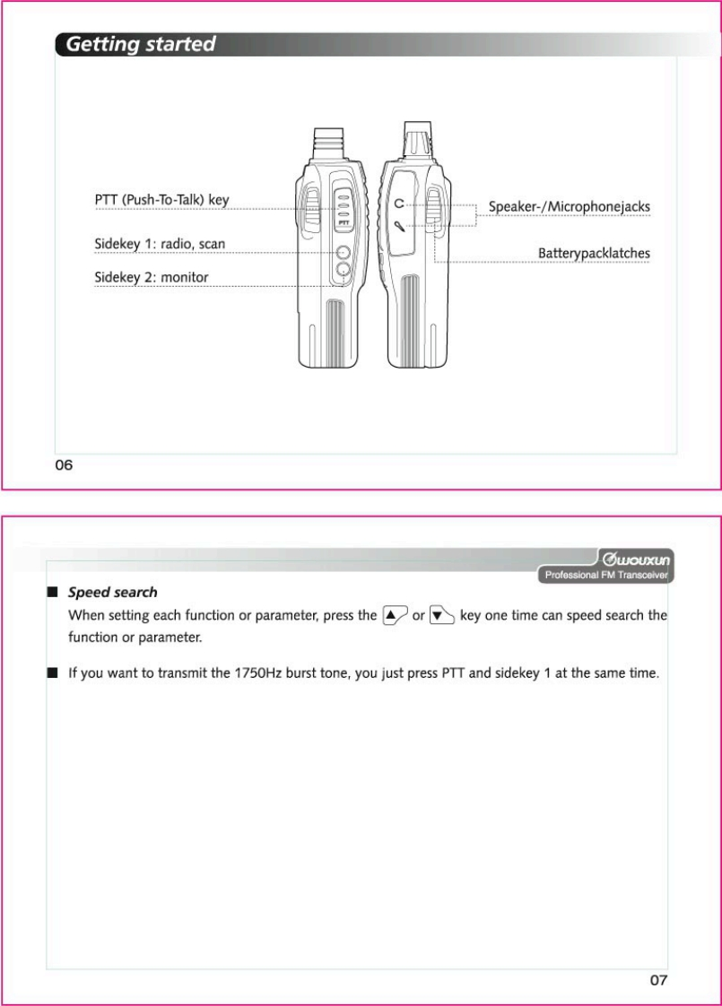 Thanks for buying the wouxun KG-659E series transceiver.This transceiver offers latest in design,multi-functionality,stable behaviour and easy operation.We believe you will bepleased with the high quality and dependable features for allyour communication needs.C⑦oUXLnProfessional FM TransceiverUser Safety,Training,and General InformationREAD THIS IMPORTANT INFORMATION ON SAFE AND EFFICIENT OPERATION BEFORE USING YOURwouxun PORTABLE TWO-WAY RADIO.Compliance with RF Energy Exposure StandardsYour wouxun two-way radio is designed and tested to comply with a number of national andinternational standards and guidelines(listed below)regarding human exposure to radio frequencyelectromagnetic energy.This radio complies with the IEEE(FCC)and ICNIRP exposure limits foroccupational/controlled RF exposure environment at duty cycles of up to 50%talk-50%listen andshould be used for occupational use only.In terms of measuring RF energy for compliance with theFCC exposure guidelines,your radio radiates measurable RF energy only while it is transmitting(during talking),not when it is receiving (listening)or in standby mode.NOTE△>>The approved batteries supplied with this radio are rated for a 5-5-90 duty cycle (5%talk-5%listen-90%standby),even though this radio complies with the FCC occupational RF exposure limits at duty cycles of upto 50%talk.