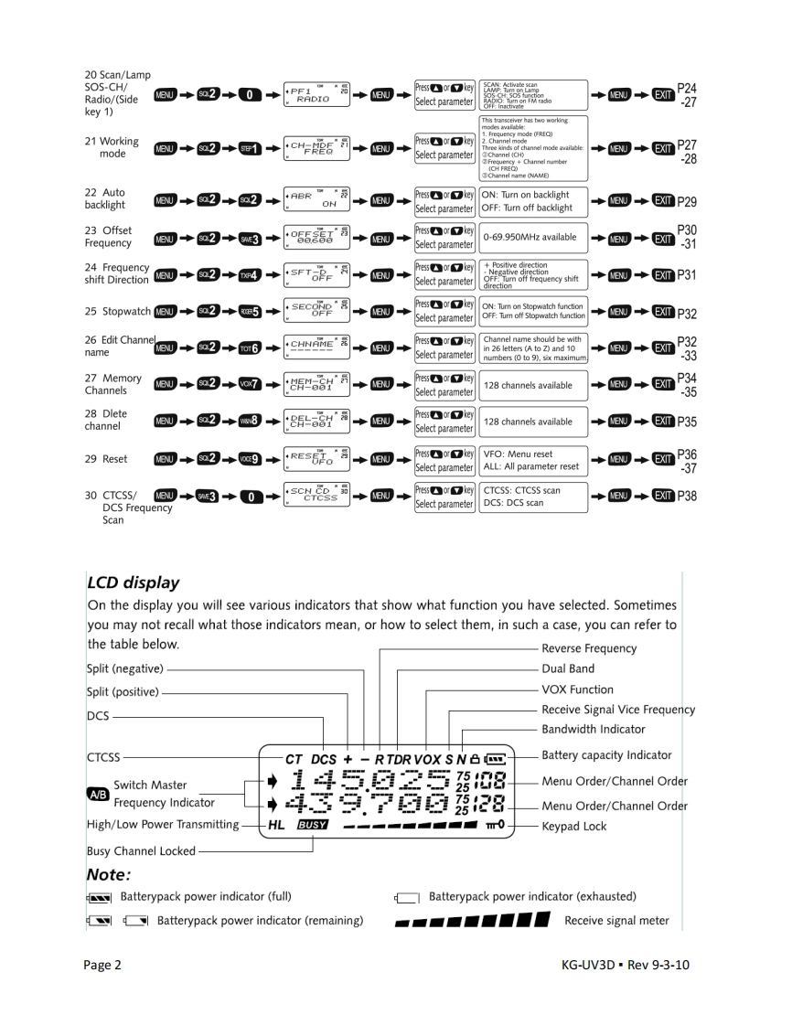 Wouxun KG-UV3D Quickp0CEs巴K.@ODStart Reference SheetPowerwerx,Inc.263 N Berry5t,Brea,CA92821,714-674-0073 Phone·714-674-4949FaxFunctionFunctionEnterScreen displaySelectSelectableConfirmReturnSeeordernamefunctionparameterparametertopagesetexplanationstandby1 SettingB0◆e1+:5I558KPress orey7 kinds of frequency steps5K/6.25K/10K/12.5K/25K8J◆ETP14frequency stepSelect parameter/50K/100K2 Setting squelch4saL-5"月Press orkeySquelch level from 0levelSelect parameterto 9+e0◆EP153 Setting batterypack3#SAUE◆WUON:Turn on save functionON◆e0+ETP15savemodeSelect parameterOFF:Turn off save function4 Selecting transmit E4TXAIGHPress oreyMENUH:High power (VHF 5W/UHF 4W)◆e0◆EXTP16powerSelect parameterL:Low power (1W)5 Transmit voice,R06黍FOT80+5◆e0◆ETP16promptSelect parameterBoTAe5PTvoeBomg6 Transmit overtimerB则+o6+,T0T6Press or keyTOT has 40 levels in stepsof 15 secondsSelect parametereJ◆ETP17OFF:Tumn off TOT7 Setting VOXBU+@7+◆GNUress oreyVOX has levels from 1 to 10OFFMENU EXT P17Select parameterOFF:Turn off VOX transmission8 Setting bandwidth 33MENUPress or keyWIDE:25KHze0◆ETP18Select parameterNARR:12.5KHzCHINES:Chinese voice prompt9 Voice PromptB+o9+:腰sHPress orkeyENGLSH:English voice promptSelect parameter+80+ETP18OFF:Tum off voice prompt10 Transmit1 to 10 levels with 1overtime alarm8+e1+0+TOAress or key5second eachelect parameterOFF:turn off TOA+四+m811 Setting0+甲1+e1+ress oreyON:Tum an Beep prompt functionBeep promptONSelect parameterOFF:Tum off beep prompt function+阳四+EP1912 Power onOFF:Full screen displaydisplay80+每1+2+E0+Press orkeyelect parameterMSG:WELCOMEge display+e0+P2013 Busy Chan+BCLPress or kEyON:Turn on BCLnel Lockoute0+甲1+3+OFFelect parameterOFF:Turn off BCL◆阳0◆ETP2014 Keypade切+冠1+m4+ON:Turn on AutolockLockSelect parameterOFF:Tur off Autolock+阳0+ETP2115 Receiving→1→5+R-c6r司+B→ress or key50 groups CTCS5(67.0Hzelect parameter-254.1)+阳0+ETP22CTCSSOFF:Turn off CTCSS16 Transmitting@+1+o6+T-cr8r周50 groups CTCSS (67.0HzCTCSS-254.1elect parameter+阳0◆ETP22OFF:Turn off CTCSS17 Receiving四→e1+@网+R-pS第e'月→Bress orey105 groups DCS (D023N-D754N)DCS+阳0◆ETP23elect parameterOFF:Turn ol DCS18 Transmiting→e+8+T-eSr'司105 groups DCS (D023N-DCSSelect parameter+阳0+TP23OFF:Tum off DCS195 Scan mode→母1→@g→sc-R8同◆E0+ETP24lect parametera7&Page 1KG-UV3D·Rev9-3-10