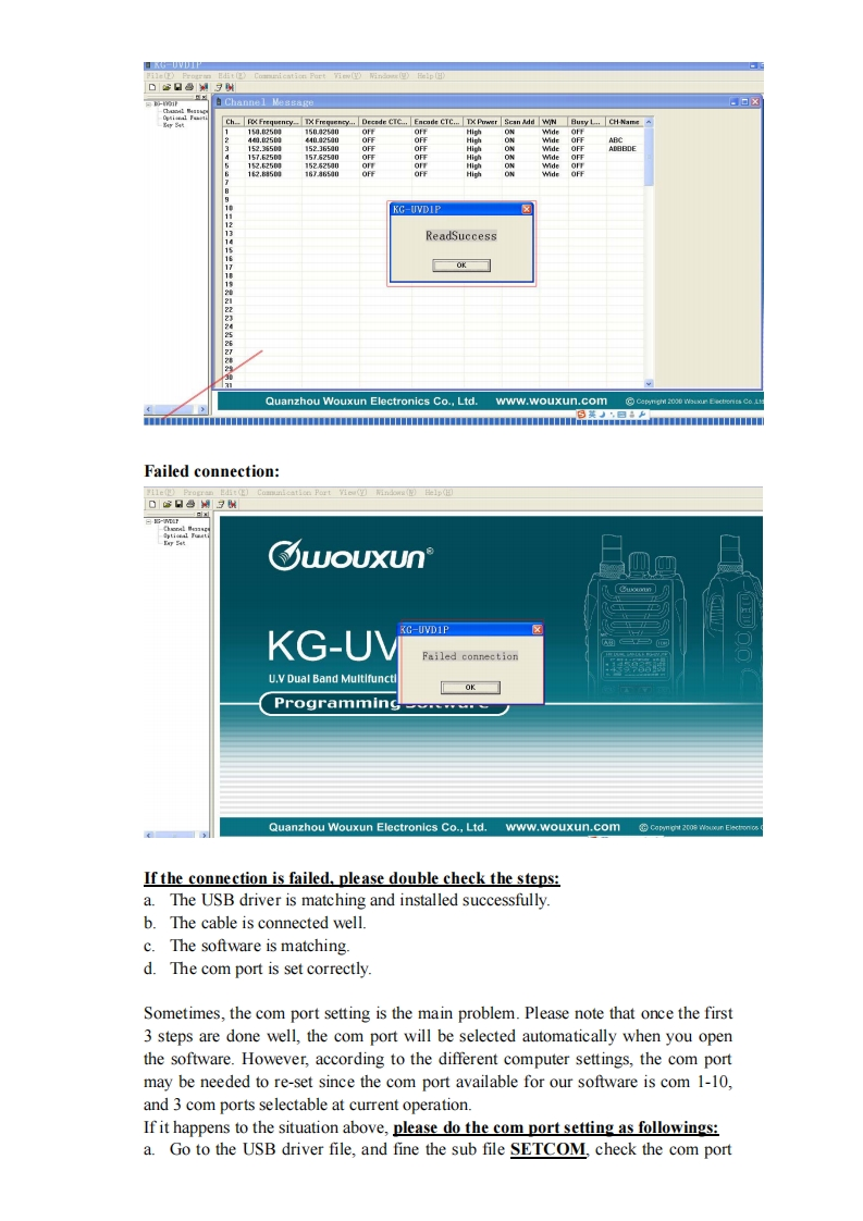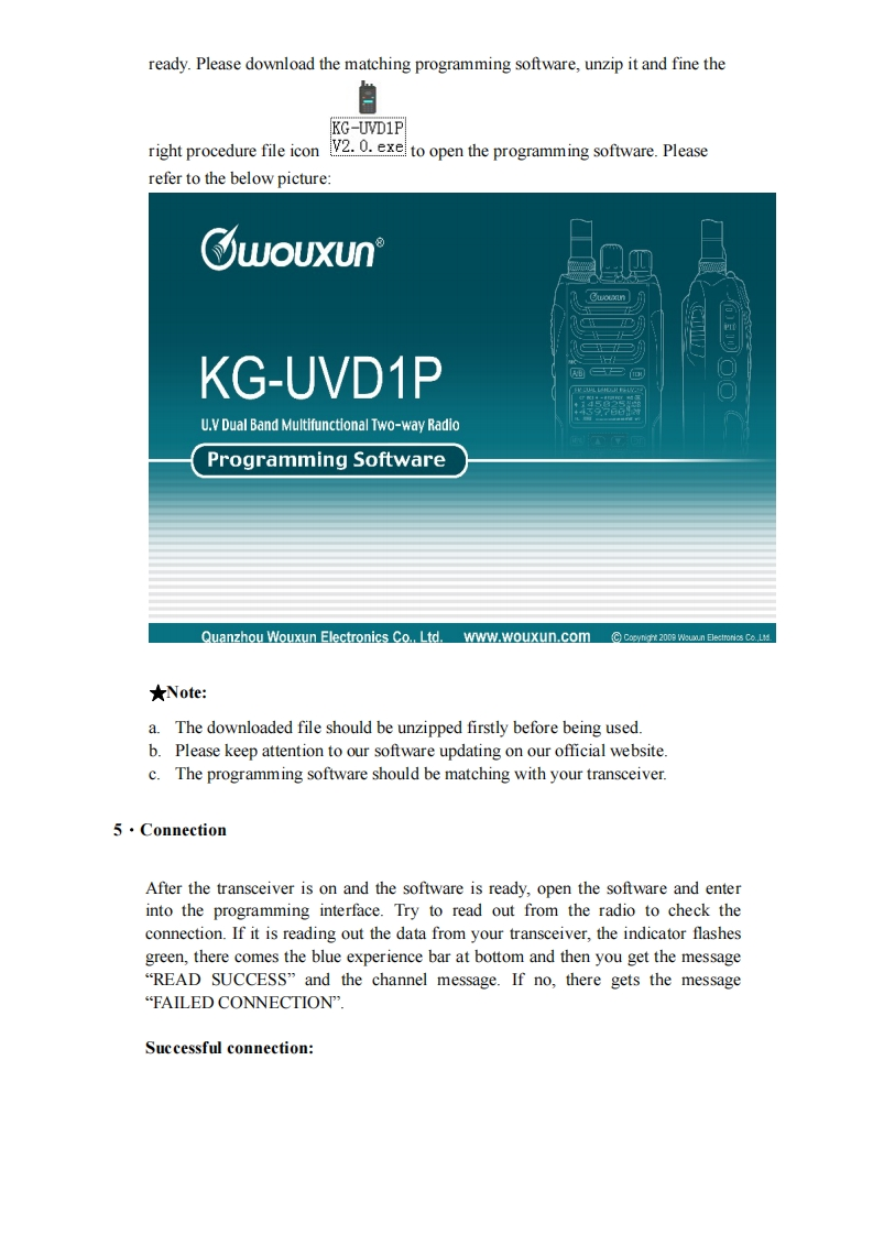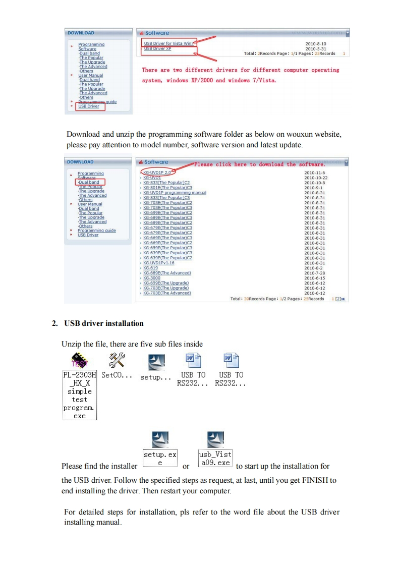 Manual for KG-UVD1P Programming◆Preparation:Equipment and accessories required(a)A KG-UVD1P transceiver.(b)A serial port programming cable,OR:(c)A USB programming cable (with USB driver.)(d)The KG-UVDIP programming software.Steps for connectionThere are some programming manual for your reference.Please read this before youstart up your first programming for wouxun KG-UVDIP series transceiver.Thismanual is still not perfect for any possible omission and any make-up information iswelcome to keep us noted.1.downloadingIf using the USB programming cable,please download the USB driver from wouxunweb address DOWNLOAD area www.wouxun.com accordingly.Once you getdownloaded,please unzip the file firstly.中义服wouXunProfessional Manufacturer of Two WayRadios!Wireless Networking SolutionsHOME ABOUT US PRODUCTS NEWS SERVICESDOWNLOADCONTACT US-Please Choose-DOWNLOADDOWNLOADSoftwareProgrammin☑KG-UVD1P 2.02010-10-8The UporadeKG-801E(The Popular)C32010-9-1The AdvancedKG-UVDIP programming manual2010-8-31KG-833(The Popular)C32010-9-31,ks-703 ElThe Popular C2010-8-31.KG-703E(The Popular)C32010-8-31KG-699E[The PopularCz2010-9-31The UporadeKG.6agECThe ponulans2010-8-31heAd小ancedKG-689ECThe2010-8.31KG-679E(The Po20109-31Download the USB driver that is compatible with your operating system.There aretwo types of drivers selectable,one is for common windows operating system,andthe other is technically for Windows Vista/Windows 7.