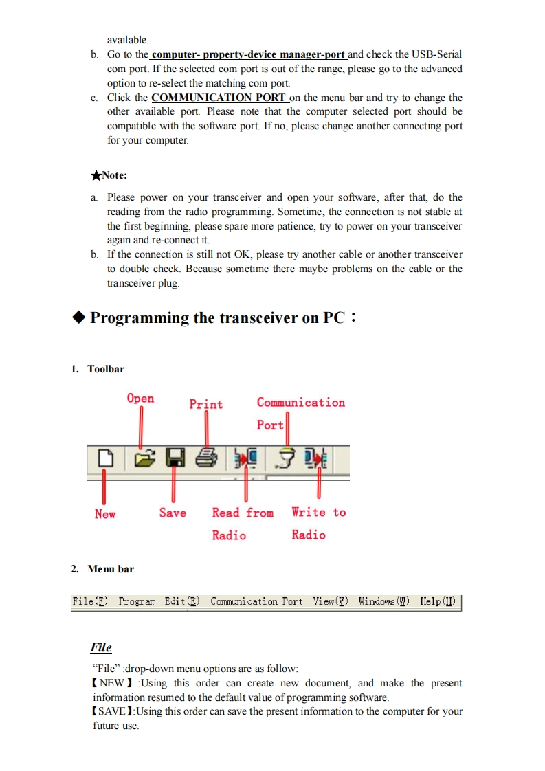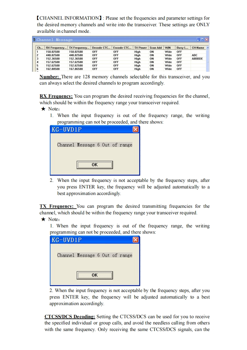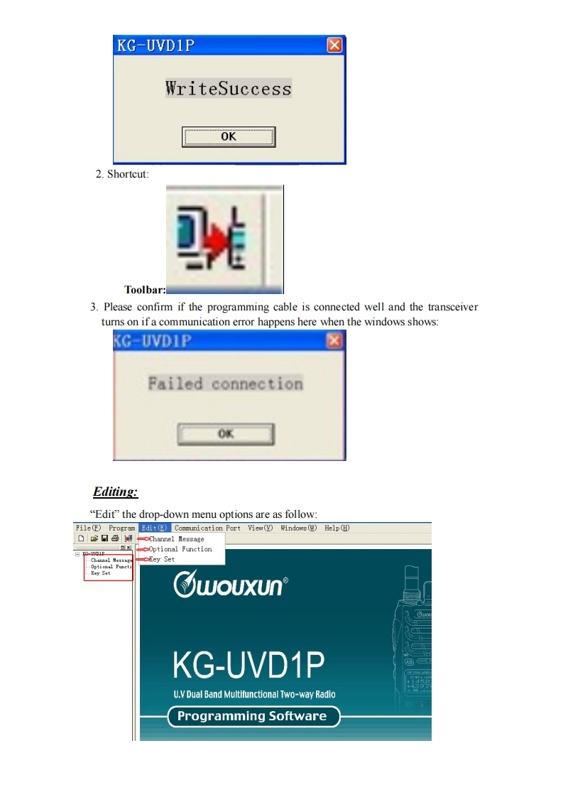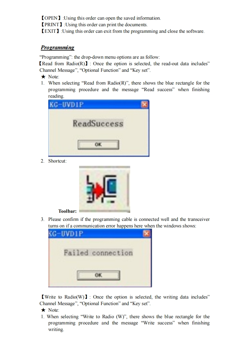 Manual for KG-UVD1P Programming◆Preparation:Equipment and accessories required(a)A KG-UVD1P transceiver.(b)A serial port programming cable,OR:(c)A USB programming cable (with USB driver.)(d)The KG-UVDIP programming software.Steps for connectionThere are some programming manual for your reference.Please read this before youstart up your first programming for wouxun KG-UVDIP series transceiver.Thismanual is still not perfect for any possible omission and any make-up information iswelcome to keep us noted.1.downloadingIf using the USB programming cable,please download the USB driver from wouxunweb address DOWNLOAD area www.wouxun.com accordingly.Once you getdownloaded,please unzip the file firstly.中义服wouXunProfessional Manufacturer of Two WayRadios!Wireless Networking SolutionsHOME ABOUT US PRODUCTS NEWS SERVICESDOWNLOADCONTACT US-Please Choose-DOWNLOADDOWNLOADSoftwareProgrammin☑KG-UVD1P 2.02010-10-8The UporadeKG-801E(The Popular)C32010-9-1The AdvancedKG-UVDIP programming manual2010-8-31KG-833(The Popular)C32010-9-31,ks-703 ElThe Popular C2010-8-31.KG-703E(The Popular)C32010-8-31KG-699E[The PopularCz2010-9-31The UporadeKG.6agECThe ponulans2010-8-31heAd小ancedKG-689ECThe2010-8.31KG-679E(The Po20109-31Download the USB driver that is compatible with your operating system.There aretwo types of drivers selectable,one is for common windows operating system,andthe other is technically for Windows Vista/Windows 7.
